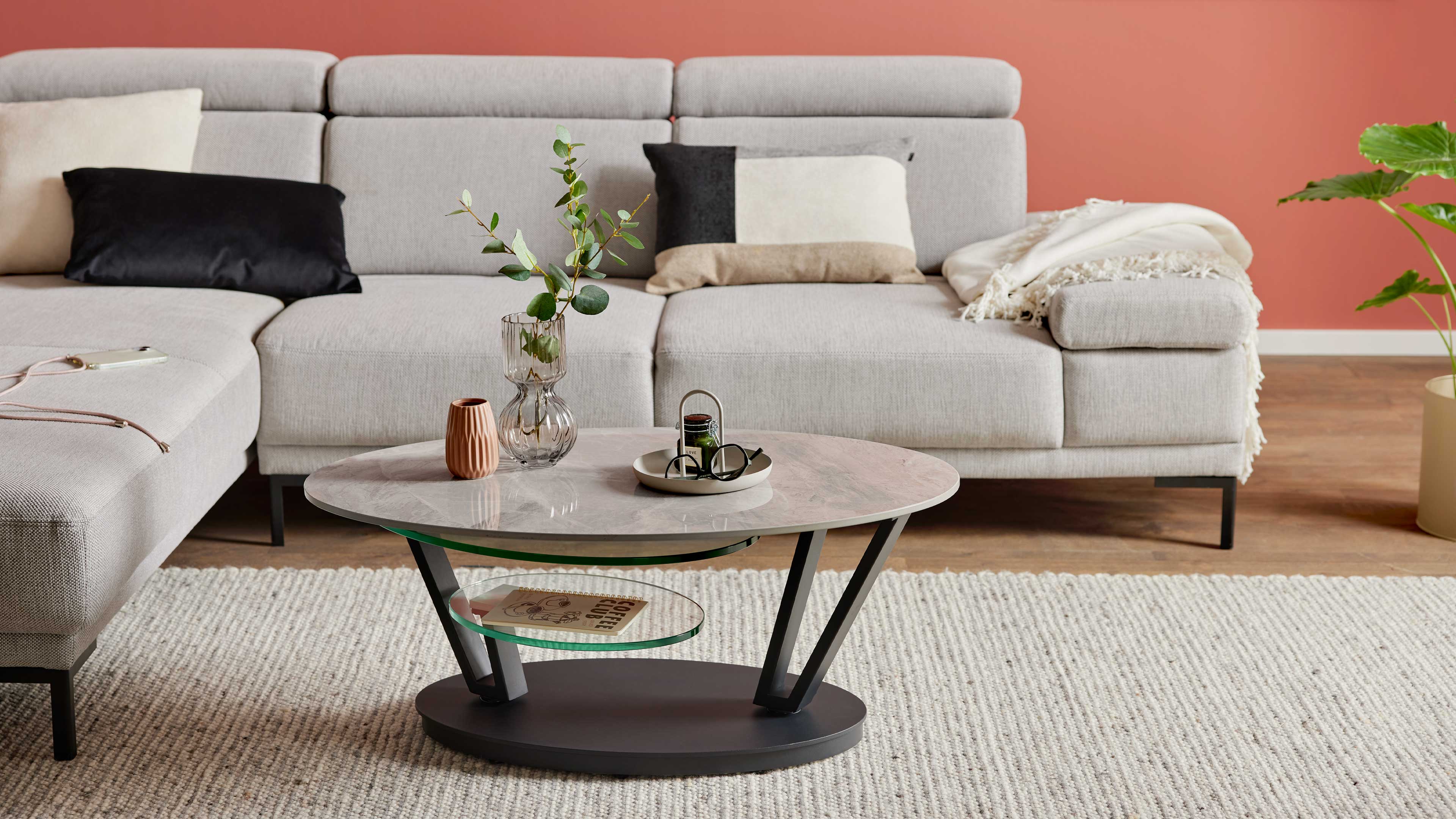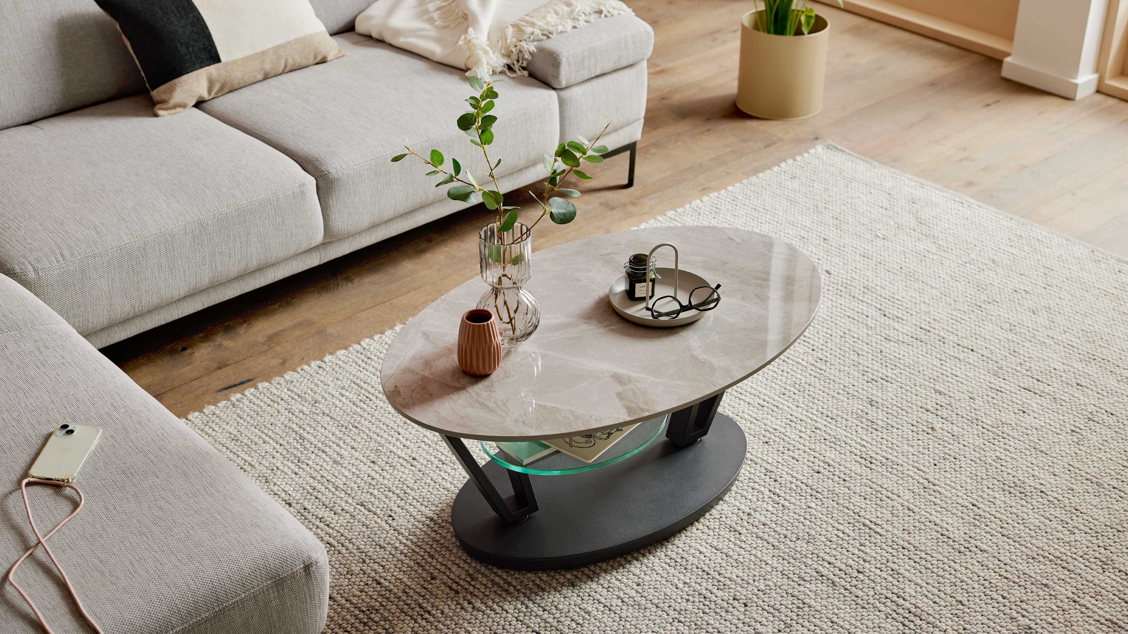 Der Sofatisch aus der Interliving Couchtisch Serie 6230 verbindet modernes Design mit innovativer Funktionalität. Die travertinfarbene Keramikplatte in Kombination mit edlen Klarglasplatten sorgt für eine elegante, zeitlose Optik. Das mattschwarz pulverbeschichtete Stahlgestell setzt dazu einen markanten Kontrast und verleiht dem Wohnzimmertisch eine stilvolle Leichtigkeit.
