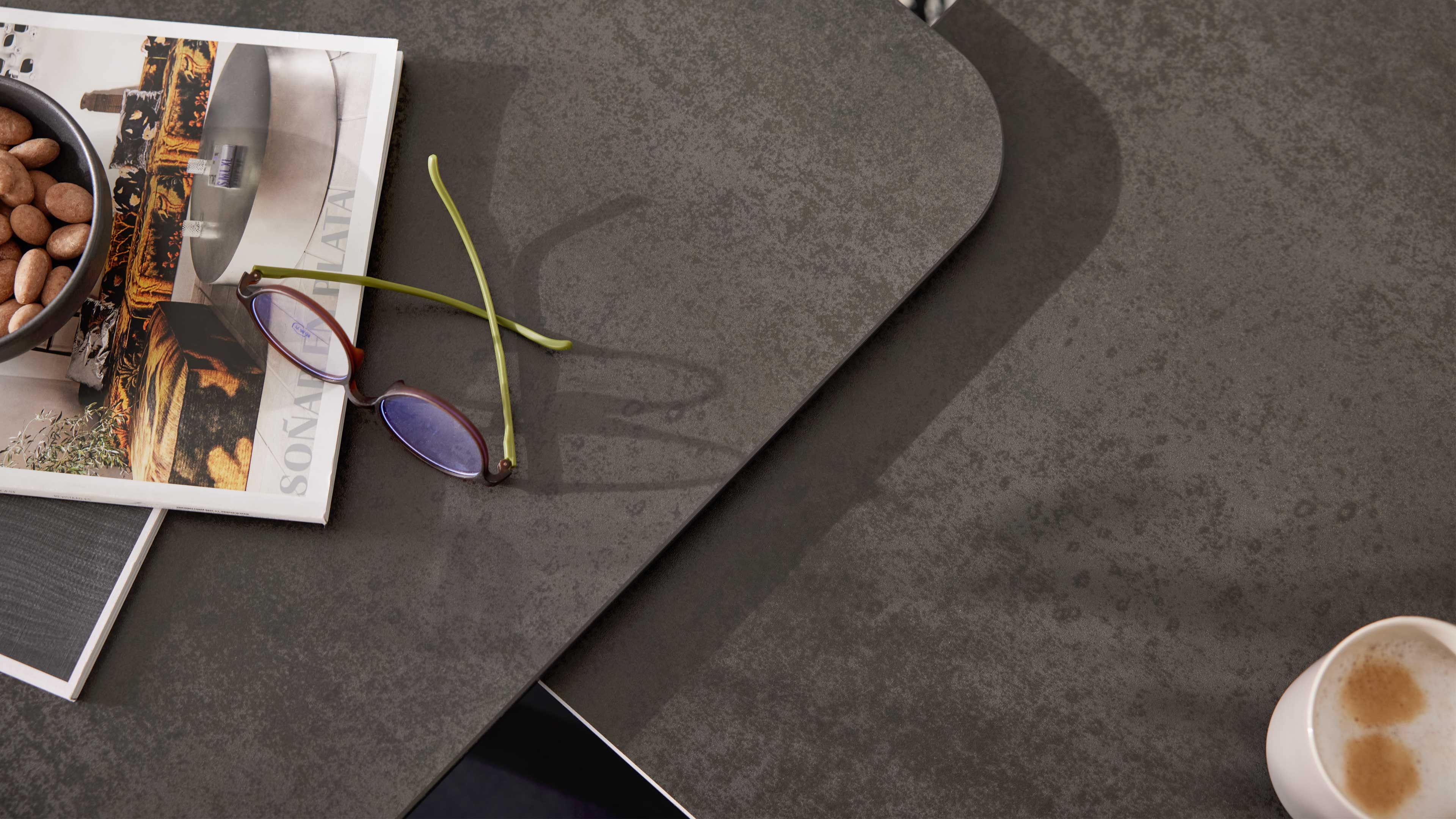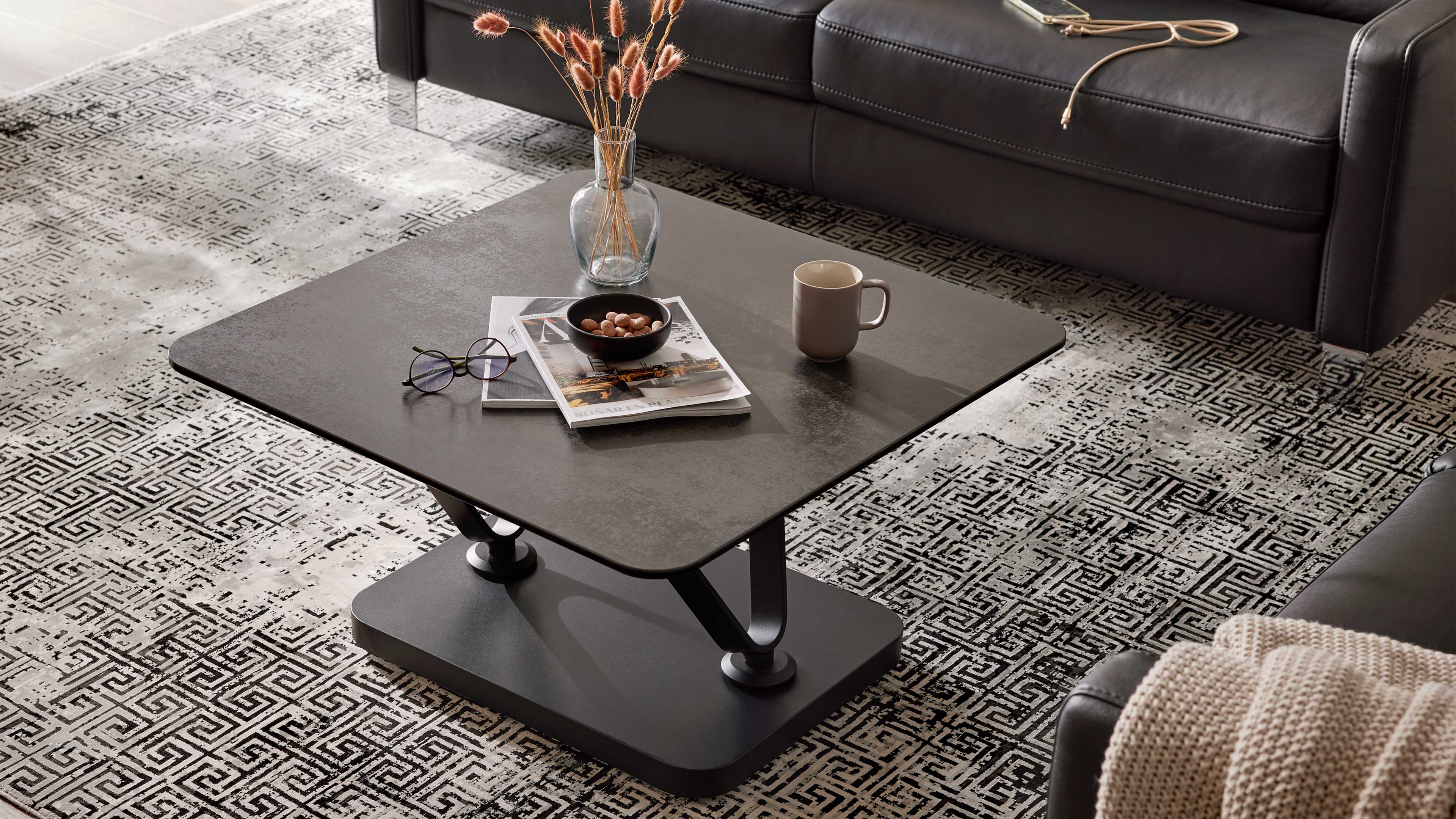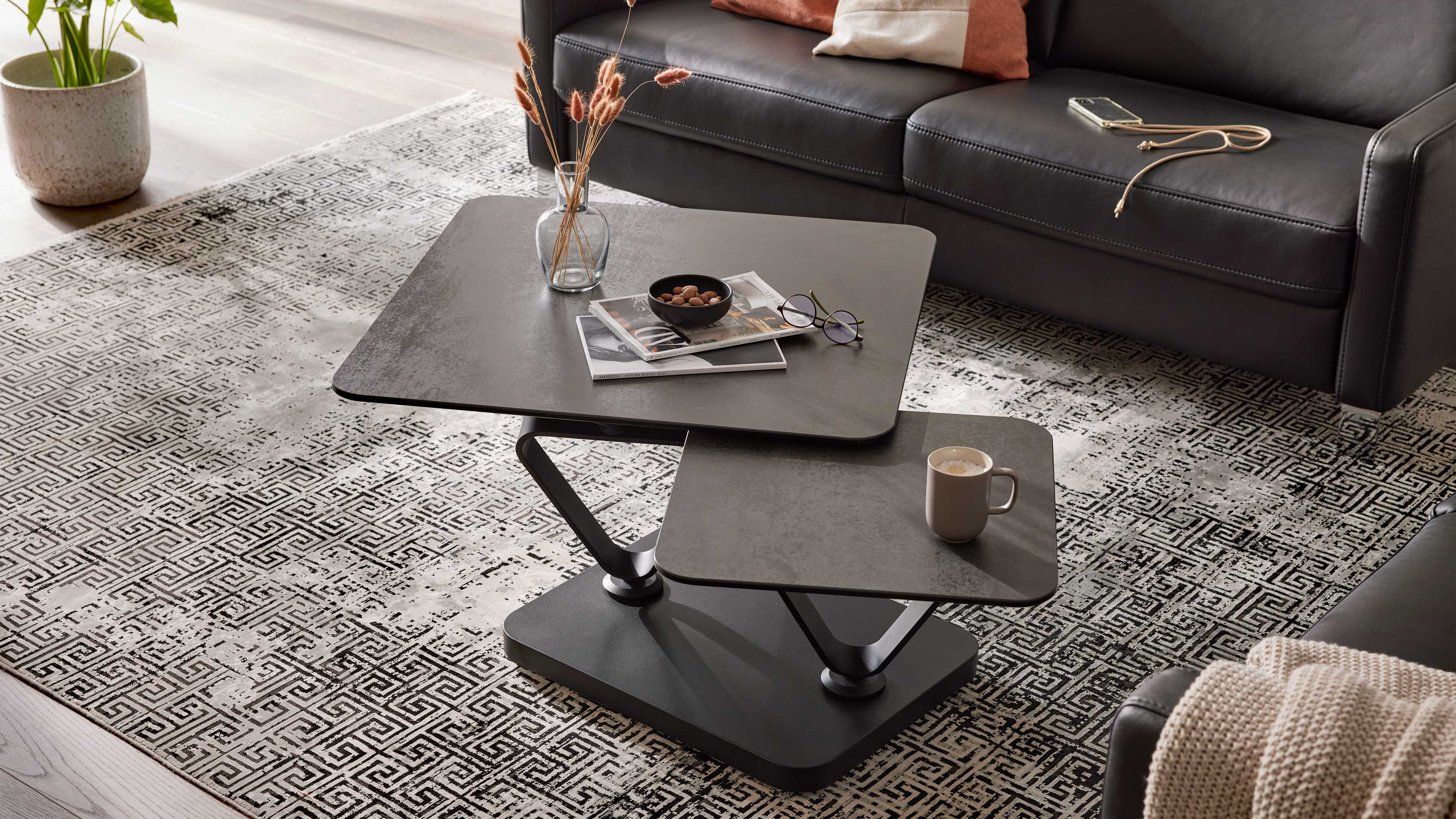 Der Sofatisch aus der Interliving Couchtisch Serie 6232 vereint modernes Design mit innovativer Funktion. Die titanfarbenen Keramikplatten verleihen dem Couchtisch eine elegante, urbane Ausstrahlung, während das mattschwarz pulverbeschichtete Stahlgestell einen markanten Kontrast setzt und für eine klare Linienführung sorgt. So wird der Wohnzimmertisch zum stilvollen Mittelpunkt deiner Sitzgruppe.