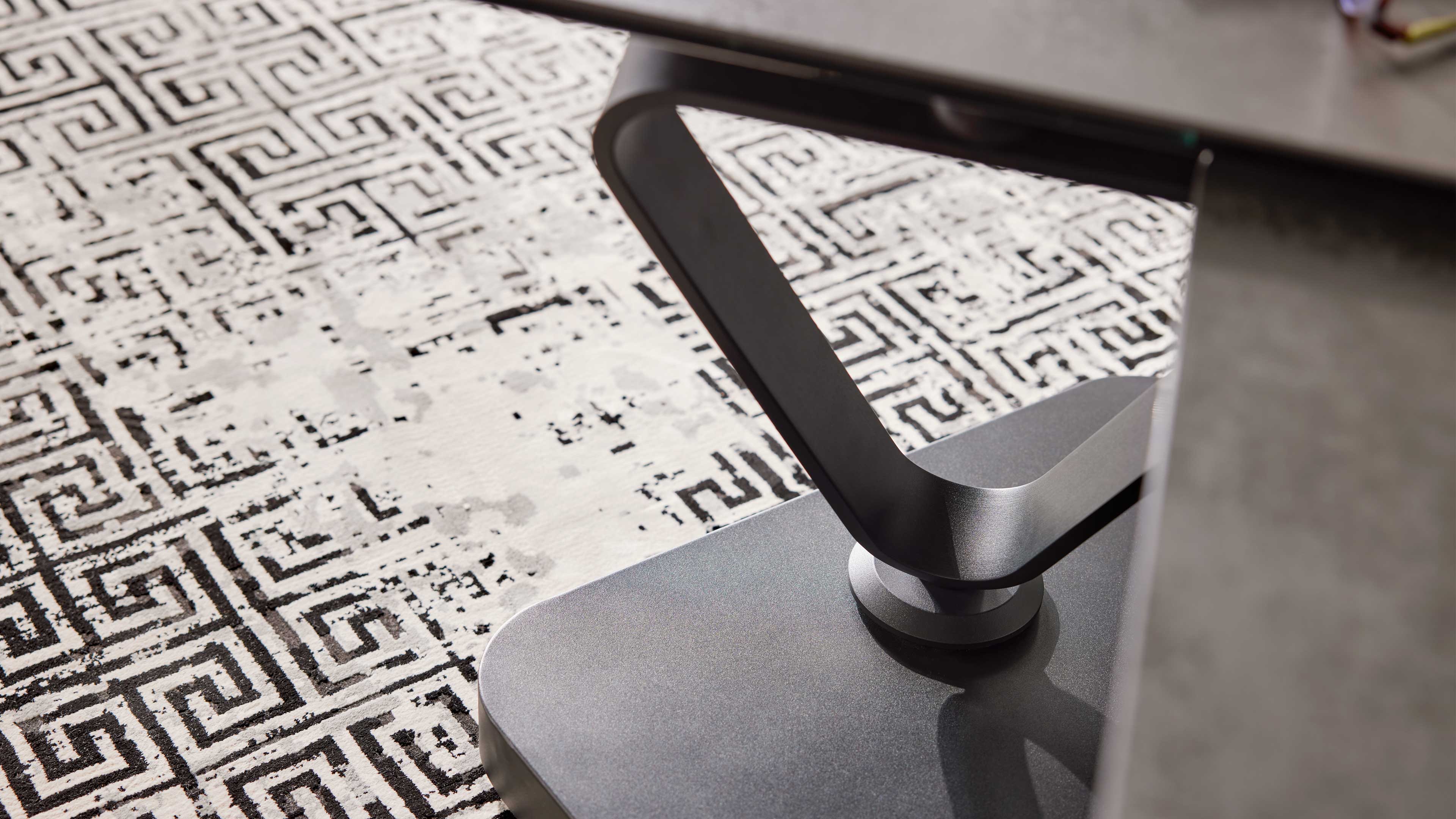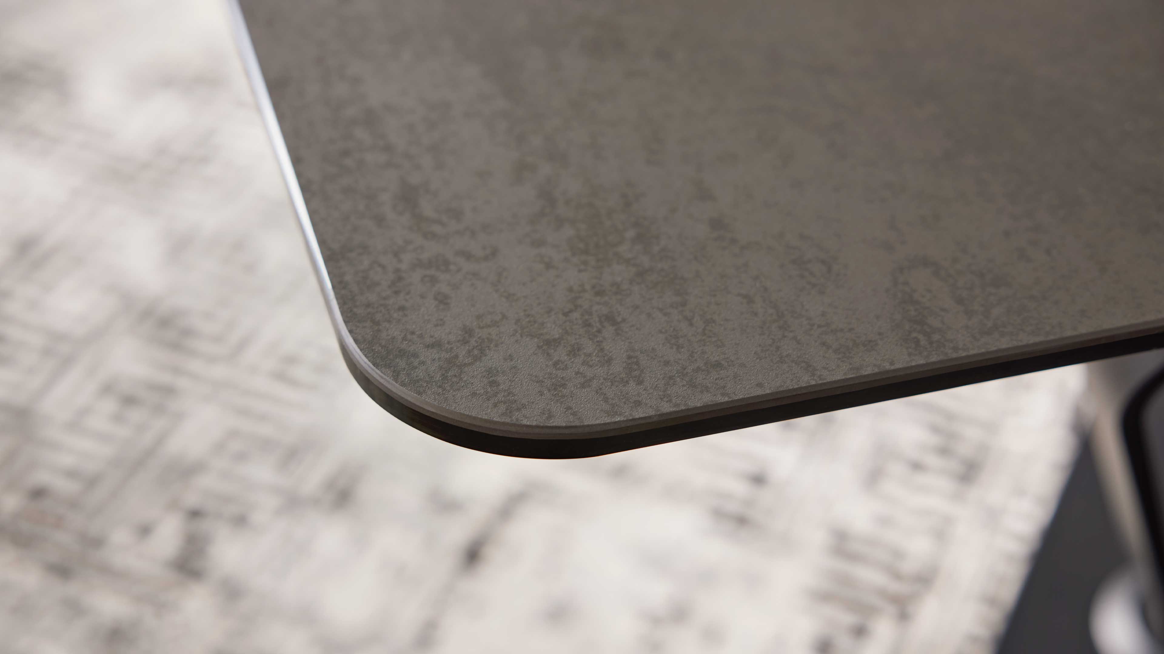 Die Kombination aus Keramik und Sicherheitsglas sorgt für eine robuste, pflegeleichte Oberfläche mit hochwertiger Haptik. Das mattschwarz pulverbeschichtete Stahlgestell garantiert Stabilität und unterstreicht das moderne Design.