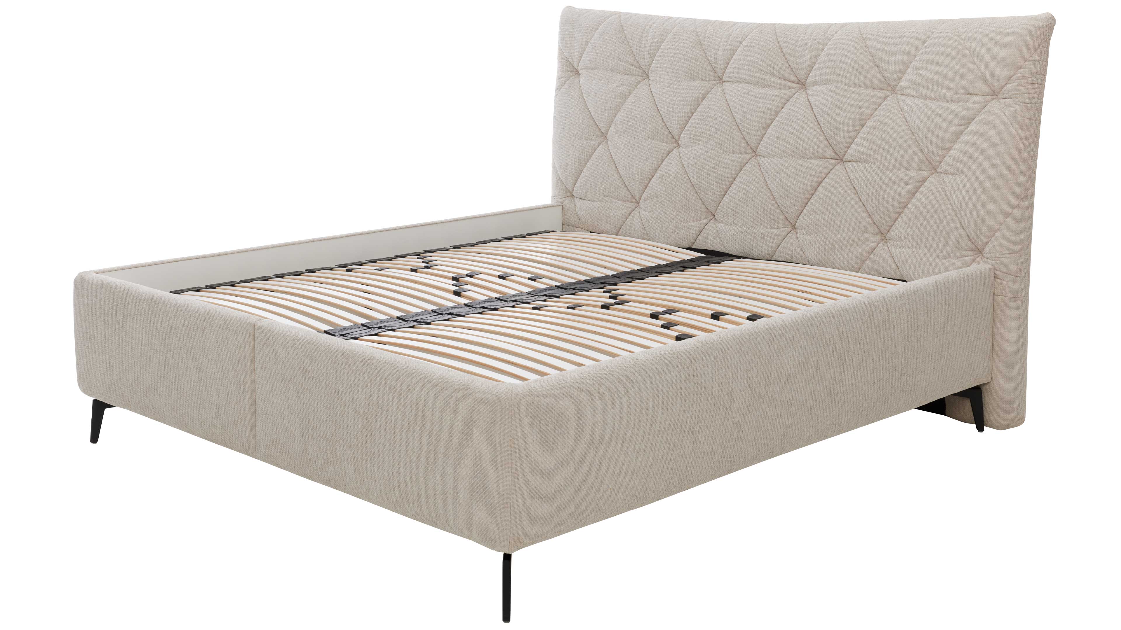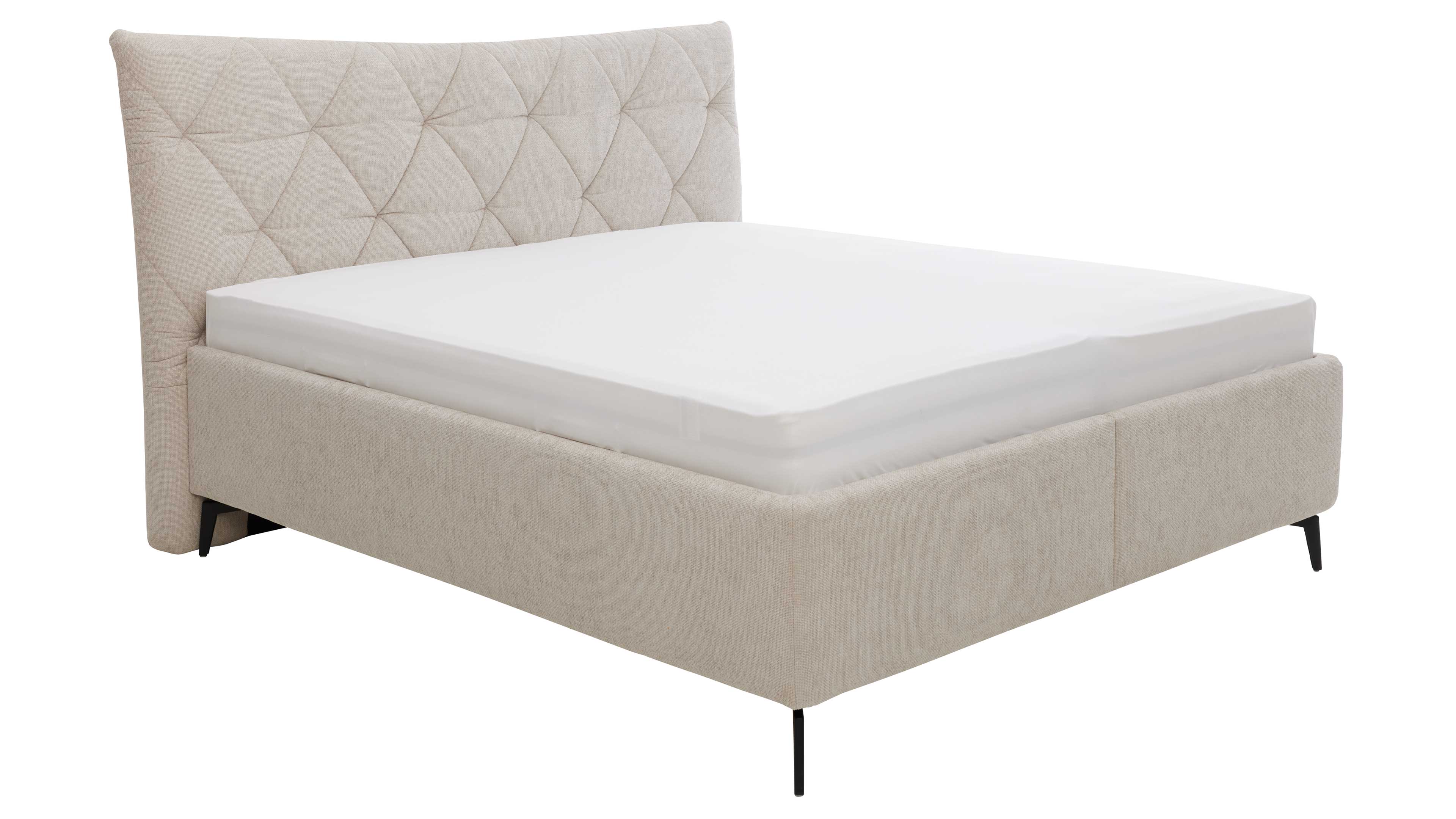 Elegantes Polsterbett in hellem Stoff mit gestepptem Kopfteil und filigranen Metallfüßen