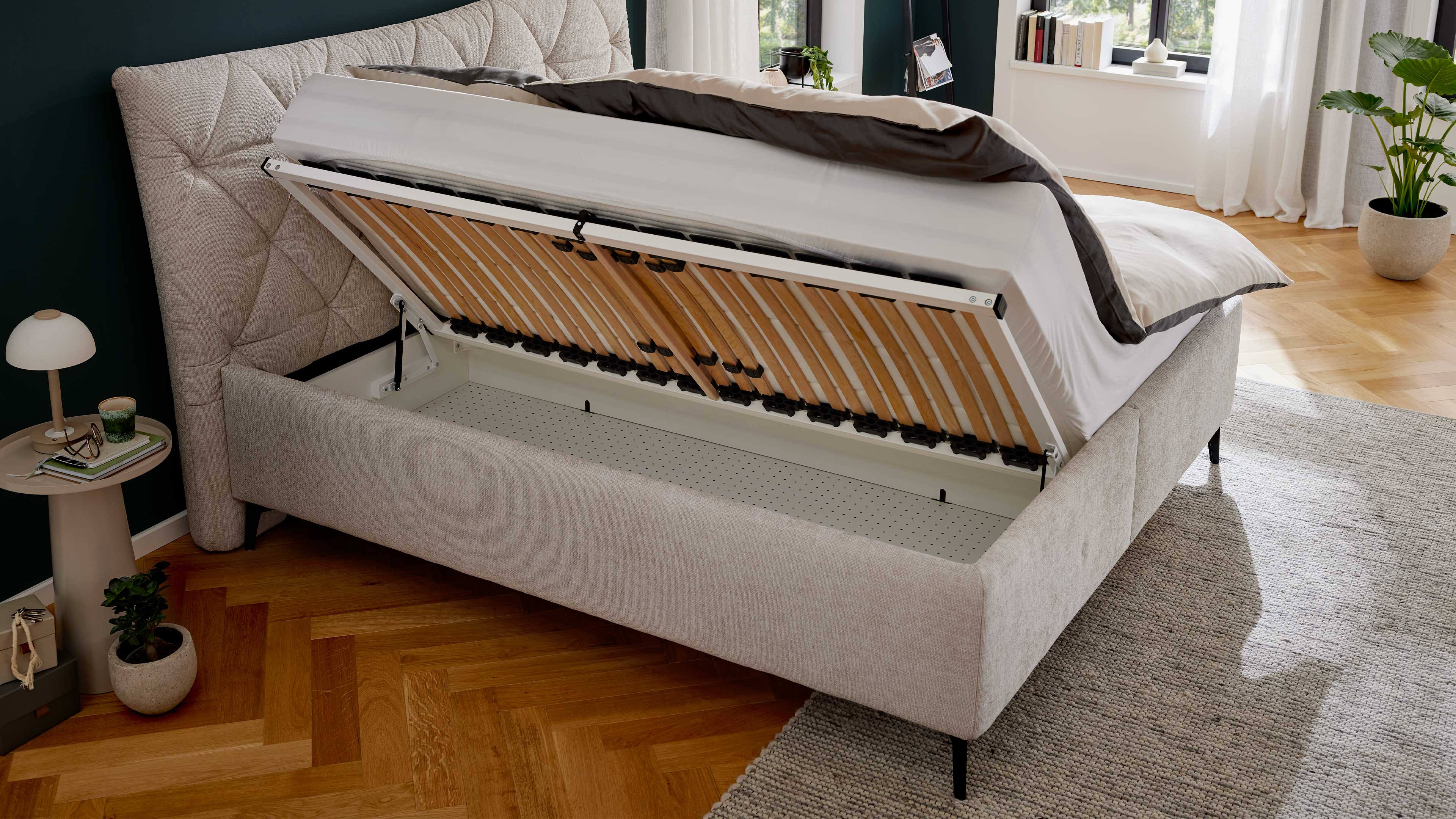 Die integrierten Bettkästen sind ideal für saisonale Textilien und sorgen für mehr Ordnung in deinem Schlafzimmer.