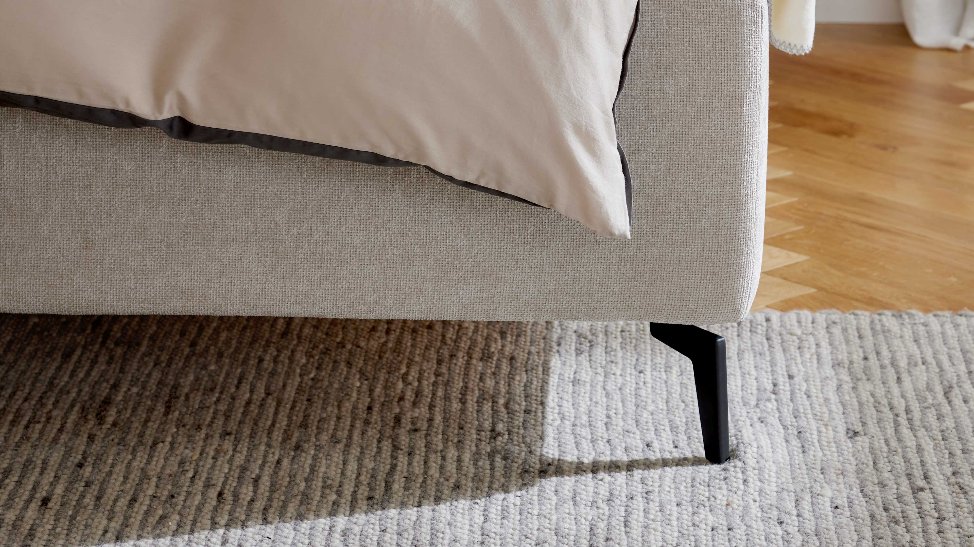 Die Kombination aus anthrazitfarbenem Bezug und schwarzen Holzfüßen sorgt für eine moderne, ruhige Optik in deinem Schlafzimmer.