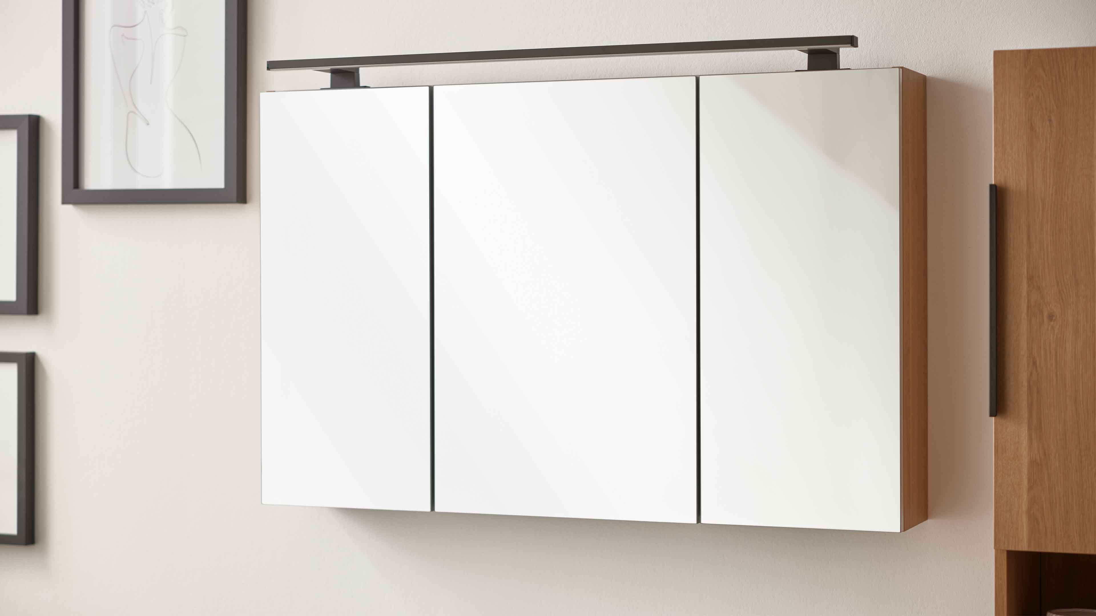 Der Spiegelschrank bietet mit drei Spiegeltüren mit Schließdämpfung, zwei Mittelwänden und sechs höhenverstellbaren Glasfachböden jede Menge Platz für alles, was du täglich brauchst. Das integrierte Schalter-Steckdosenelement inklusive LED-Converter mit 30 Watt ist die optimale Vorbereitung für ergänzende Beleuchtung. Die schwarzen Spiegelschrankgriffe runden das harmonische Gesamtbild ab. Maße: ca. 100 x 64 x 15 cm (B/LxHxT).