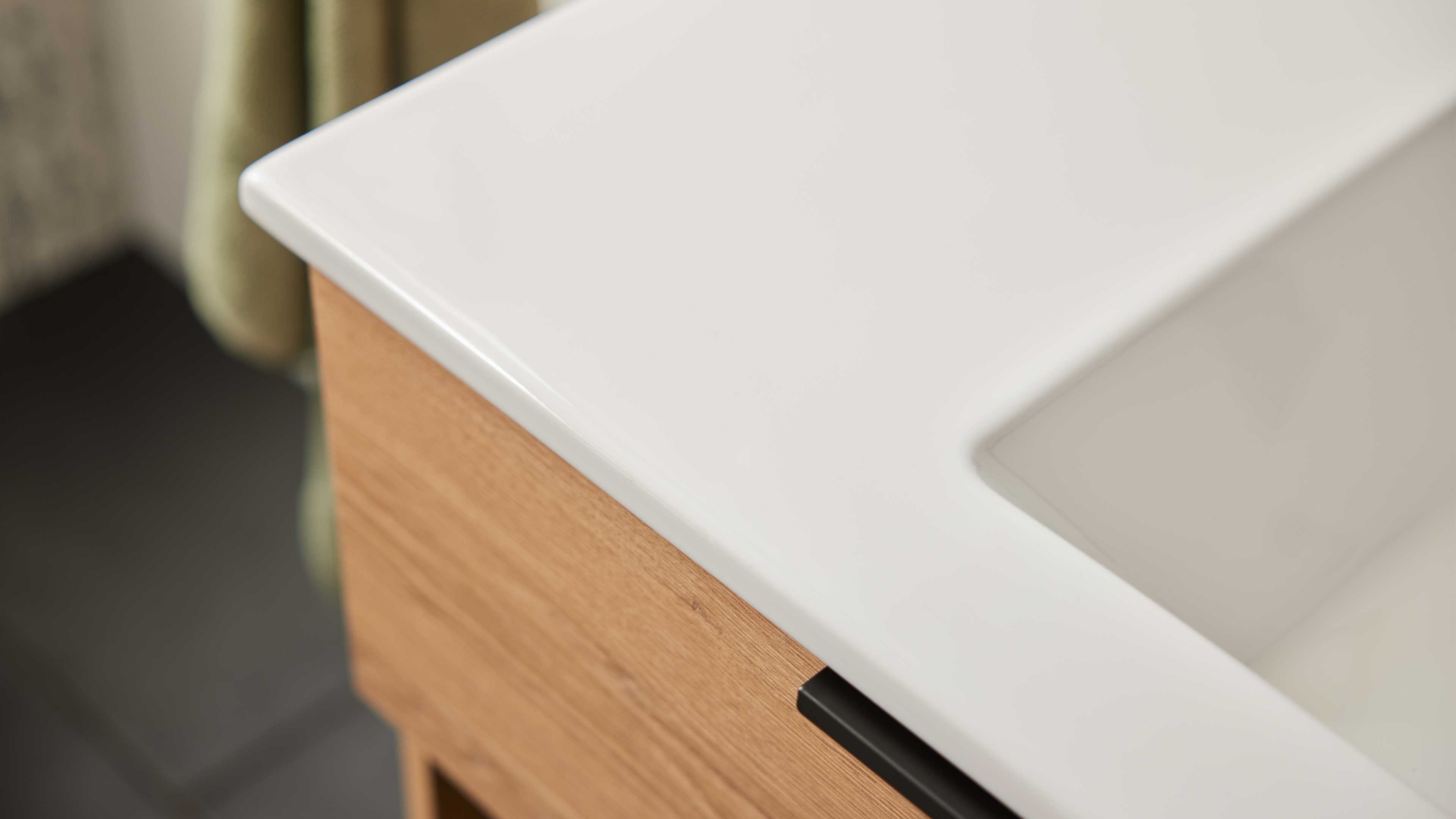 Die Melaminfronten mit ABS-Kanten sind besonders robust: kratzfest, stoßfest, wasserabweisend, lichtbeständig und pflegeleicht – ideal, wenn du langlebige Badmöbel suchst, die ihren schönen Look auch im Alltag behalten.