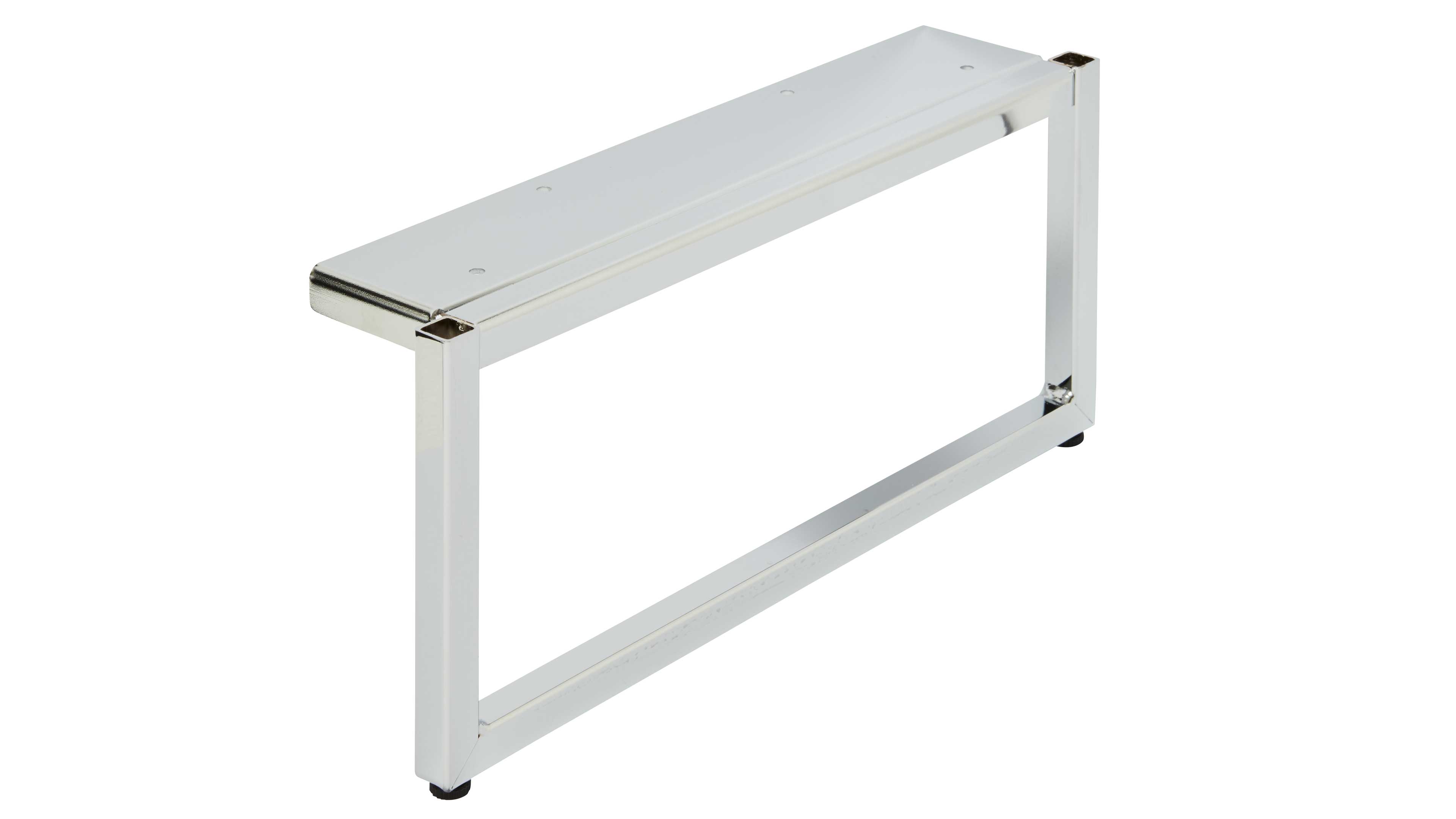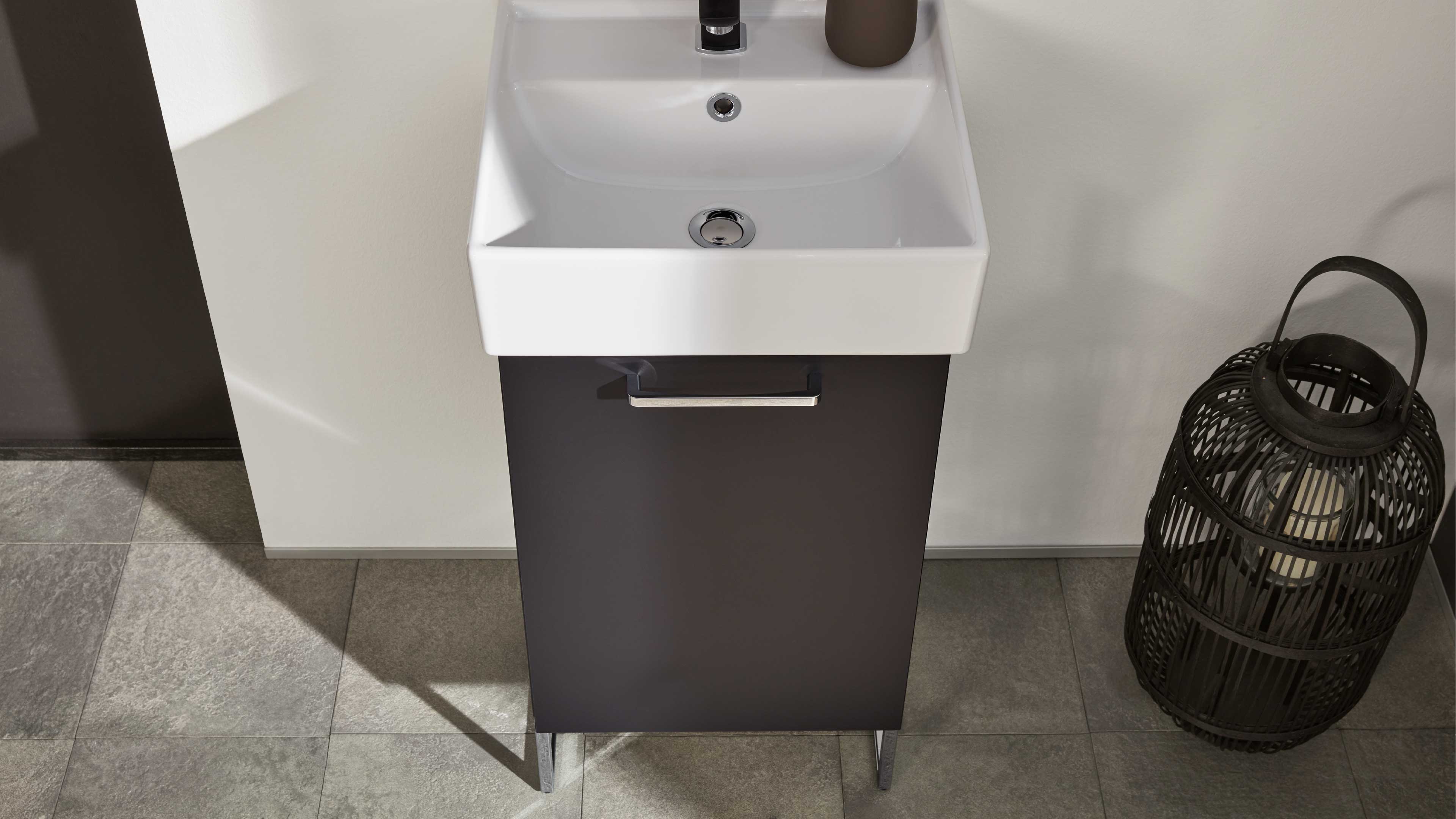Perfekt dazu: der Waschtischunterschrank (Typ 2853) mit Innenblende – eine Tür mit Schließdämpfung und ein höhenverstellbarer Einlegeboden sorgen für leises Schließen und flexible Ordnung. Die Maße: ca. 40 x 58 x 35 cm (BxHxT). Den Abluss biden zwei glänzend verchromte Sockelkufen (Typ 3342) aus Stahl.