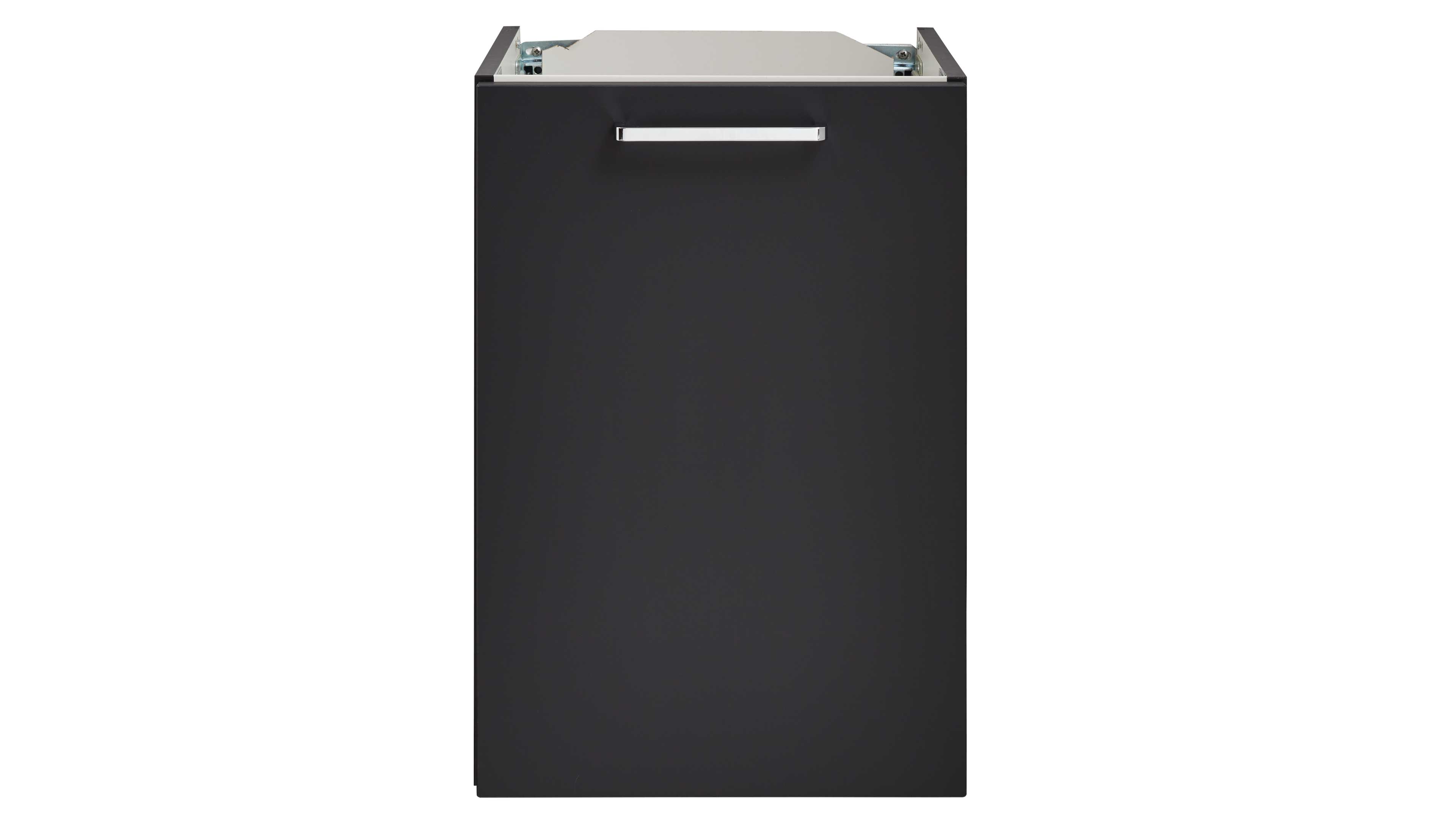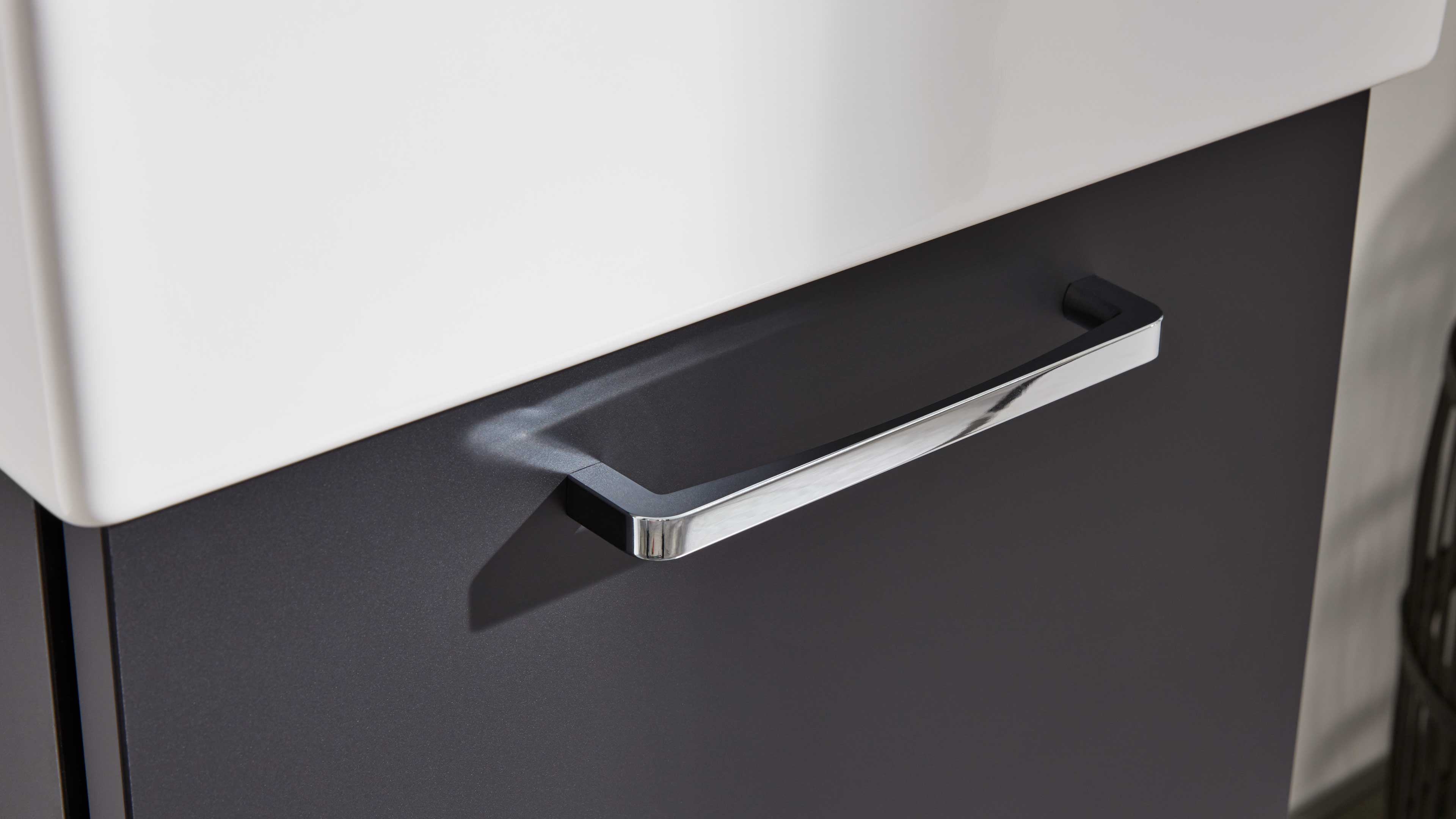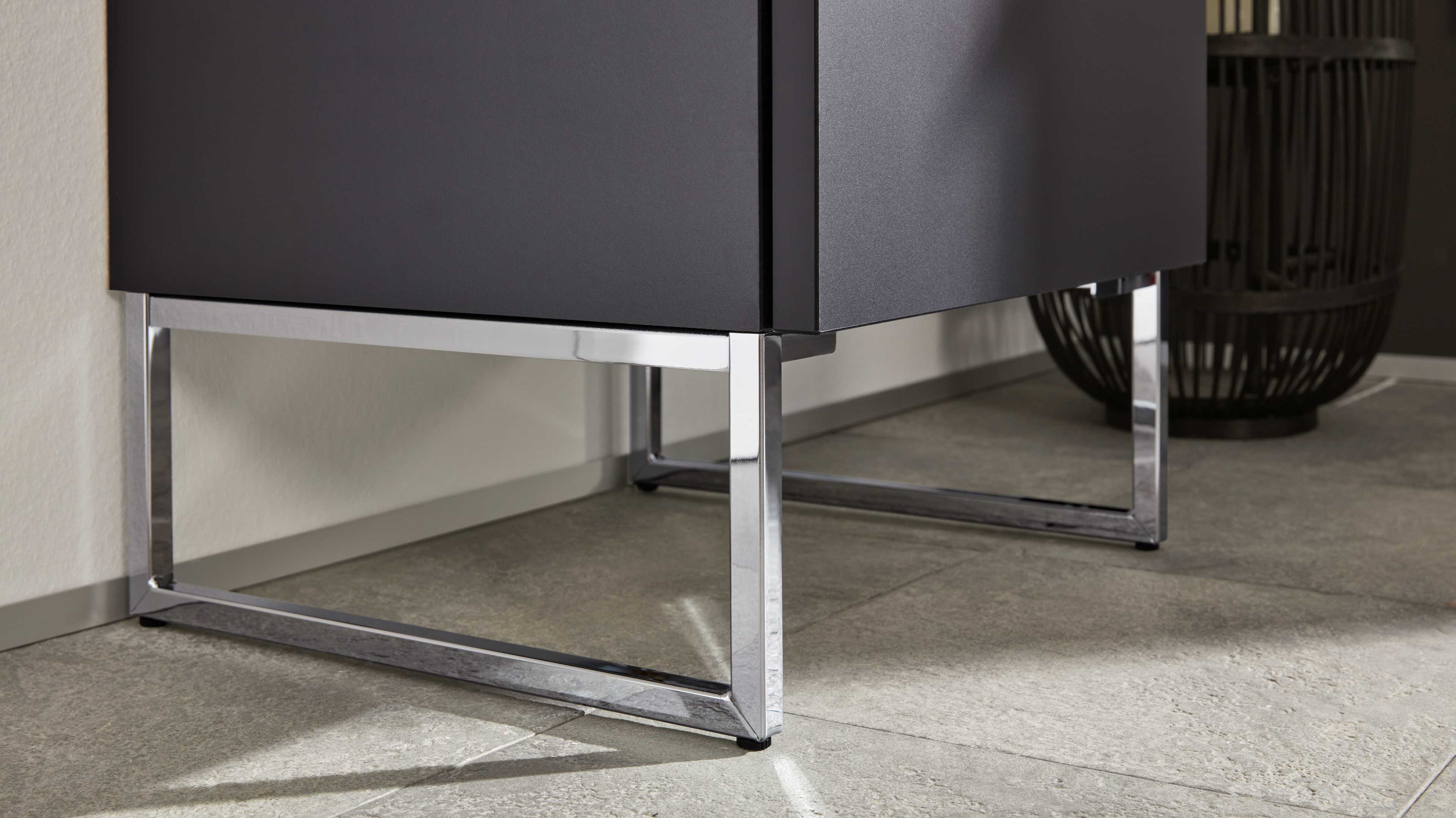 Die Interliving Bad Serie 7961 bringt dir einen modernen, edlen Waschplatz ins Bad: ultramatte graphitschwarze Lacklaminatfront, schwarzer Korpus, glänzender Chromgriff und Metallkufen – ein Look, der schlicht und hochwertig zugleich wirkt.