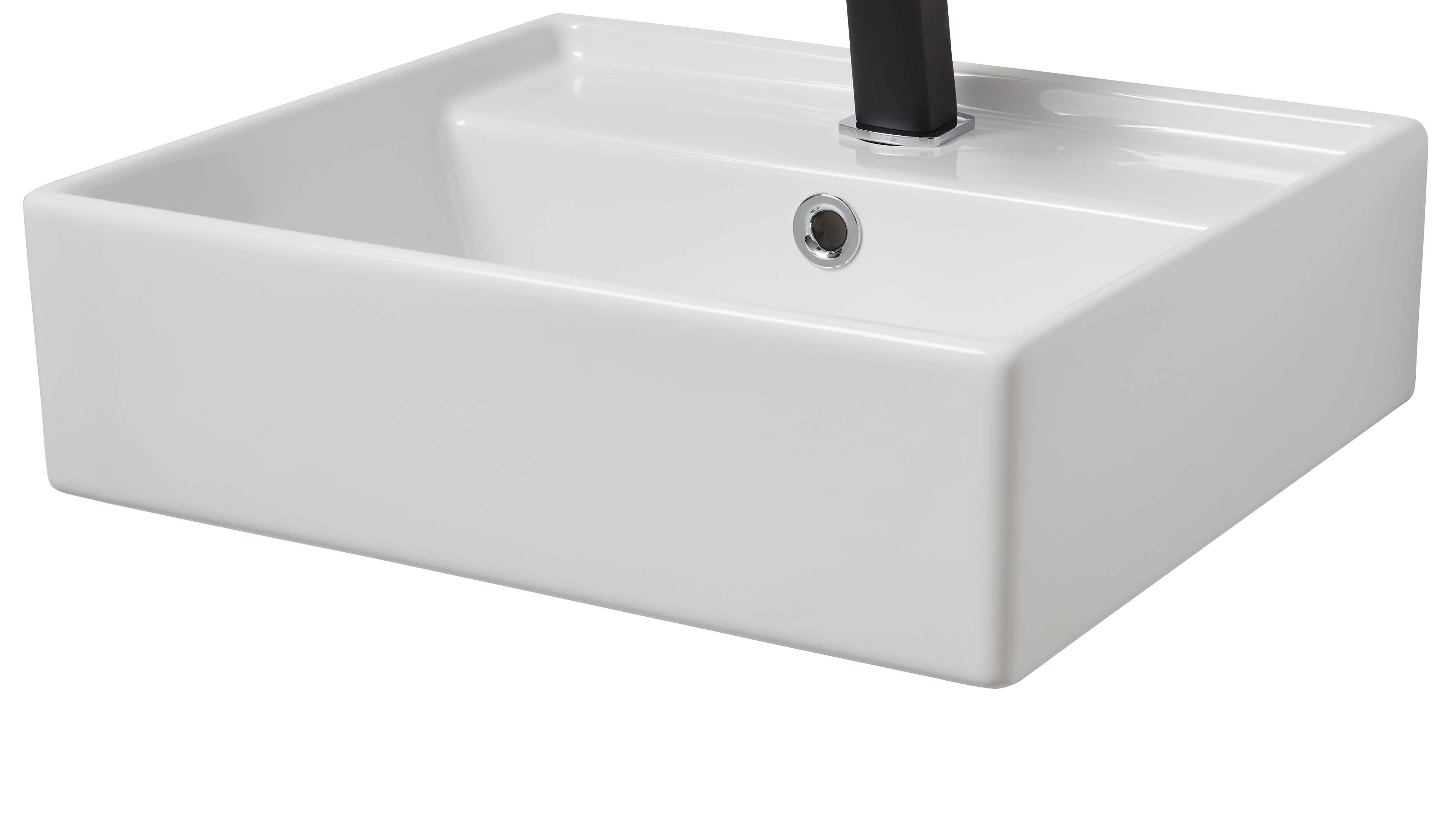 Herzstück ist der weiße Keramik-Möbelwaschtisch (typ 87730) mit Hahnlochbohrung und Überlauf – pflegeleicht, robust und formschön. Die Maße liegen bei ca. 43 x 19 x 39 cm (BxHxT). Armatur und Siphon erhältst du auf Wunsch gegen Mehrpreis.