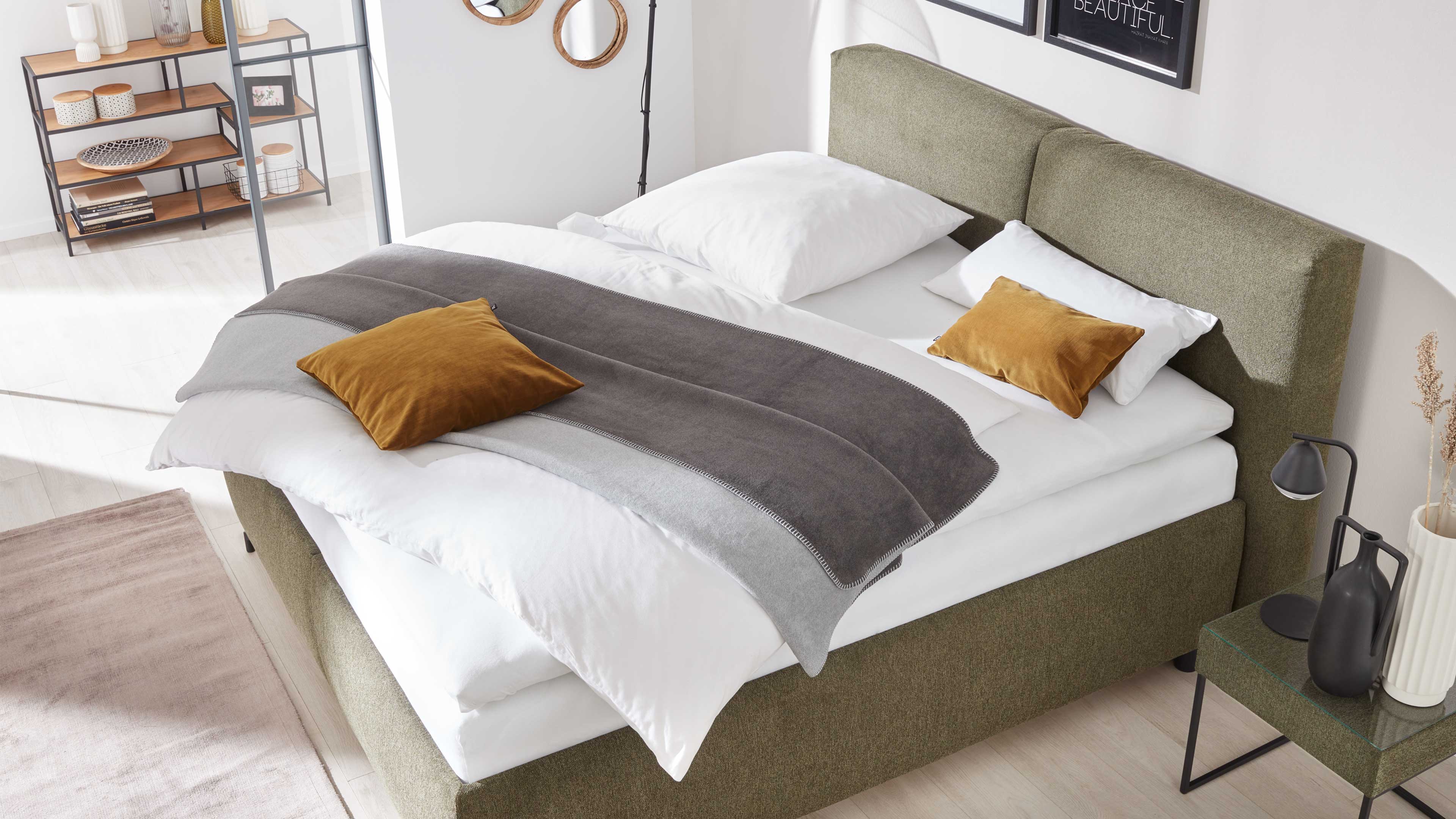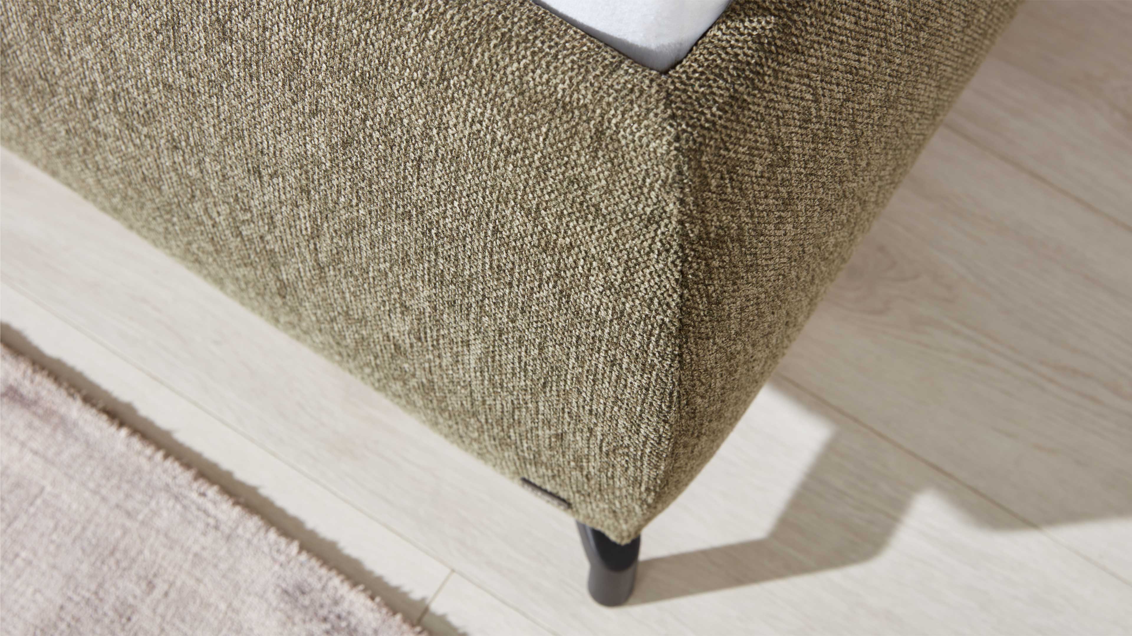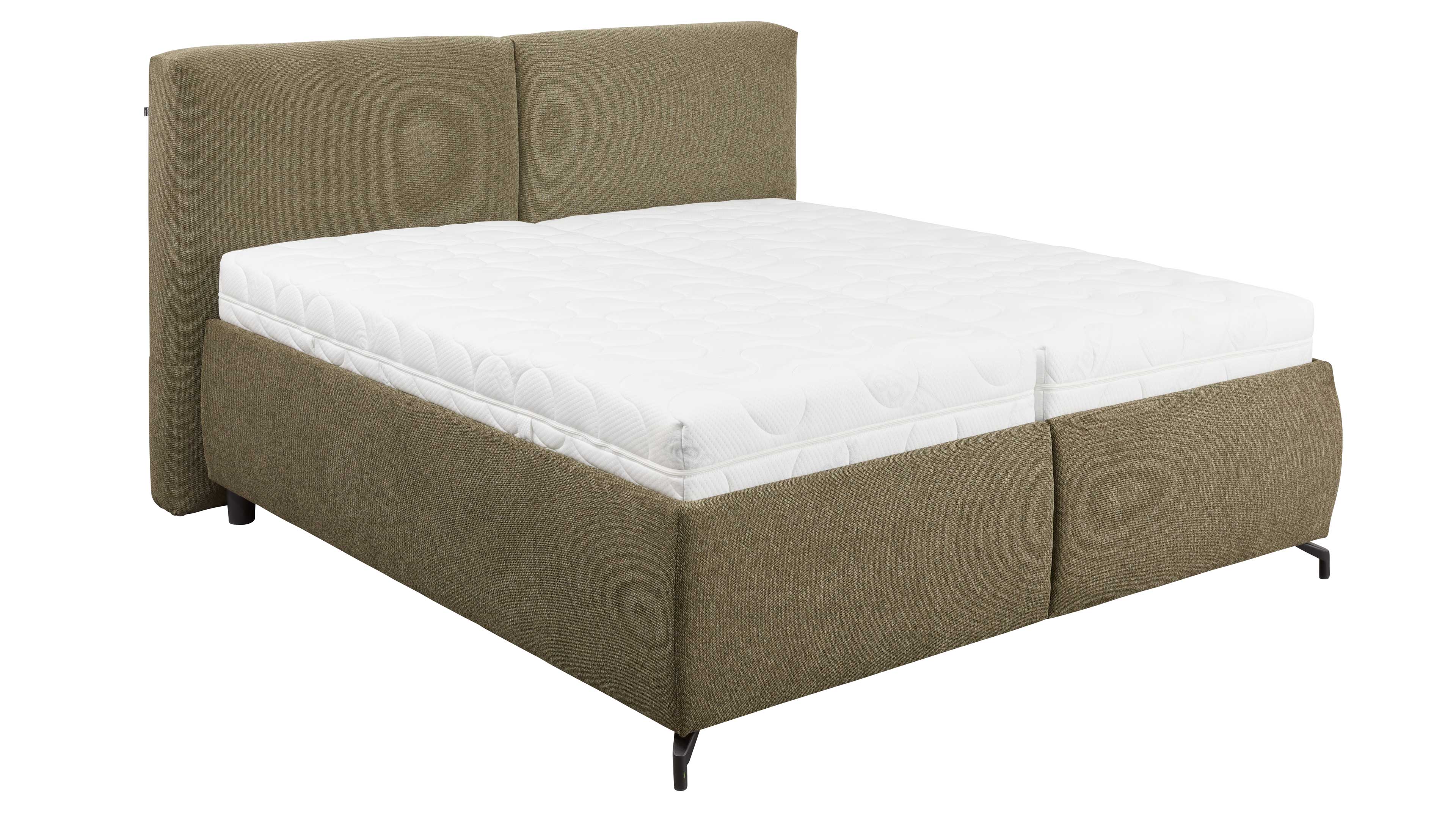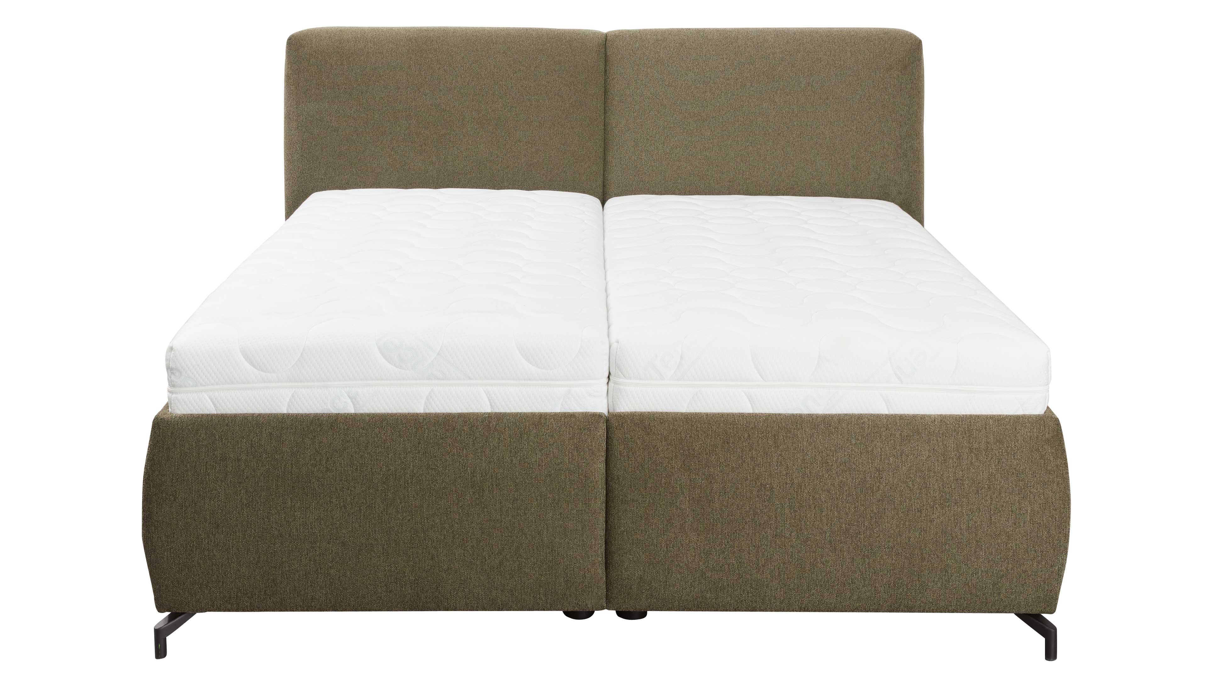Polsterbett in Olivgrün mit schlichter Zweiteilung im Kopfteil