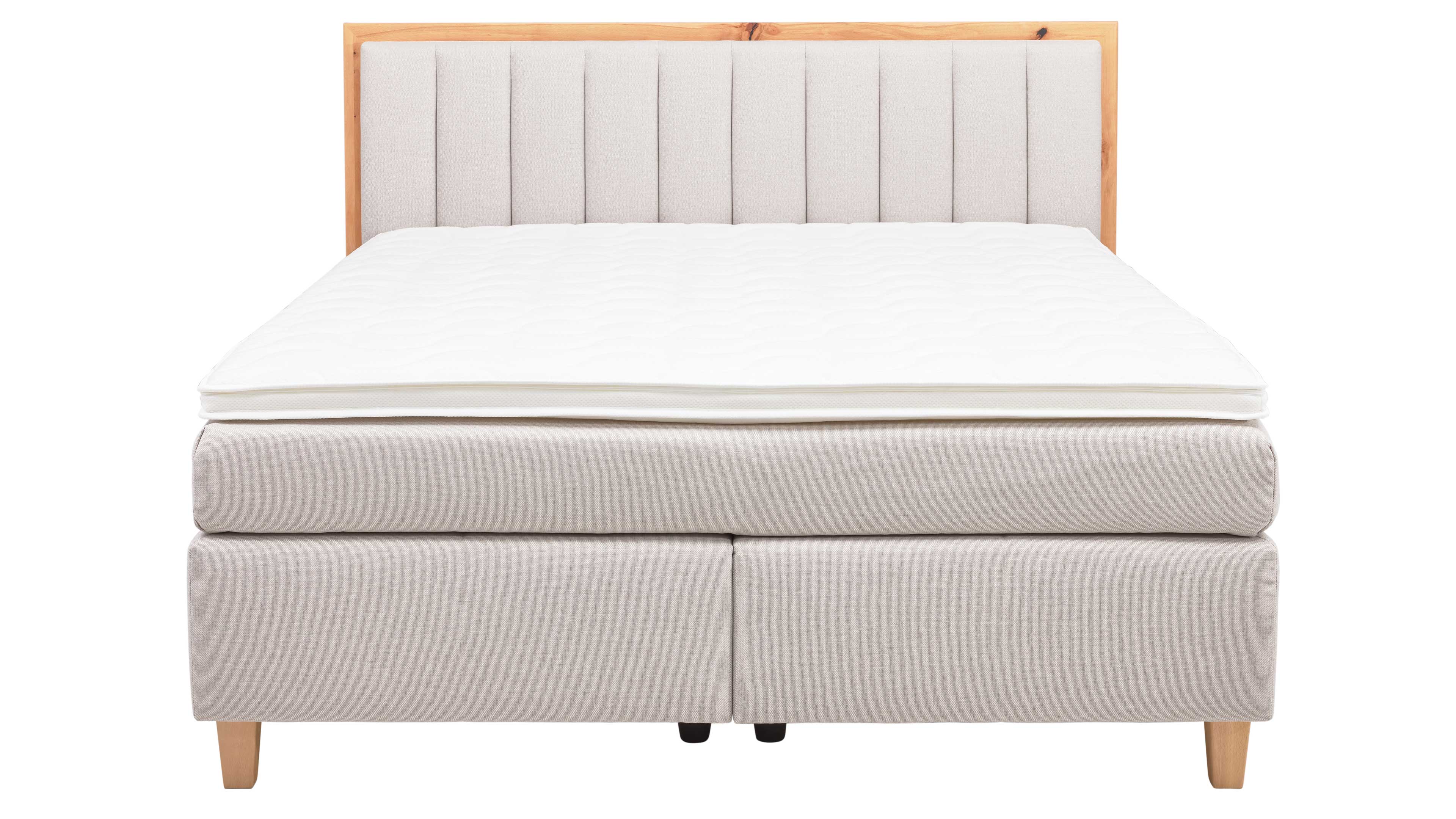 Boxspringbett in hellem Stoff mit Massivholz-Akzenten