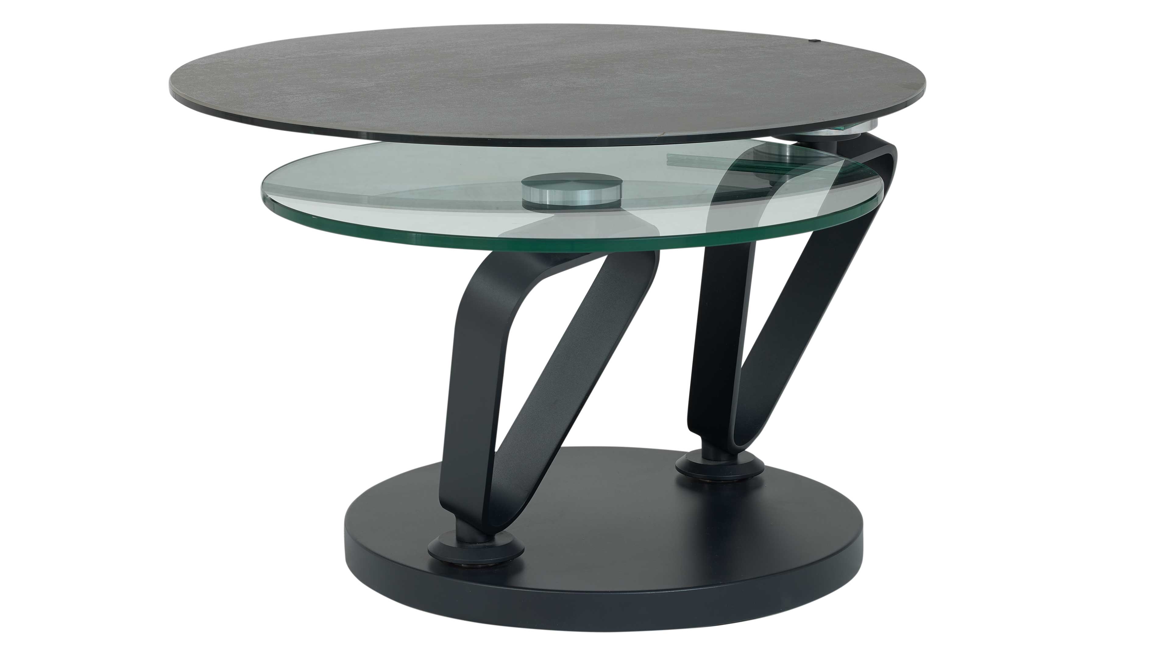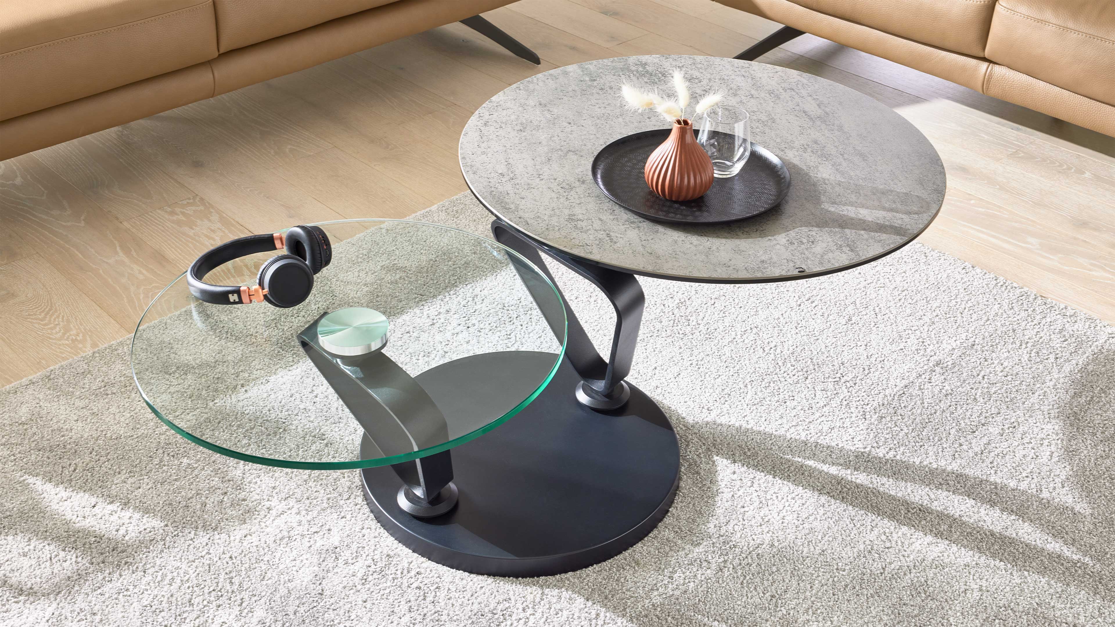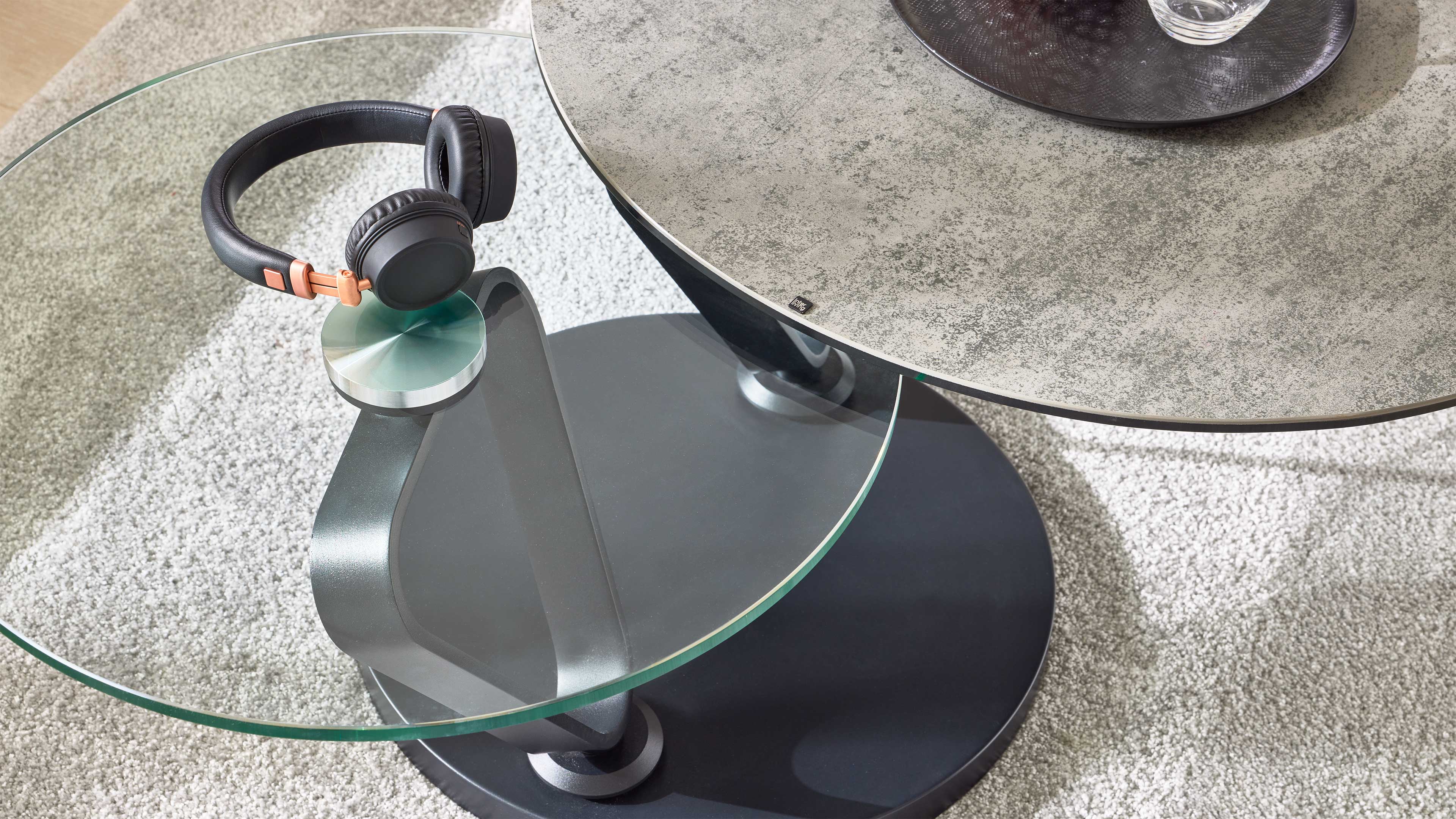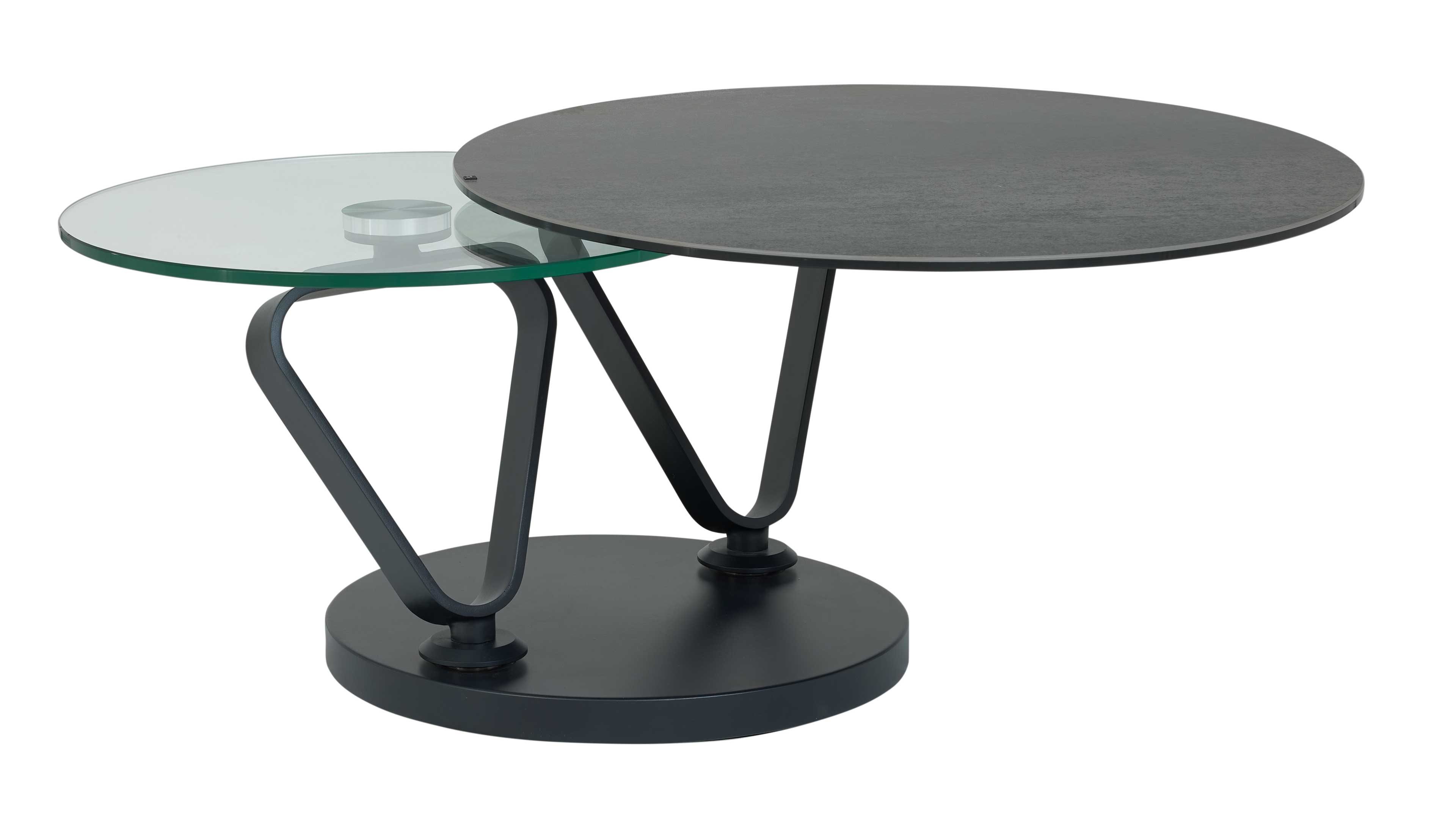 Couchtisch mit runder Keramik- und Glasplatte auf schwenkbaren Metallarmen