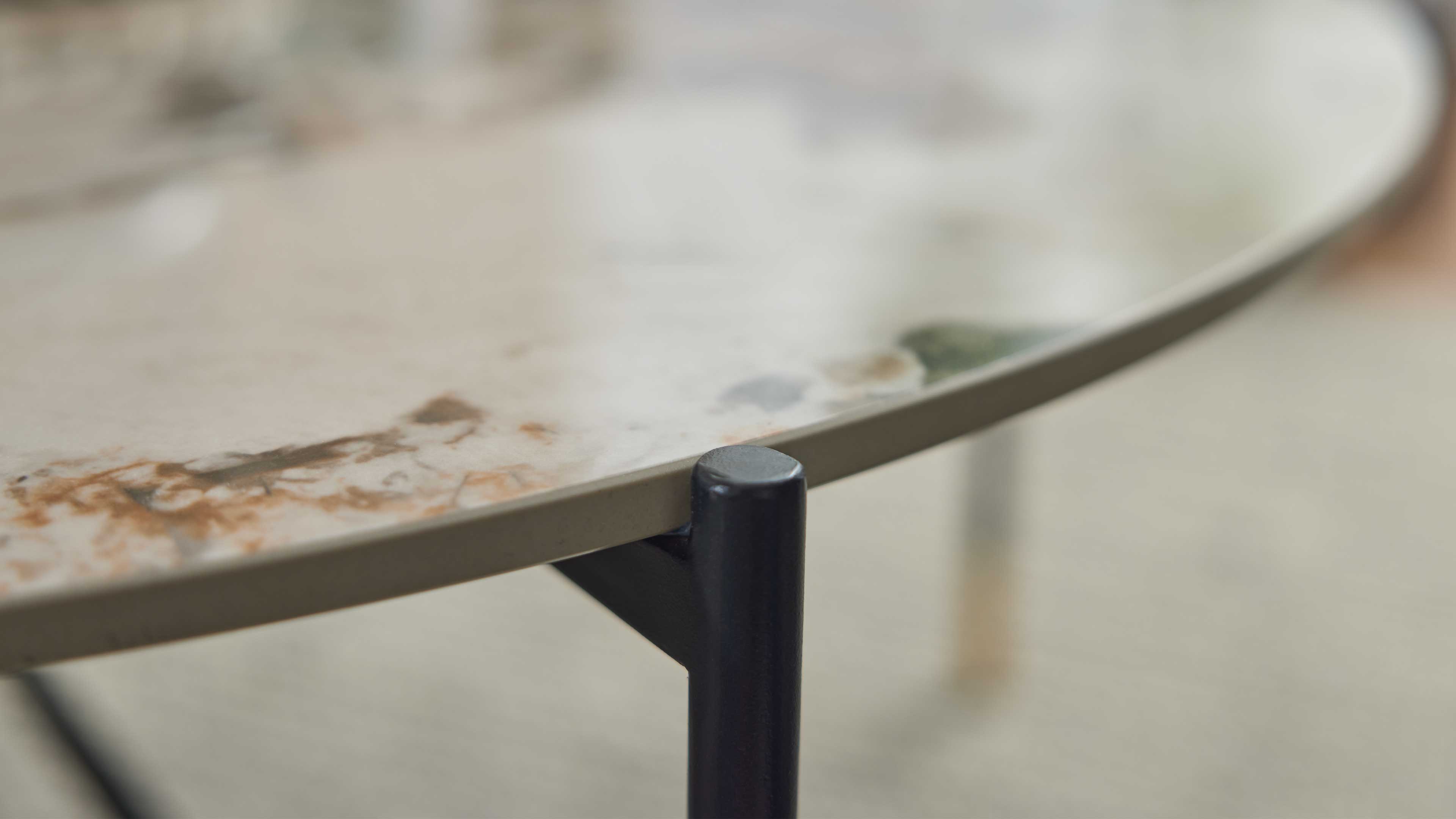 Runder Couchtisch mit marmorierter Keramikplatte und filgranem schwarzem Metallgestell