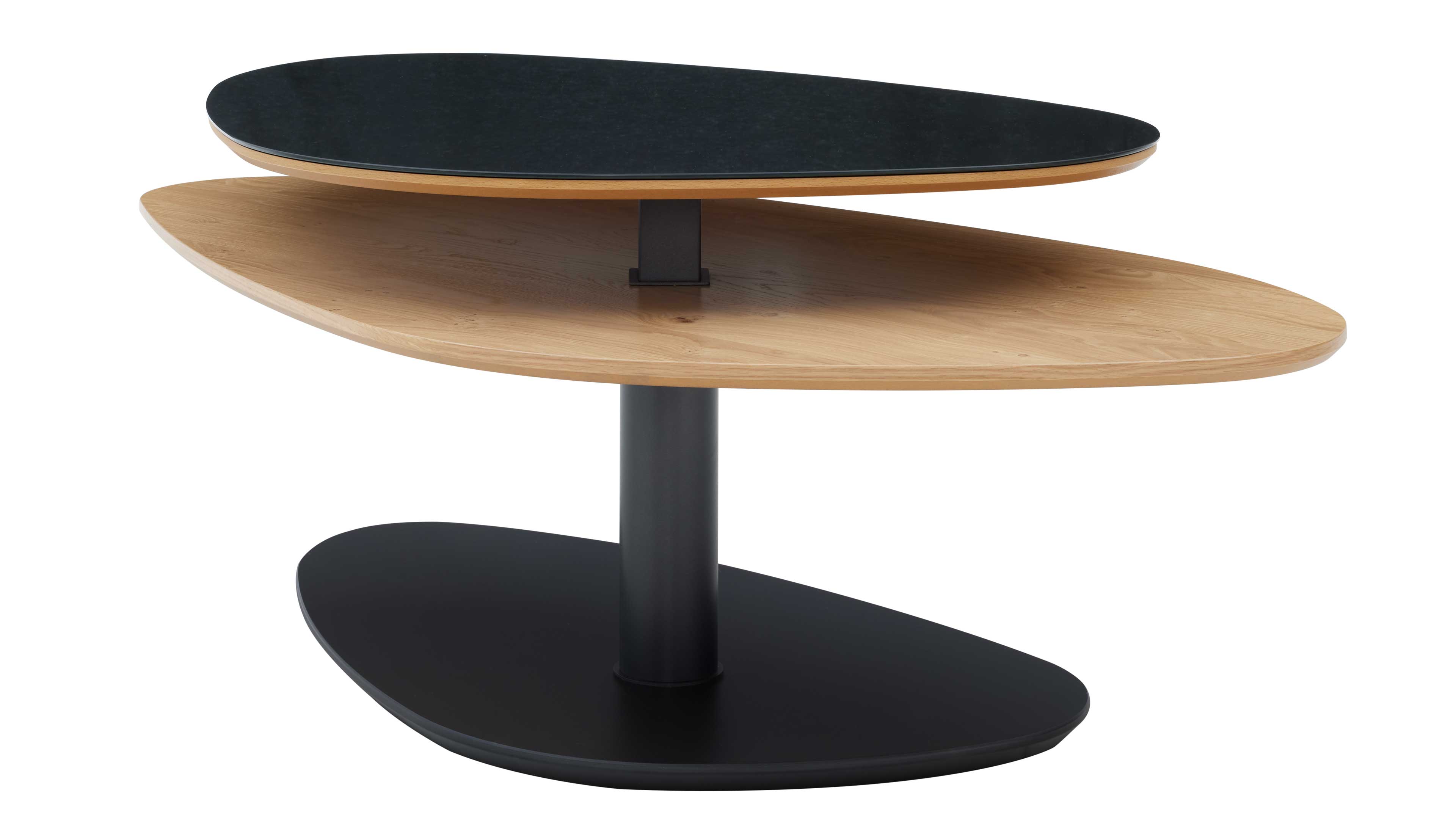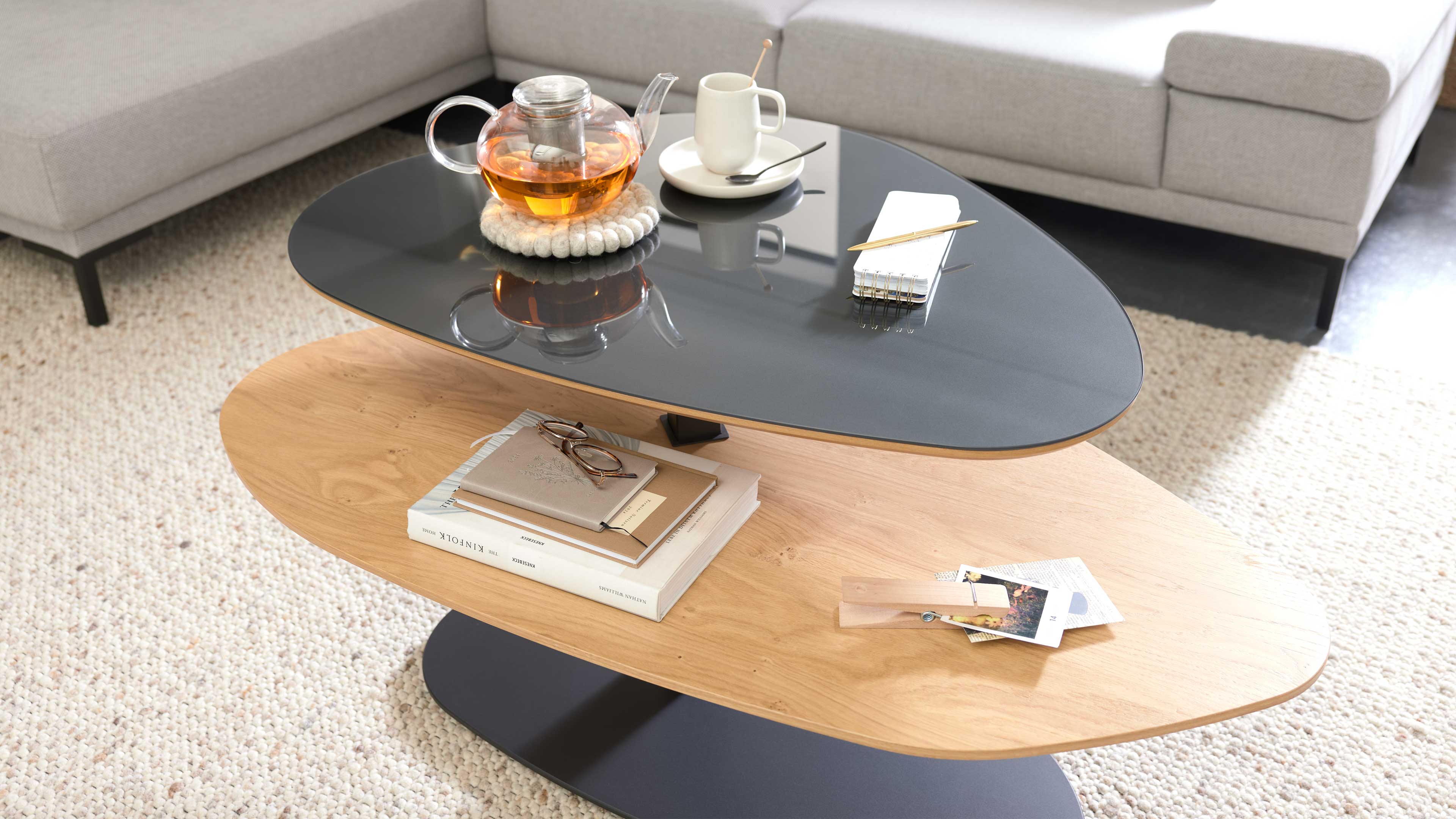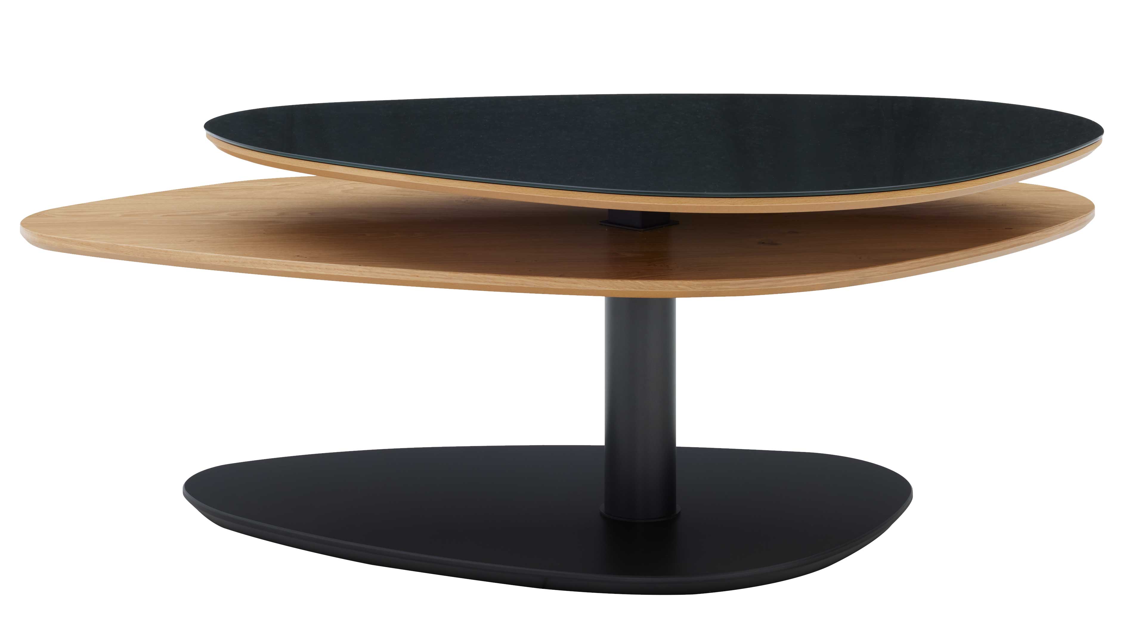 Organisch geformter Couchtisch mit drehbarer Glasplatte und Ablage in Eiche-Optik