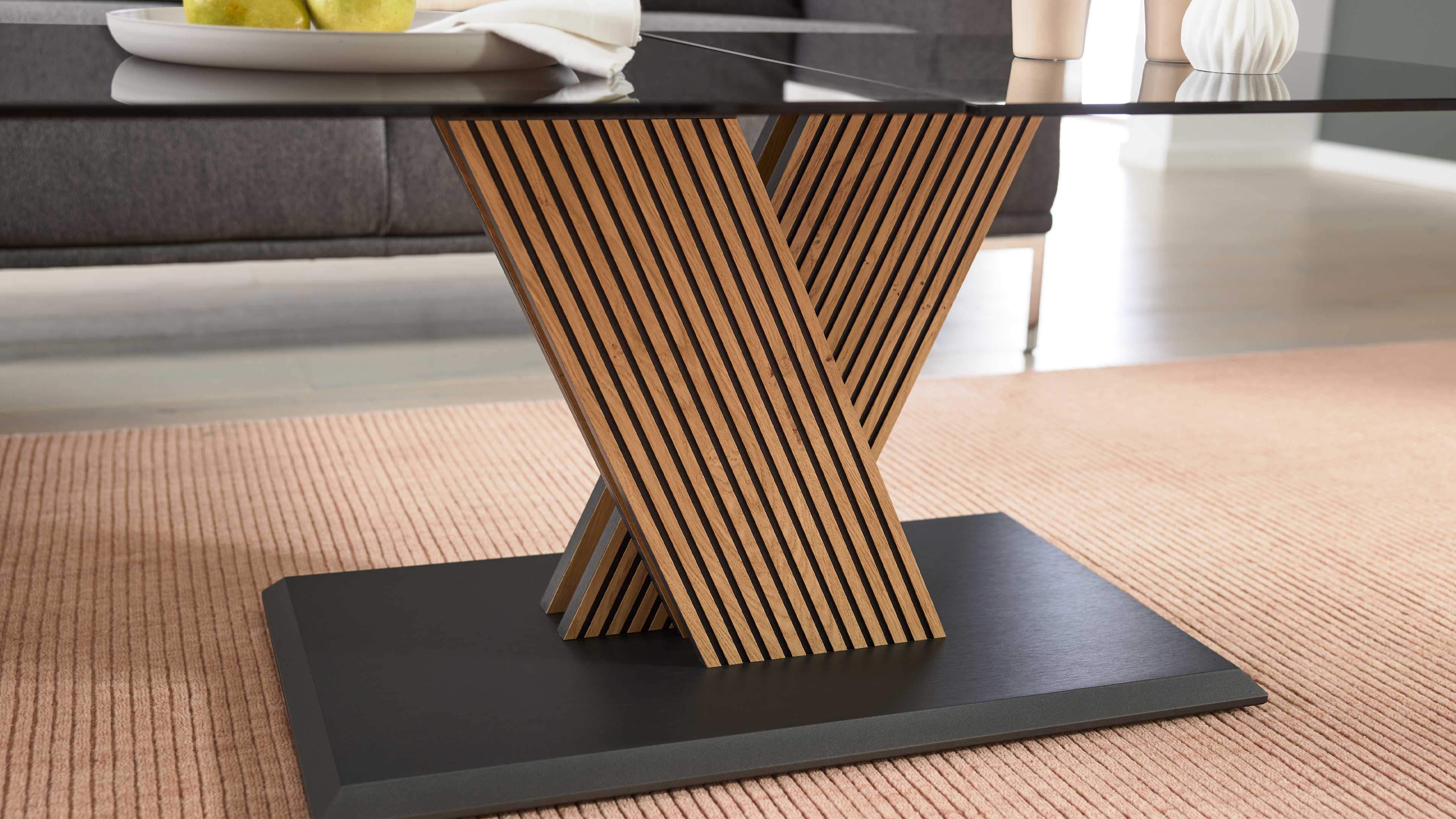 Couchtisch mit schwenkbaren Glasplatten und auffälligem X-Gestell aus Holzlamellen