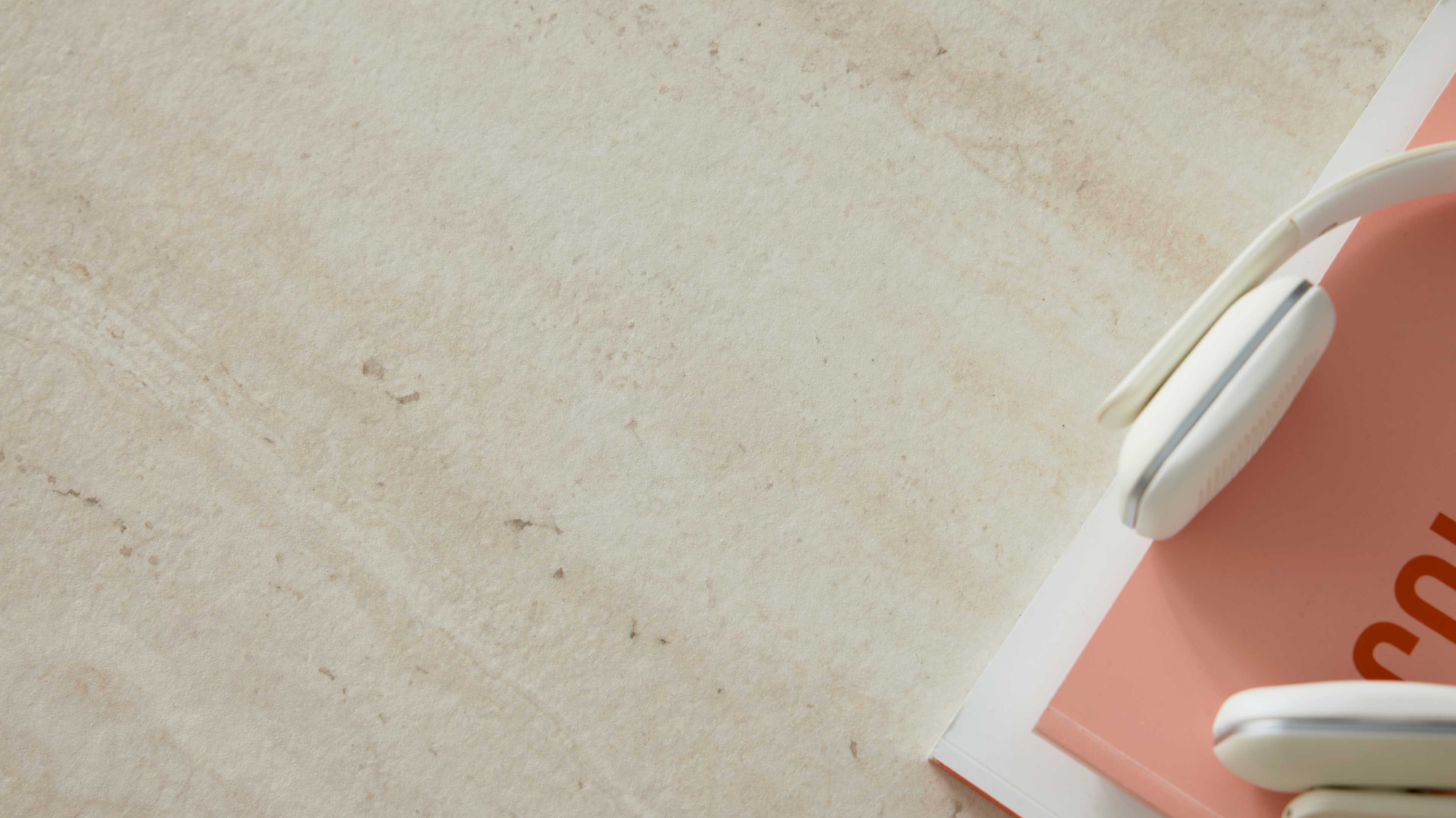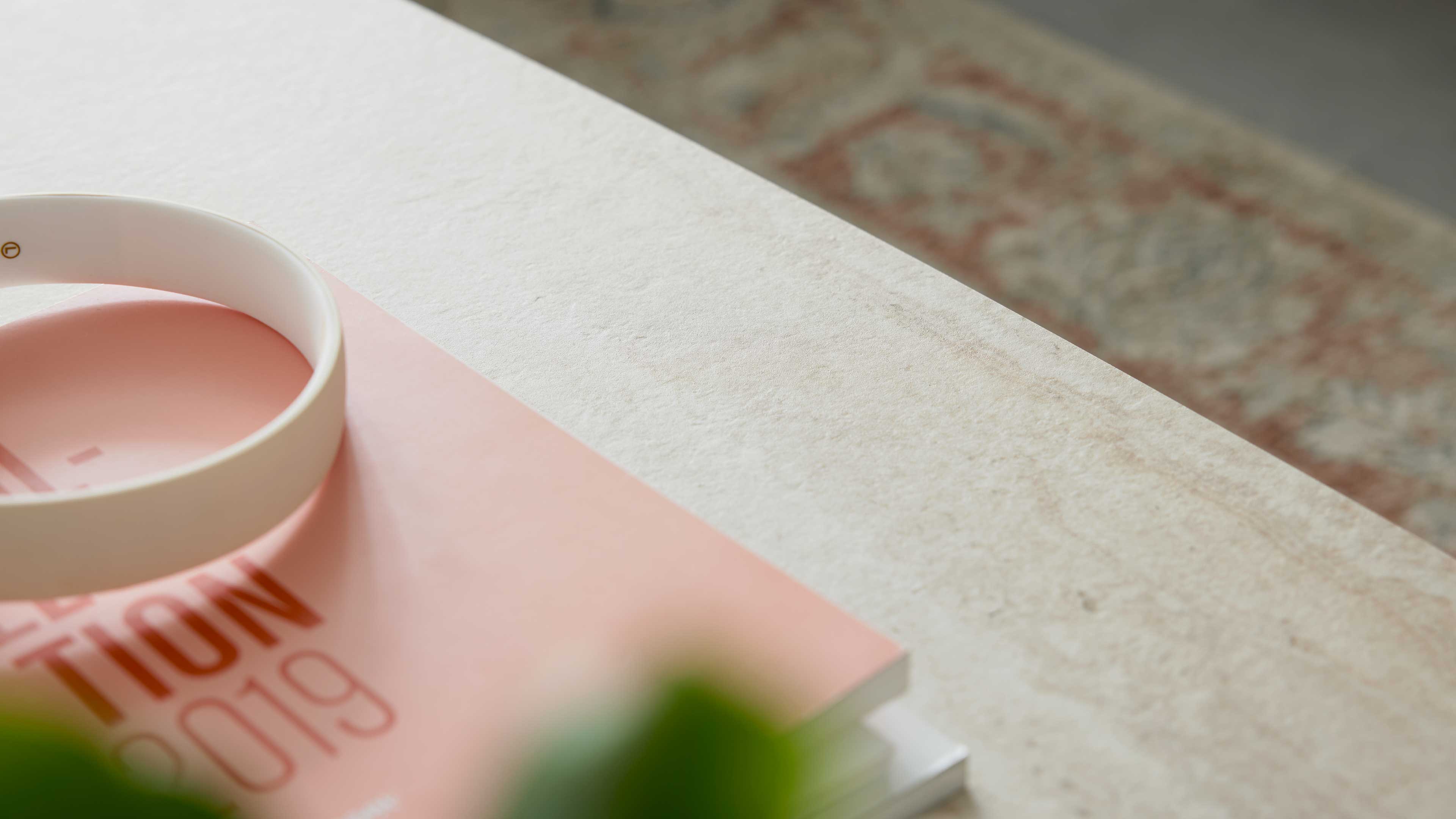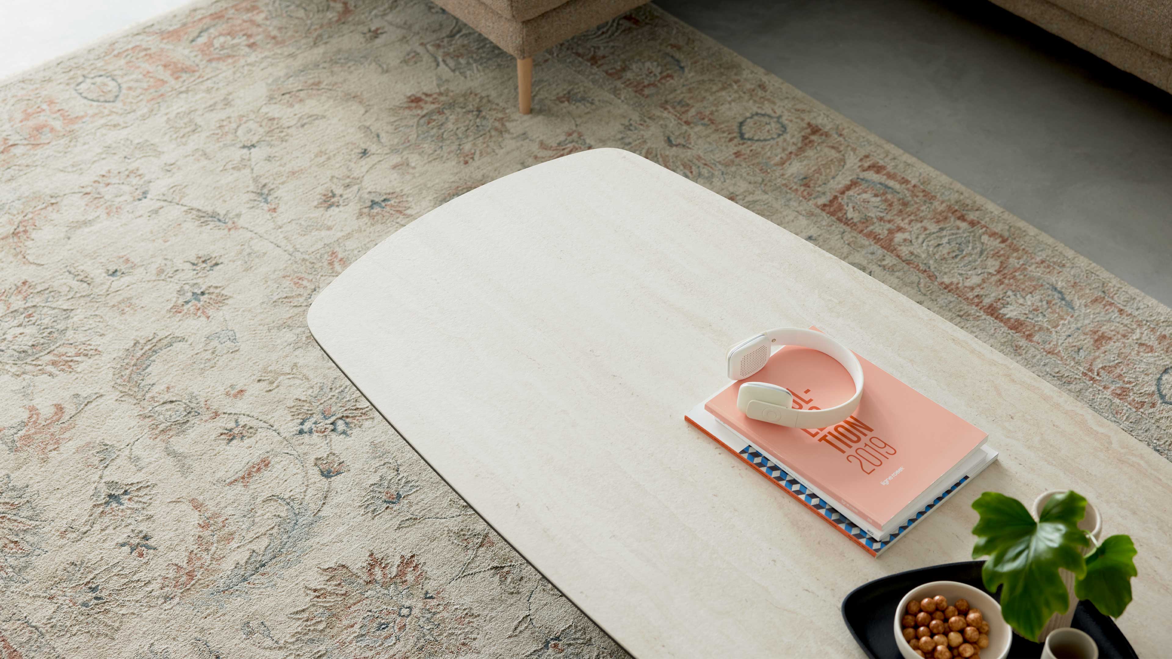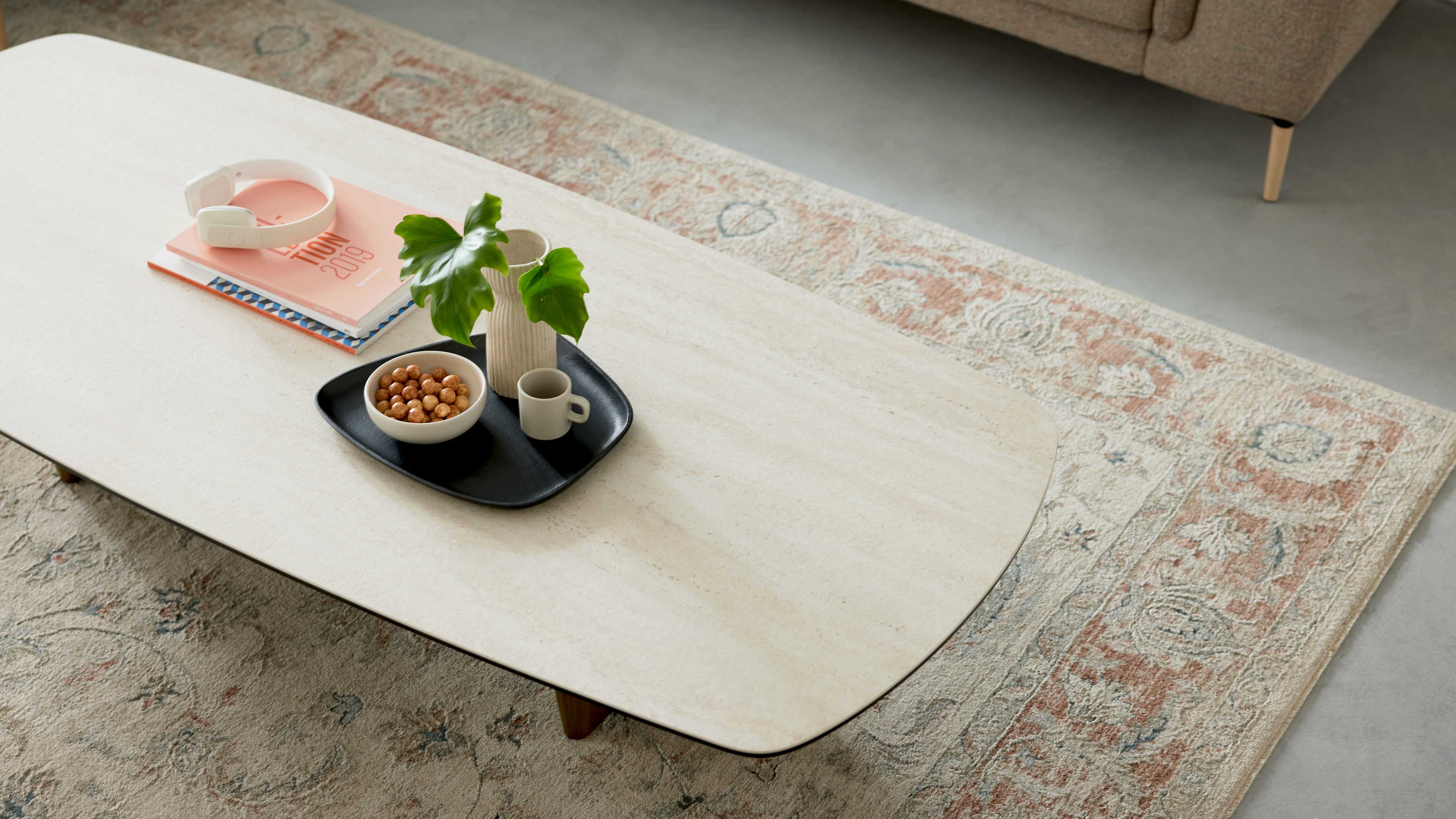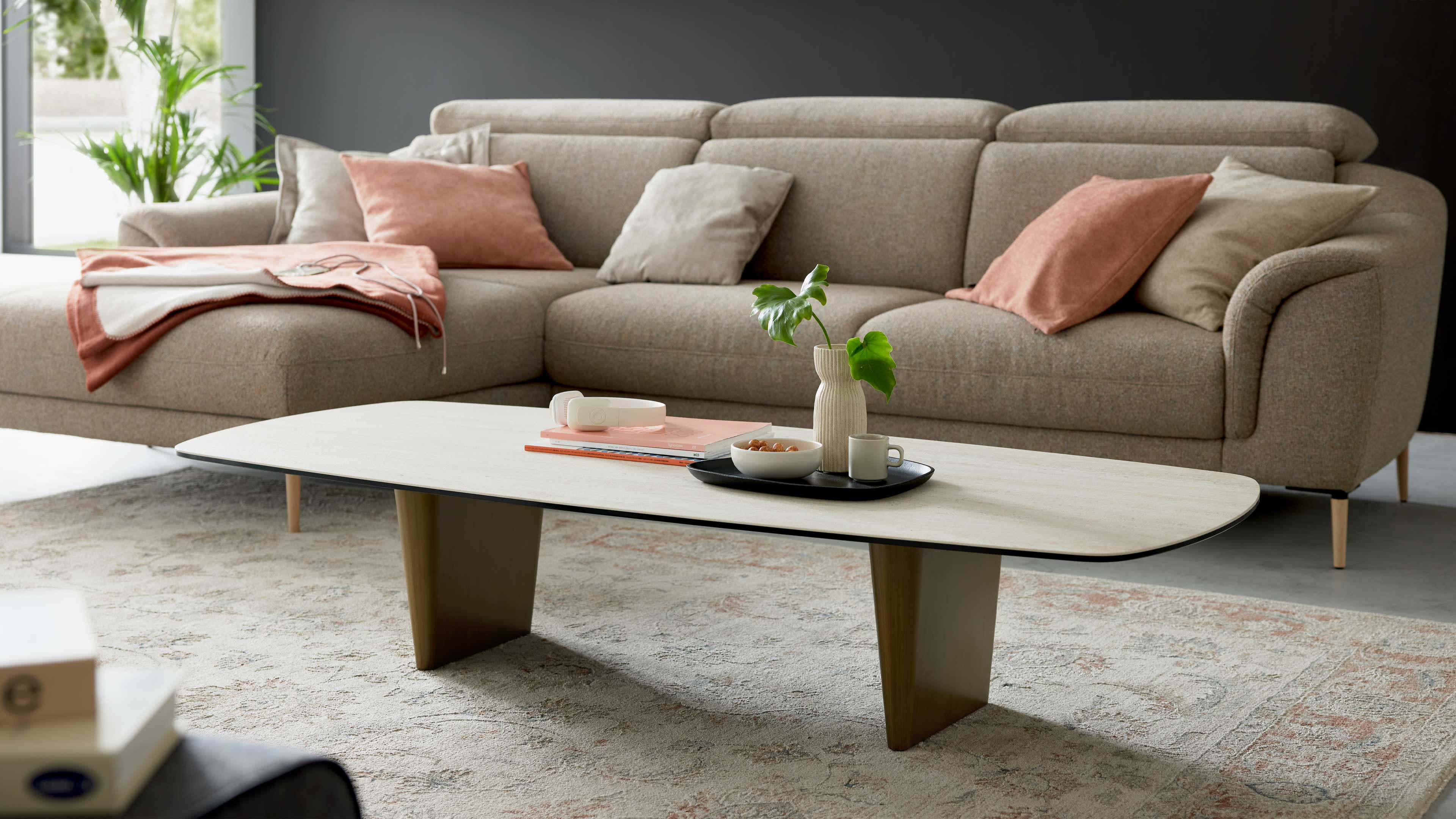Heller Couchtisch mit sandfarbener Keramikplatte und modernem V-Gestell