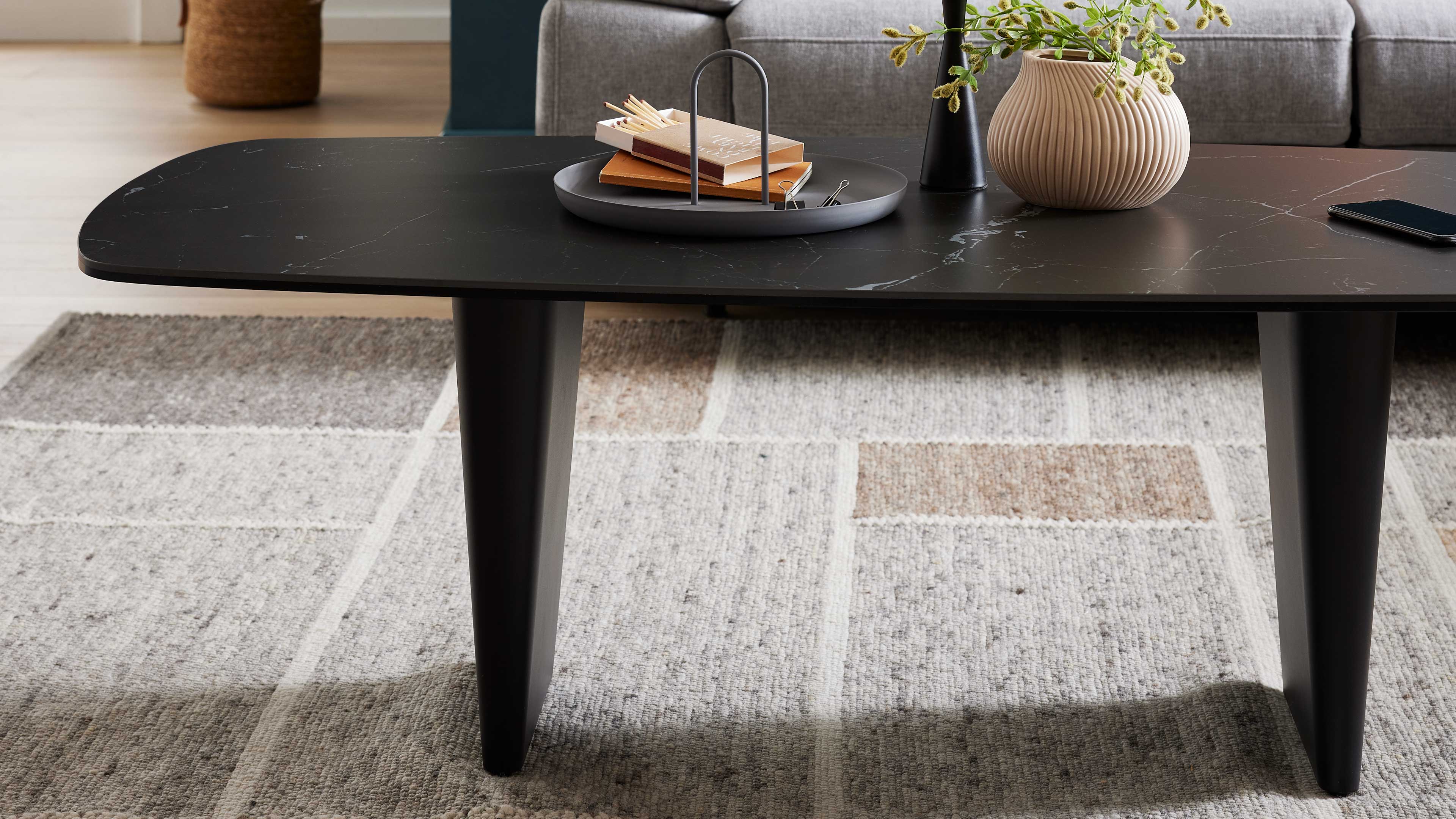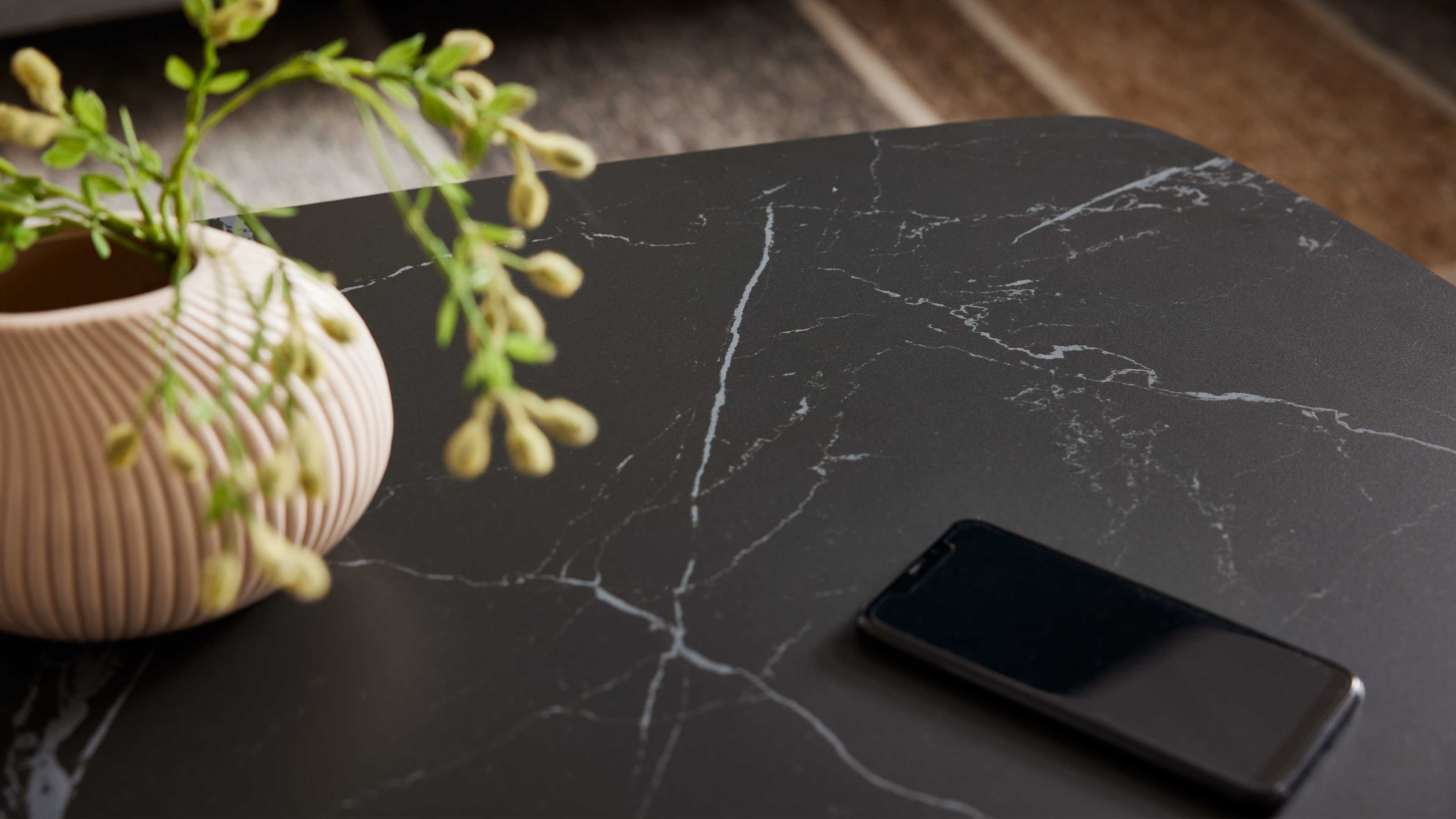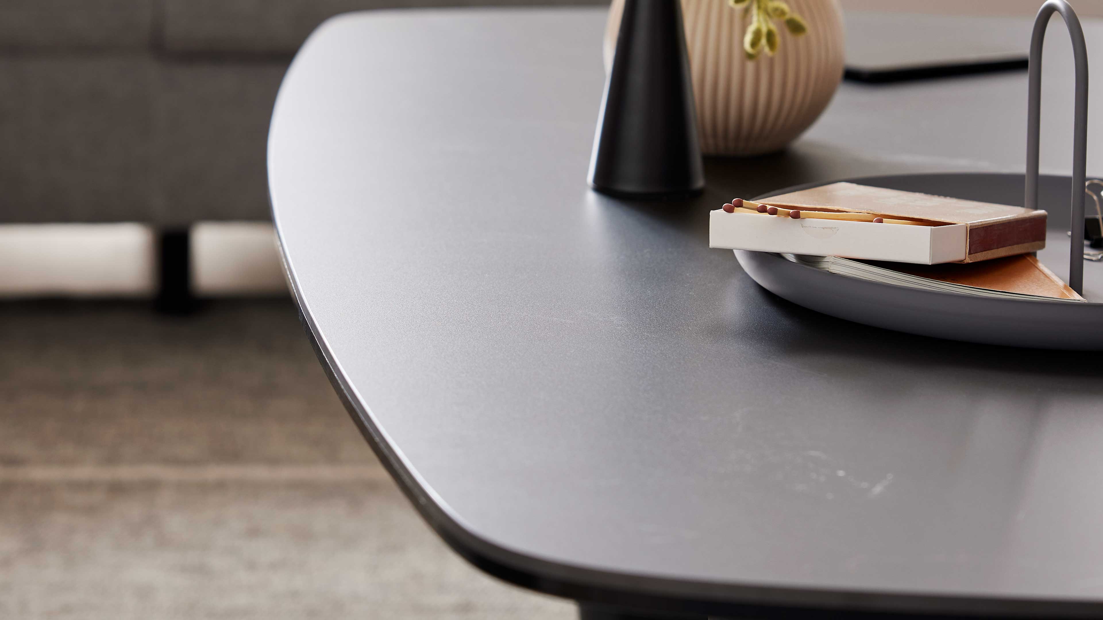 Die Tischplatte ist in drei verschiedenen Ausführungen und zwei Größen erhältlich, sodass du den Tisch ganz nach deinem Stil und Raumkonzept wählen kannst. Das mattschwarz lackierte Stahlgestell sorgt für Stabilität und setzt einen modernen Akzent – perfekt für ein harmonisches, stilbewusstes Wohnambiente.
