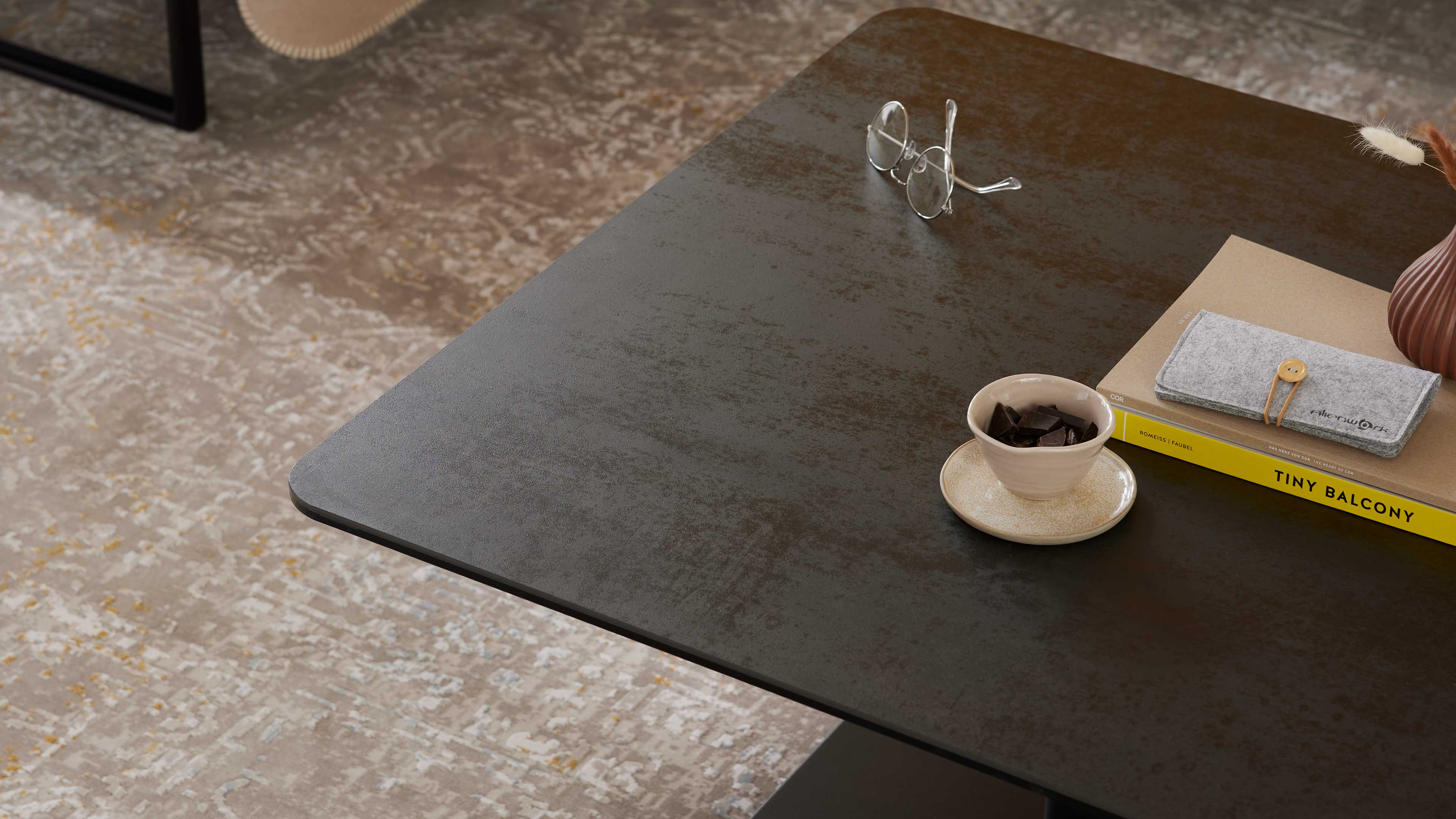Quadratische Keramik-Tischplatte in Titanoptik, höhenverstellbar