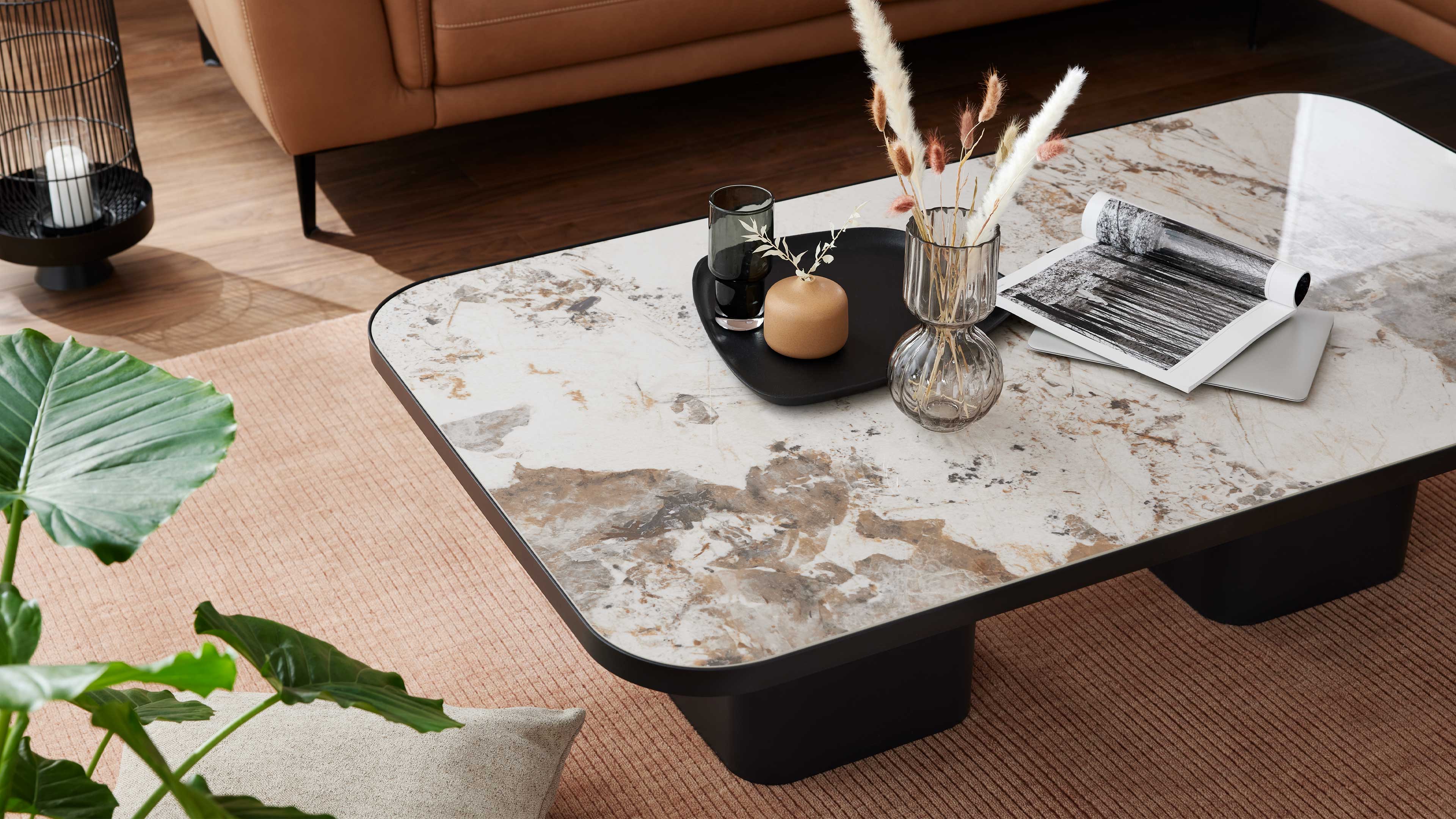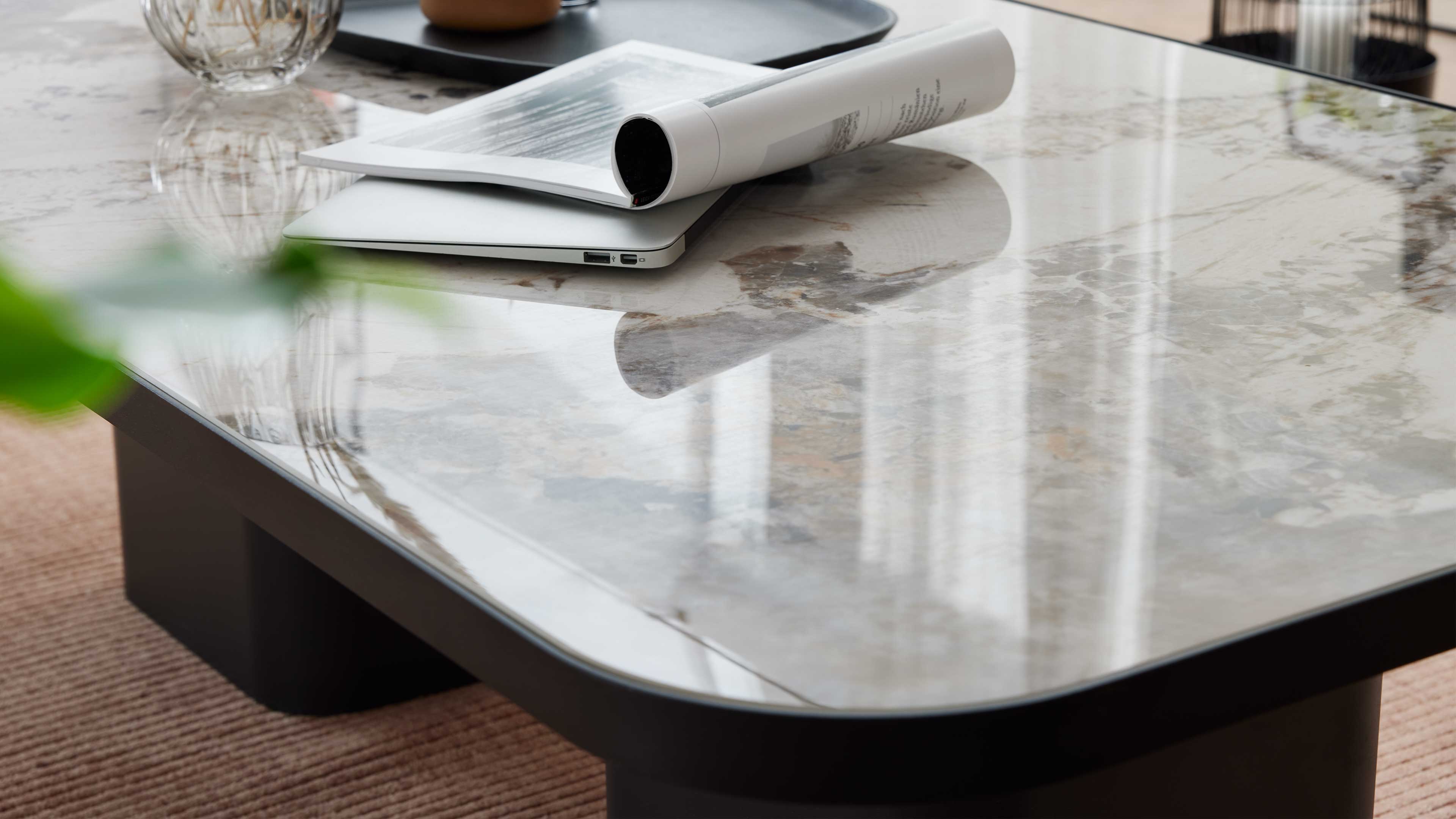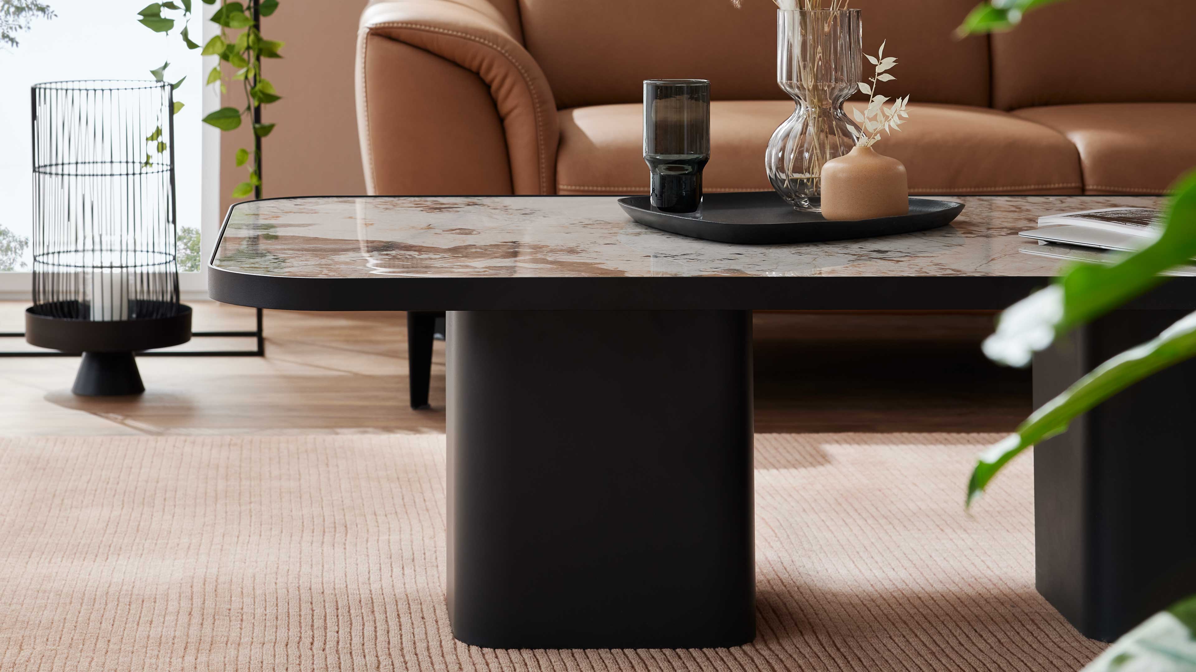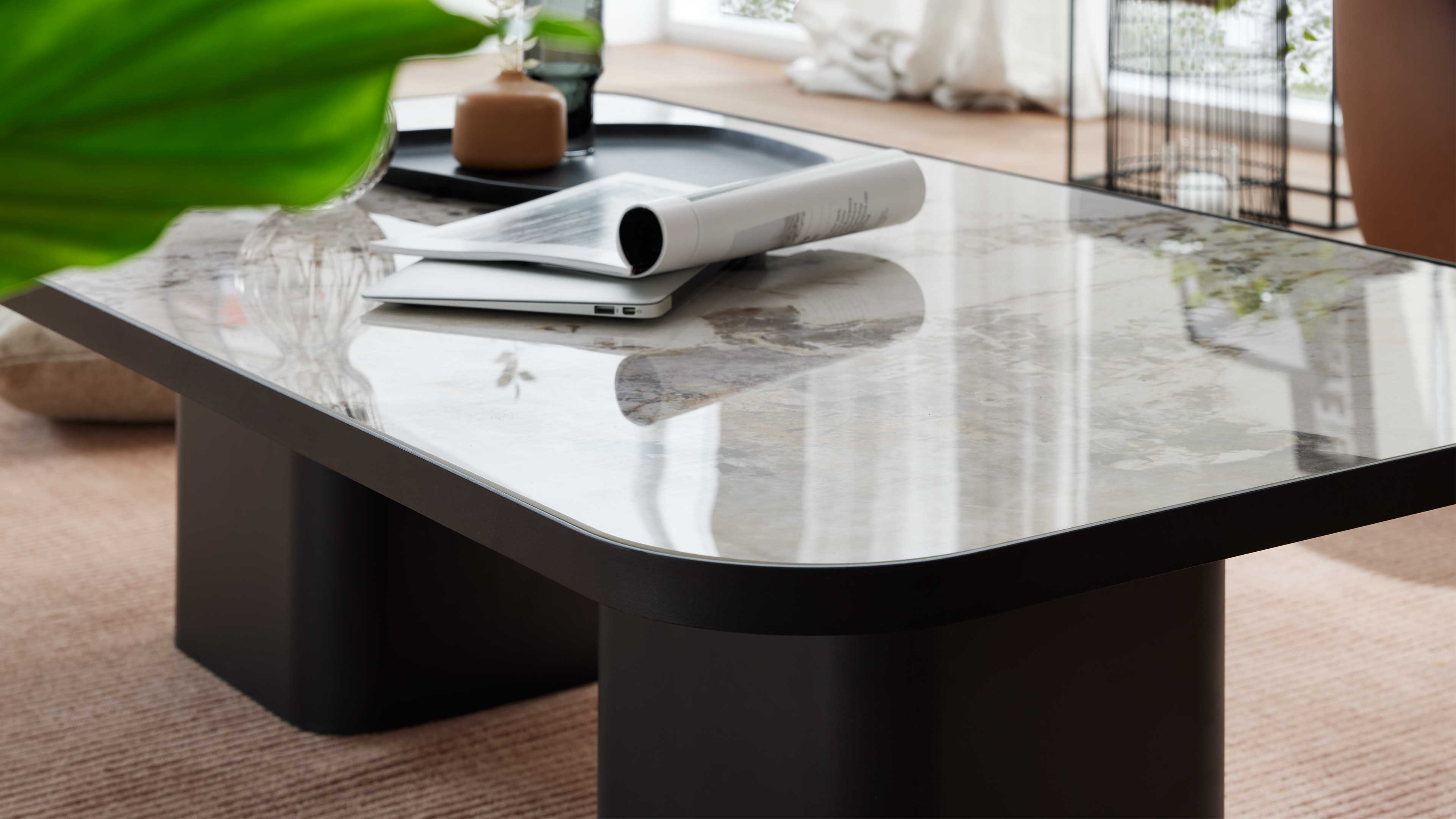 Moderner Couchtisch mit marmorierter Keramikplatte und schwarzem Sockel