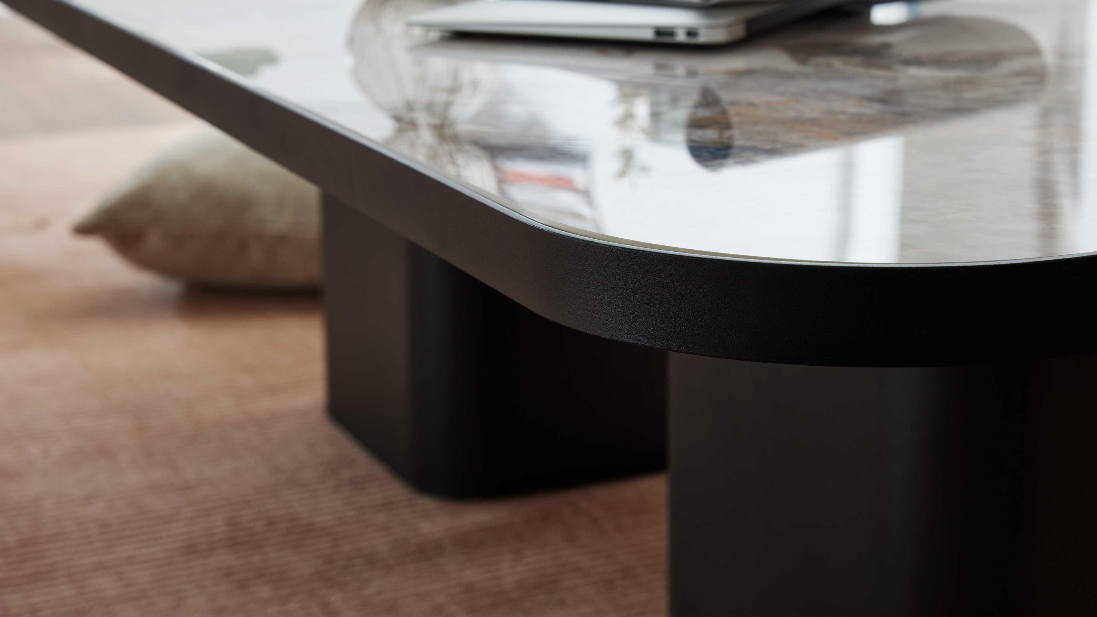 Die Tischplatte ist in drei verschiedenen Ausführungen und zwei Größen erhältlich, sodass du den Tisch ganz nach deinem Stil und Raumkonzept wählen kannst. Das mattschwarz lackierte Stahlgestell sorgt für Stabilität und setzt einen modernen Akzent – perfekt für ein harmonisches, stilbewusstes Wohnambiente.