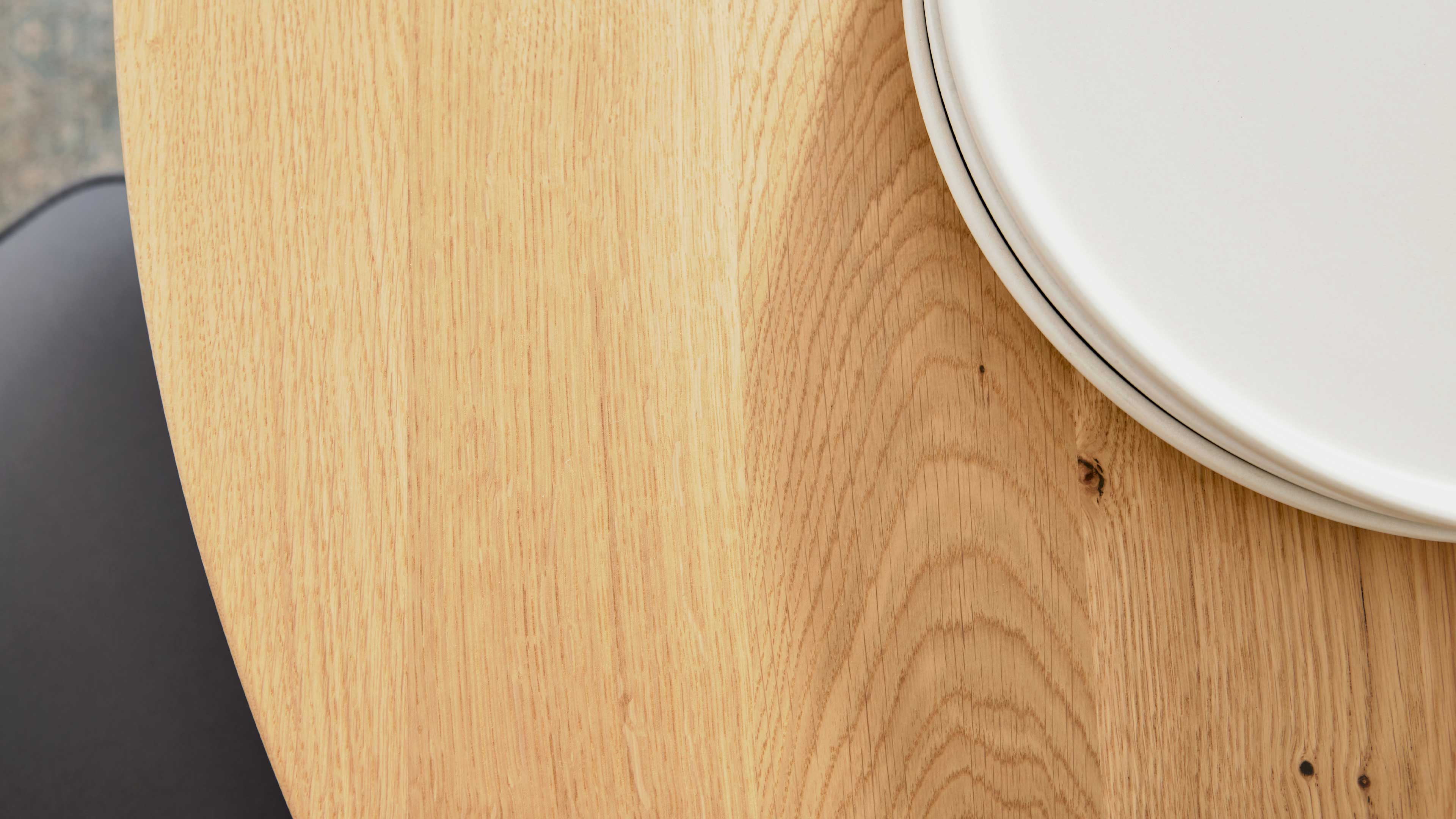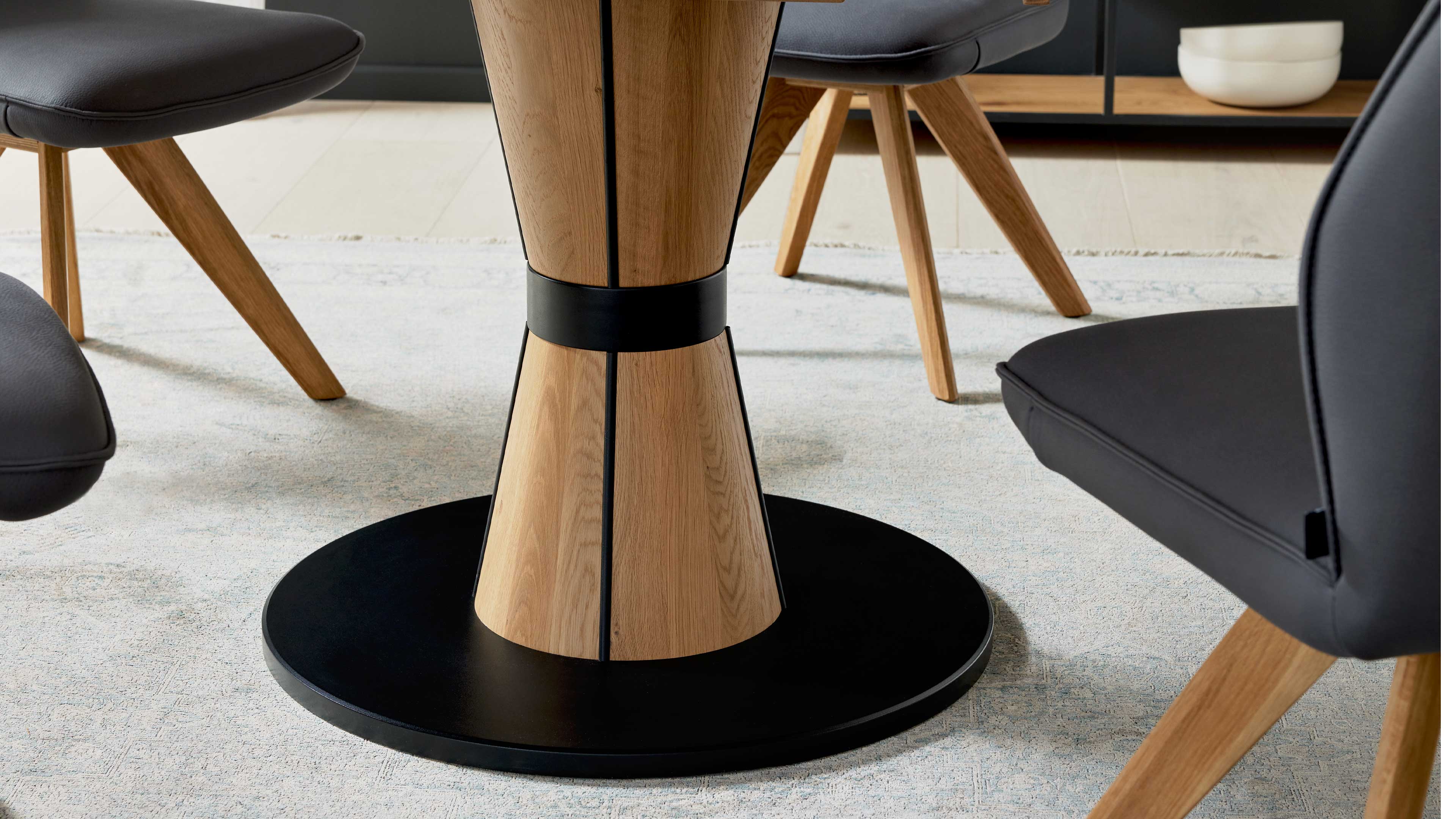 Runder Esstisch mit Massivholzplatte und mittigem Säulenfuß in Holz-Schwarz-Kombi