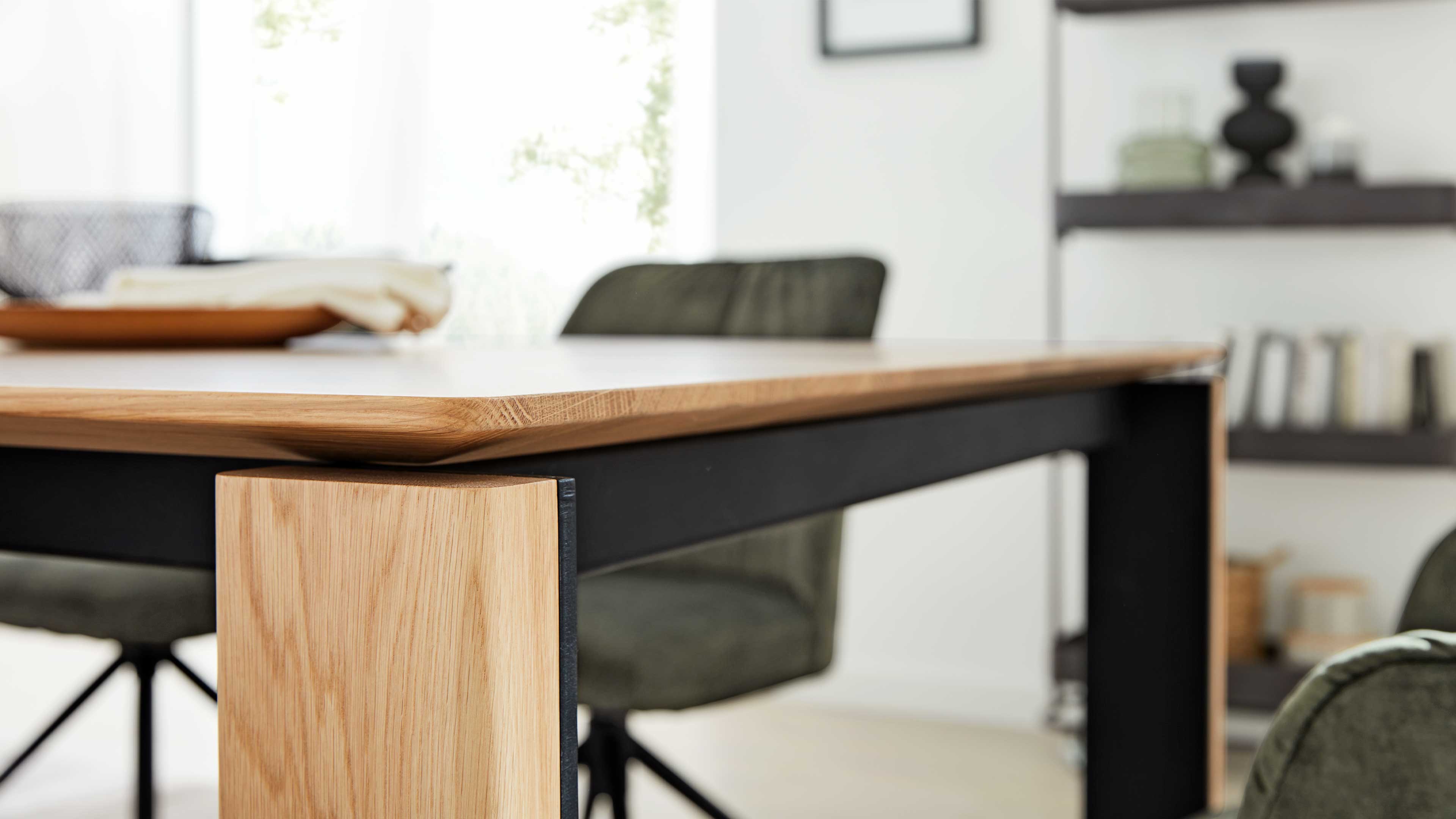 Der Esstisch aus der Interliving Esszimmer Serie 5110 bringt dir natürlichen Charme und modernes Design in einem Möbelstück an den Esstisch. Die natur geölte Tischplatte aus Eichenholz mit markanter Schweizer Kante und 24 mm starker Ausführung zeigt die Maserung des Holzes besonders schön und sorgt für eine warme, wohnliche Atmosphäre. Die Füße aus mattschwarz lackiertem Metall sind zusätzlich mit Eichenholz ummantelt – so entsteht ein harmonischer Mix aus Holz und Metall, der gleichzeitig modern und zeitlos wirkt. Mit Maßen von ca. 160 x 76 x 90 cm (B/LxHxT) ist der Massivholztisch ideal, wenn du dir einen großzügigen Mittelpunkt für deinen Essbereich wünschst.