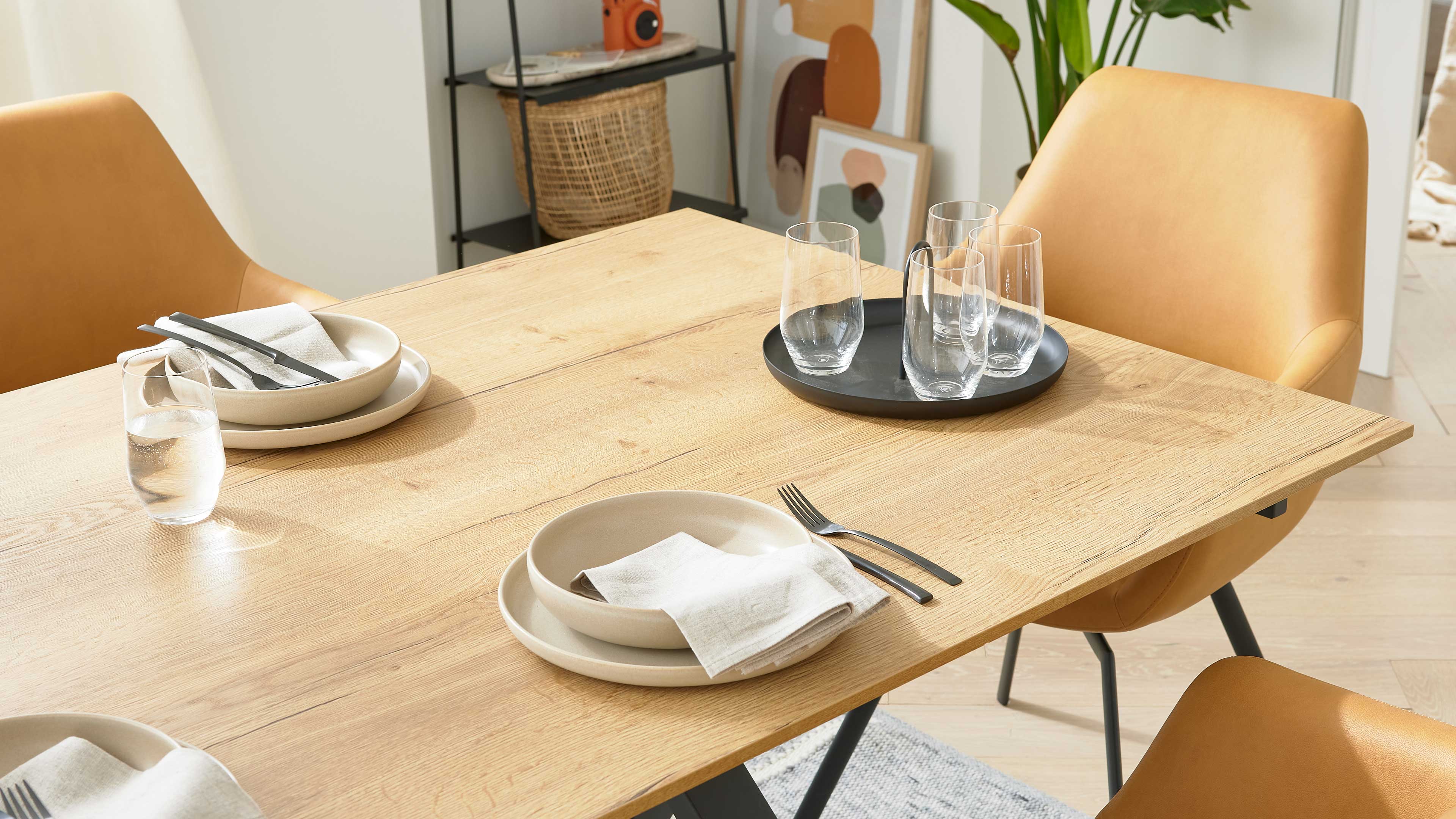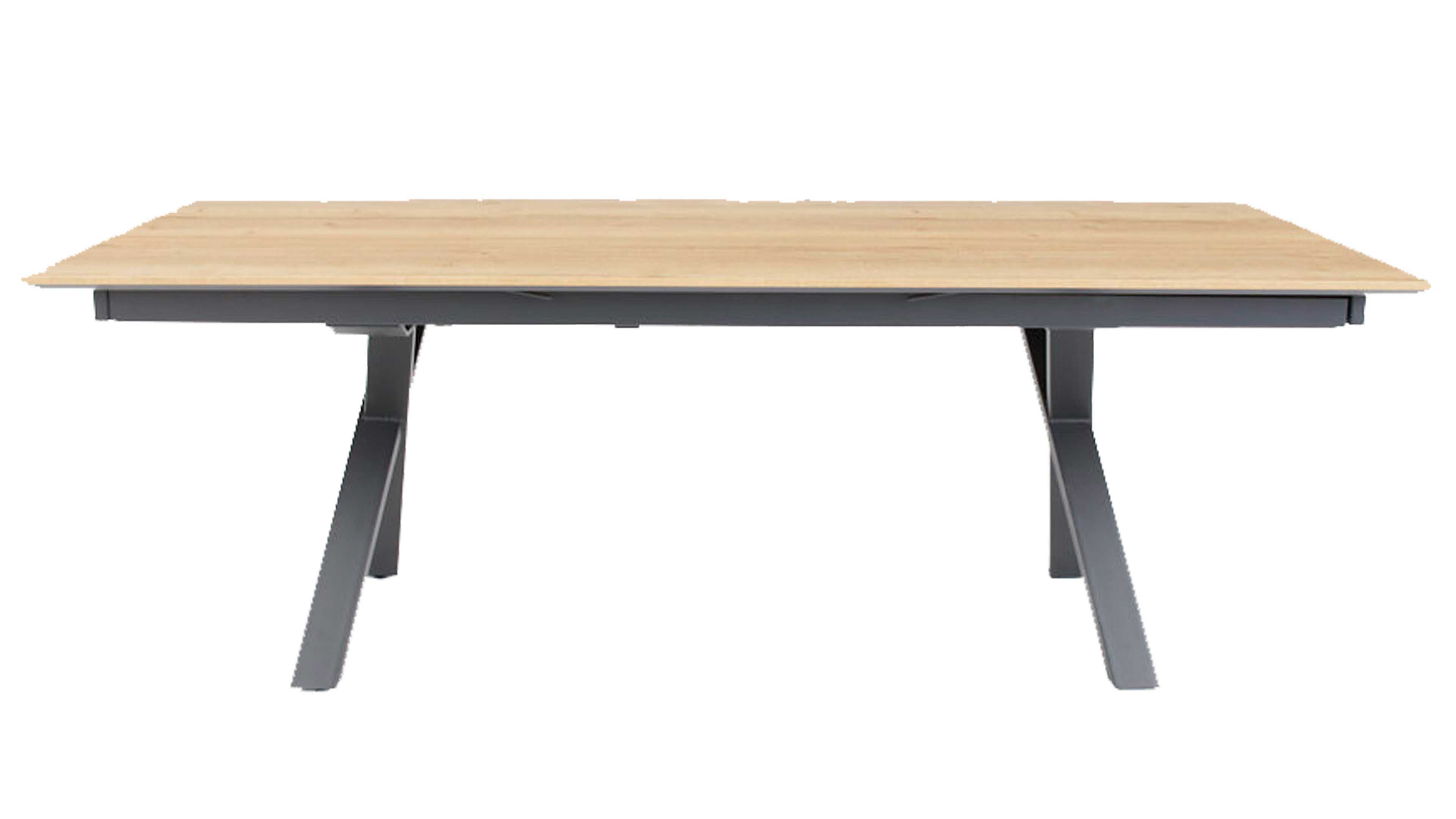 Achte bei der Planung darauf, ausreichend Platz rund um den Tisch einzuplanen: Für zehn Personen sollte der Raum etwa 3 x 2,5 m groß sein. Mit den optionalen Klappeinlagen bleibt dein Essbereich flexibel und lässt sich schnell auf spontane Gäste einstellen. Stimmen das X-Gestell farblich auf andere Metall- oder Möbelelemente ab und kombiniere die warme Holzoptik der Tischplatte mit neutralen Wandfarben und stoffbezogenen Stühlen, um ein harmonisches Gesamtbild zu schaffen.
