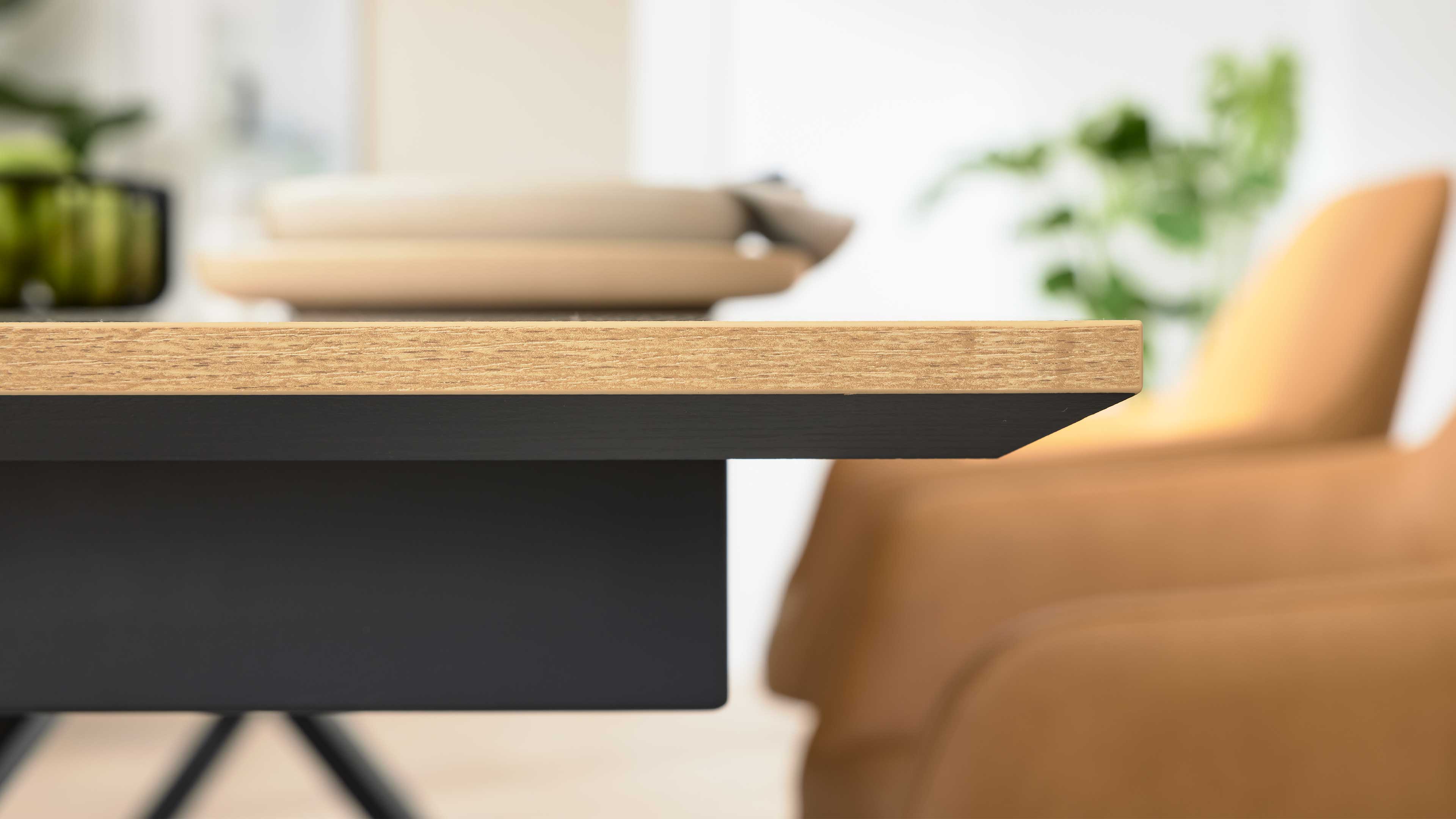 Der Interliving Esstisch überzeugt durch seine klare Formensprache und die spannende Kombination aus Materialien. Die edle Tischplatte in goldfarbener Halifax-Eiche-Nachbildung harmoniert perfekt mit dem markanten X-Gestell aus matt anthrazitfarben pulverbeschichtetem Metall. So entsteht ein moderner Kontrast, der deinem Esszimmer sowohl Wärme als auch architektonische Präsenz verleiht.