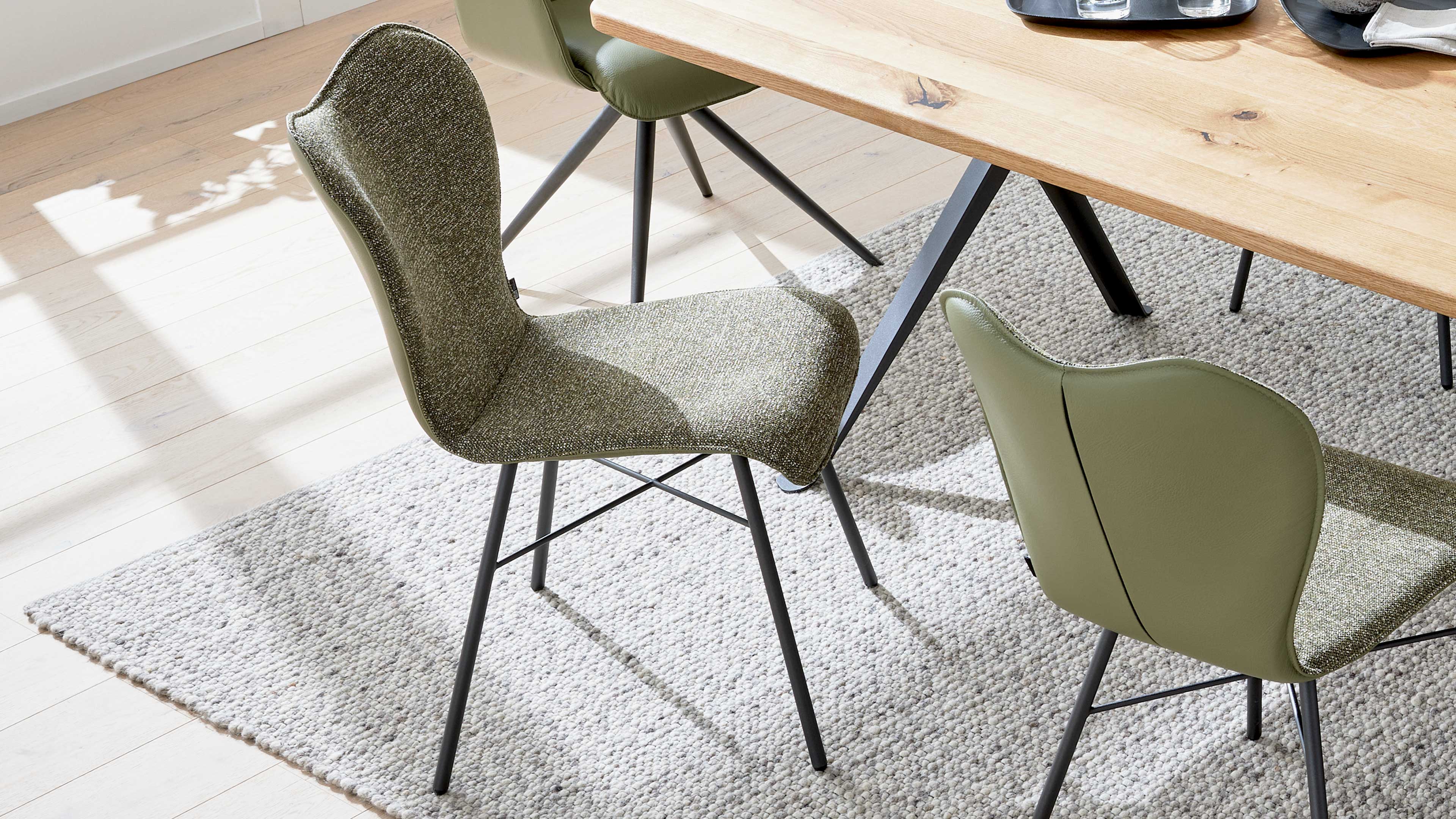 Auch beim Untergestell kannst du kreativ werden: Die Serie hält verschiedene Gestellvarianten für Tische und Stühle bereit, damit alles perfekt zusammenpasst. Die Stühle selbst bekommst du wahlweise mit oder ohne Drehfunktion, und bei den Bezügen hast du die Wahl zwischen Leder, Stoff oder einem modernen Materialmix.
