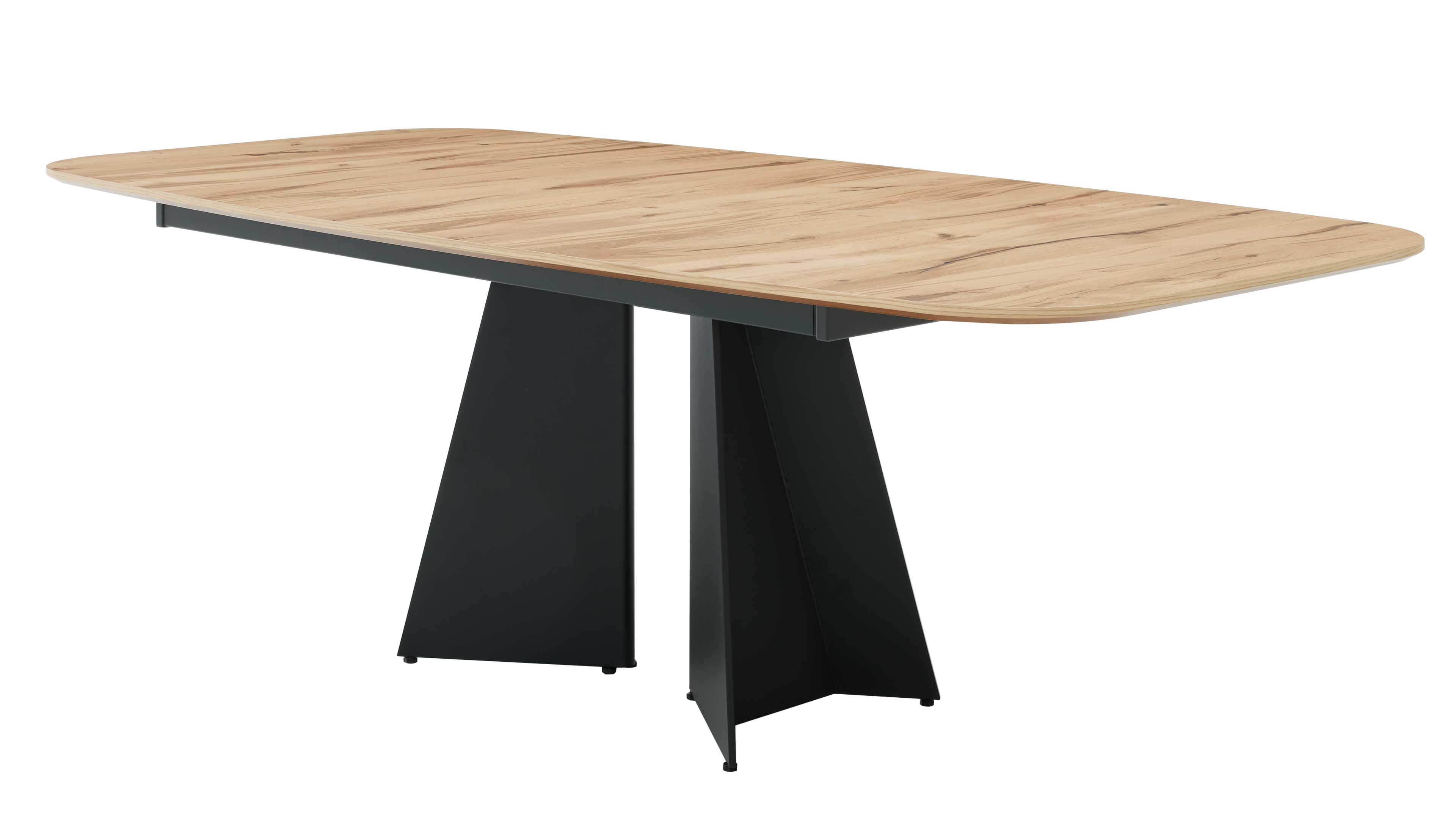 Moderner Esstisch mit abgerundeter Holzplatte und schwarzem Design-Untergestell