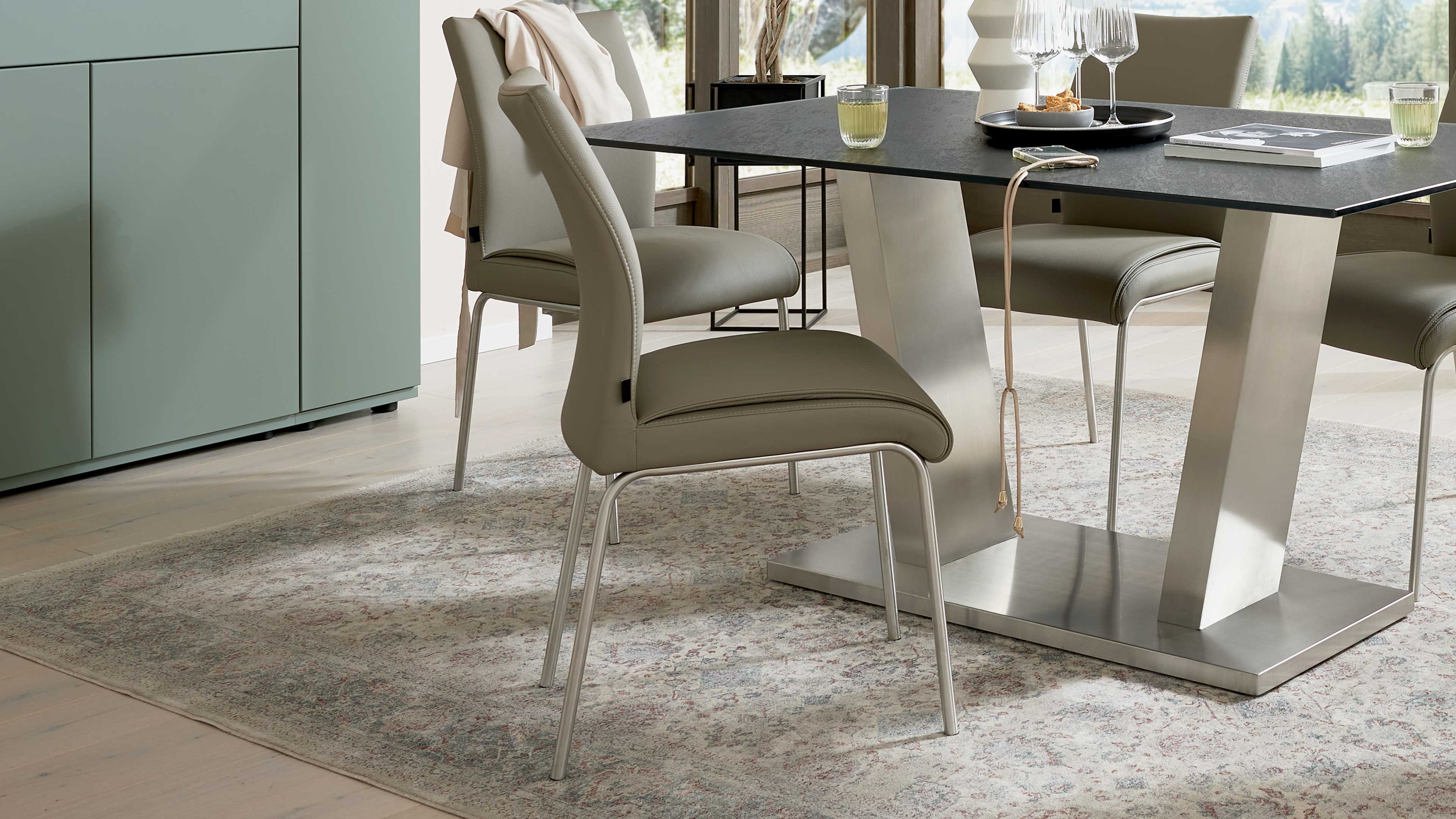 Insgesamt stehen dir 576 Stuhl-Varianten zur Verfügung – perfekt, wenn du Wert auf individuellen Stil und flexible Planbarkeit legst. Du wählst aus sechs verschiedenen Gestellformen, die je nach Modell klassisch, modern oder besonders filigran wirken. Bei den Gestellfarben entscheidest du dich entweder für gebürsteten Edelstahl oder mattschwarzes Metall – zwei starke Looks, die sich wunderbar in unterschiedliche Raumkonzepte einfügen.