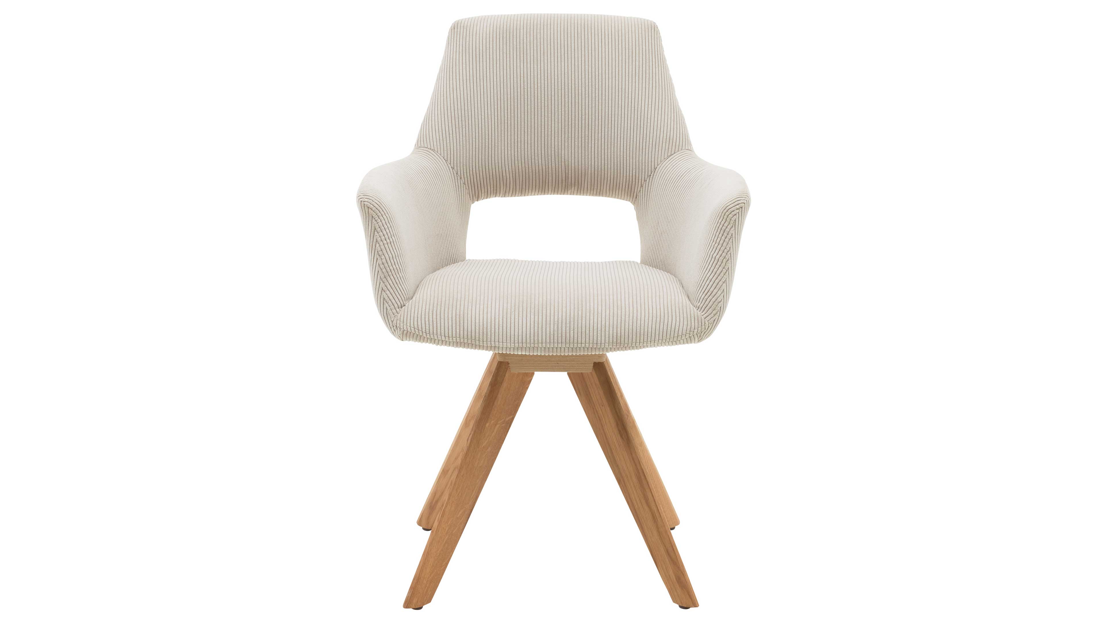 Drehbarer Polsterstuhl mit Armlehnen in cremefarbenem Cordstoff und stabilem Holzfuß
