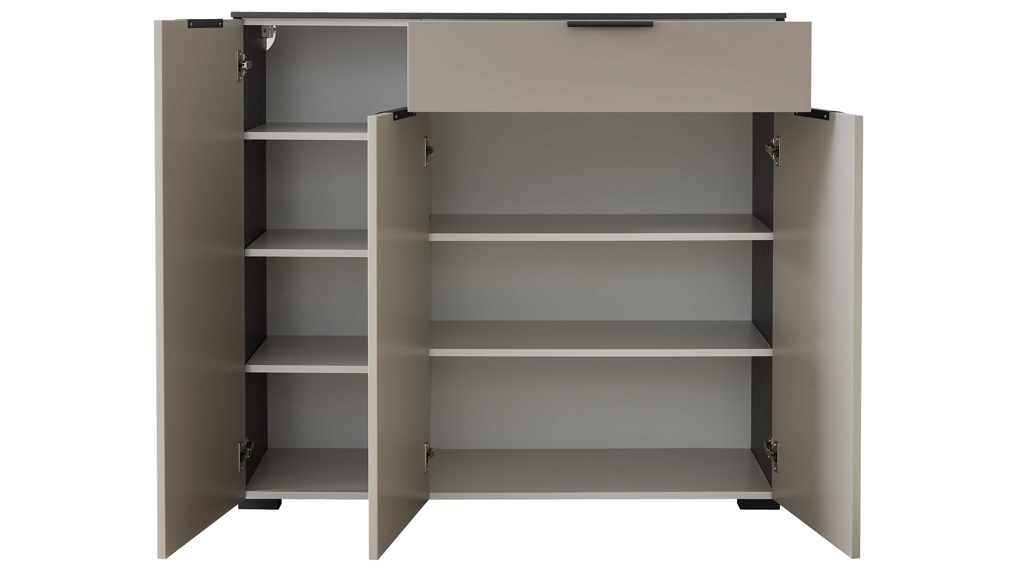 Die Kombination aus graubeigem Mattlack, Räuchereiche-Nachbildung und mattschwarzen Metallelementen verleiht dem Ensemble eine warme, moderne Ausstrahlung mit kontrastreicher Tiefe – perfekt für ein stilvolles Zuhause mit klarer Linie.