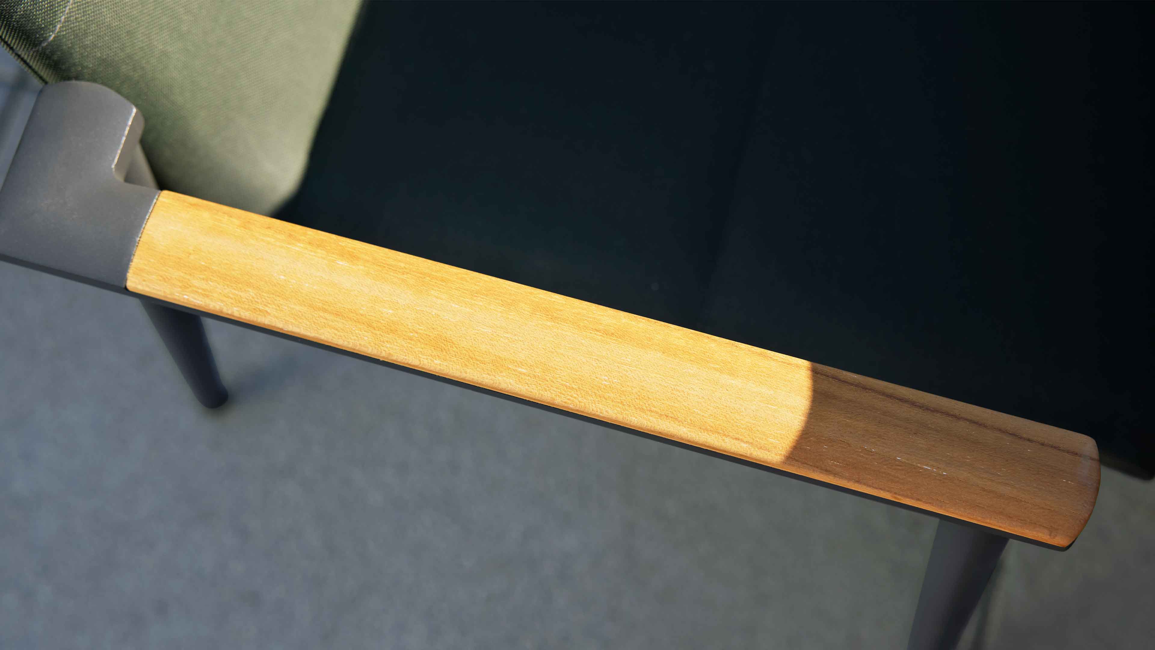 Gartenstuhl mit Aluminiumgestell und textiler Bespannung in Dunkelgrün mit Armlehnen in Teak-Optik