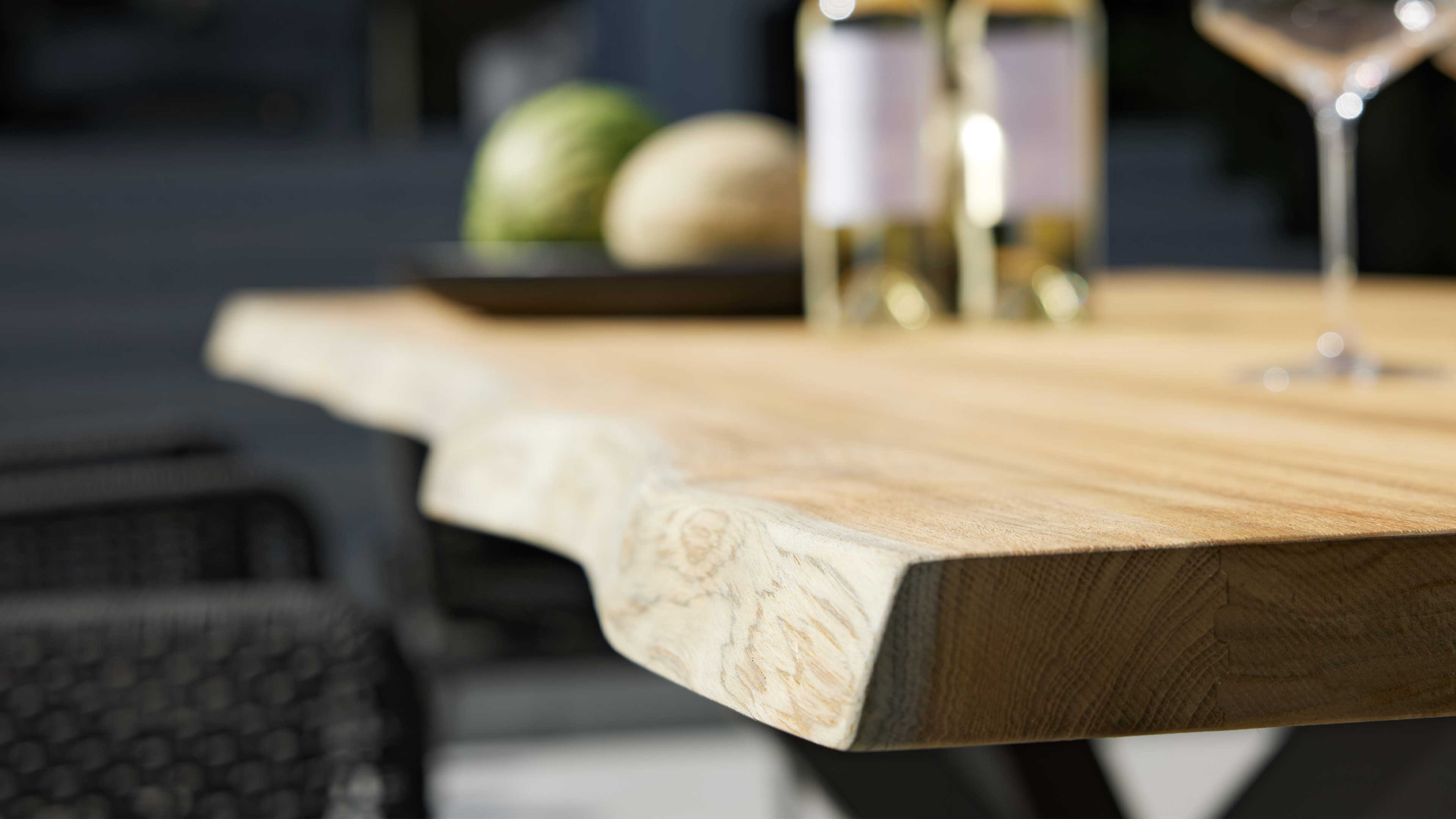 Outdoor-Esstisch mit modernem X-Gestell und Teakholzplatte mit Baumkante
