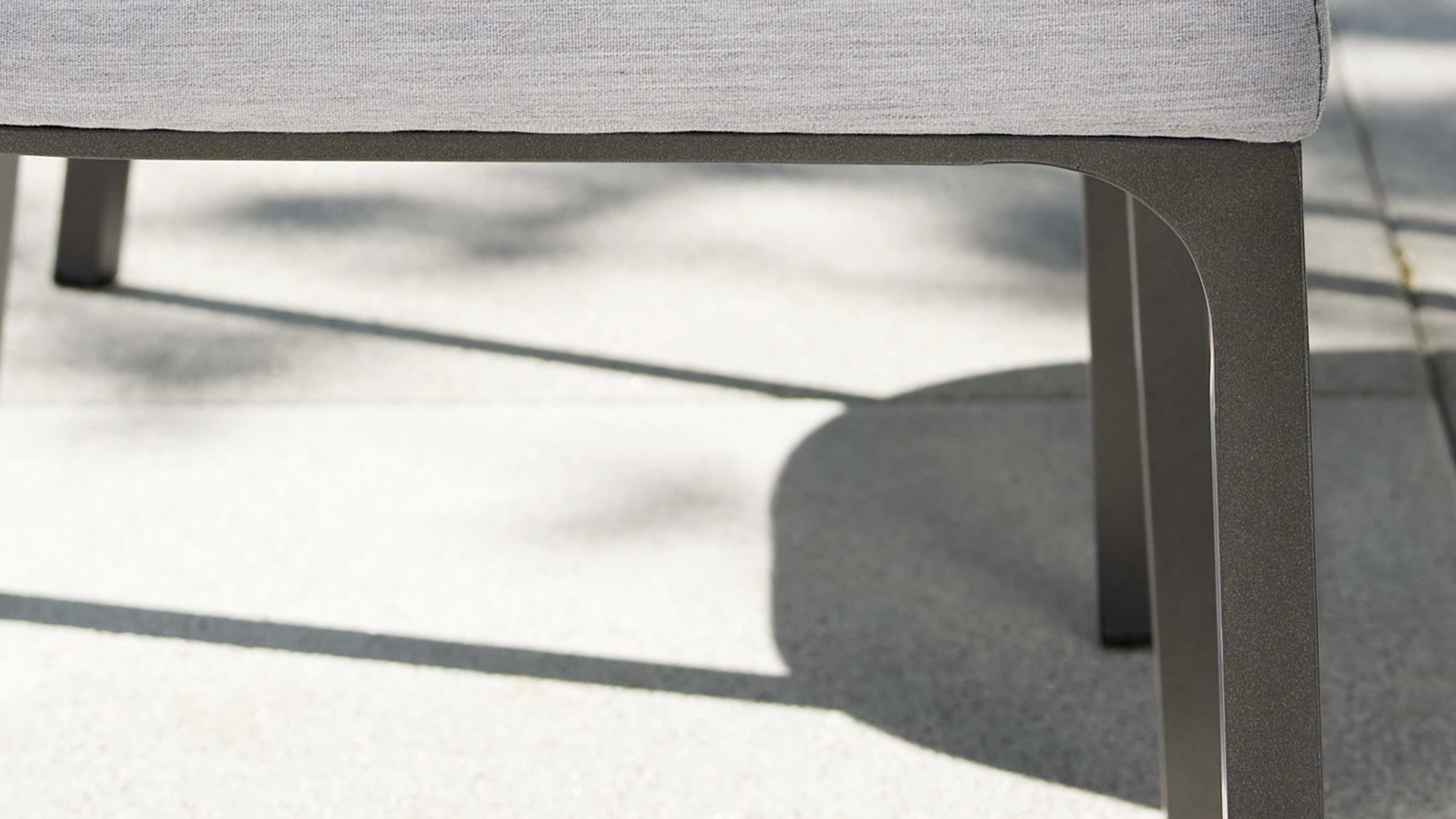 Der Bezug besteht aus spinndüsengefärbtem Garn, bei dem die Farbpigmente bereits während der Faserherstellung tief und dauerhaft eingebettet werden. Dadurch ist der Stoff lichtecht, UV-beständig, resistent gegen Alterungsvergilbung sowie schmutz- und wasserabweisend. Selbst bei intensiver Sonneneinstrahlung behält er seine Farbe – und bleibt gleichzeitig robust, pflegeleicht und langlebig.