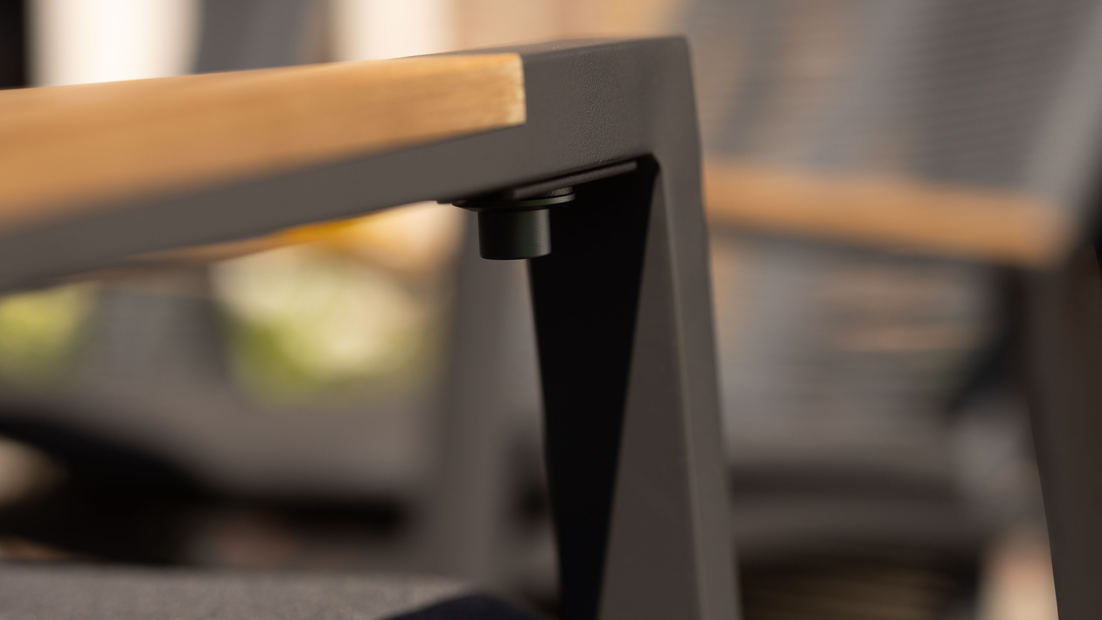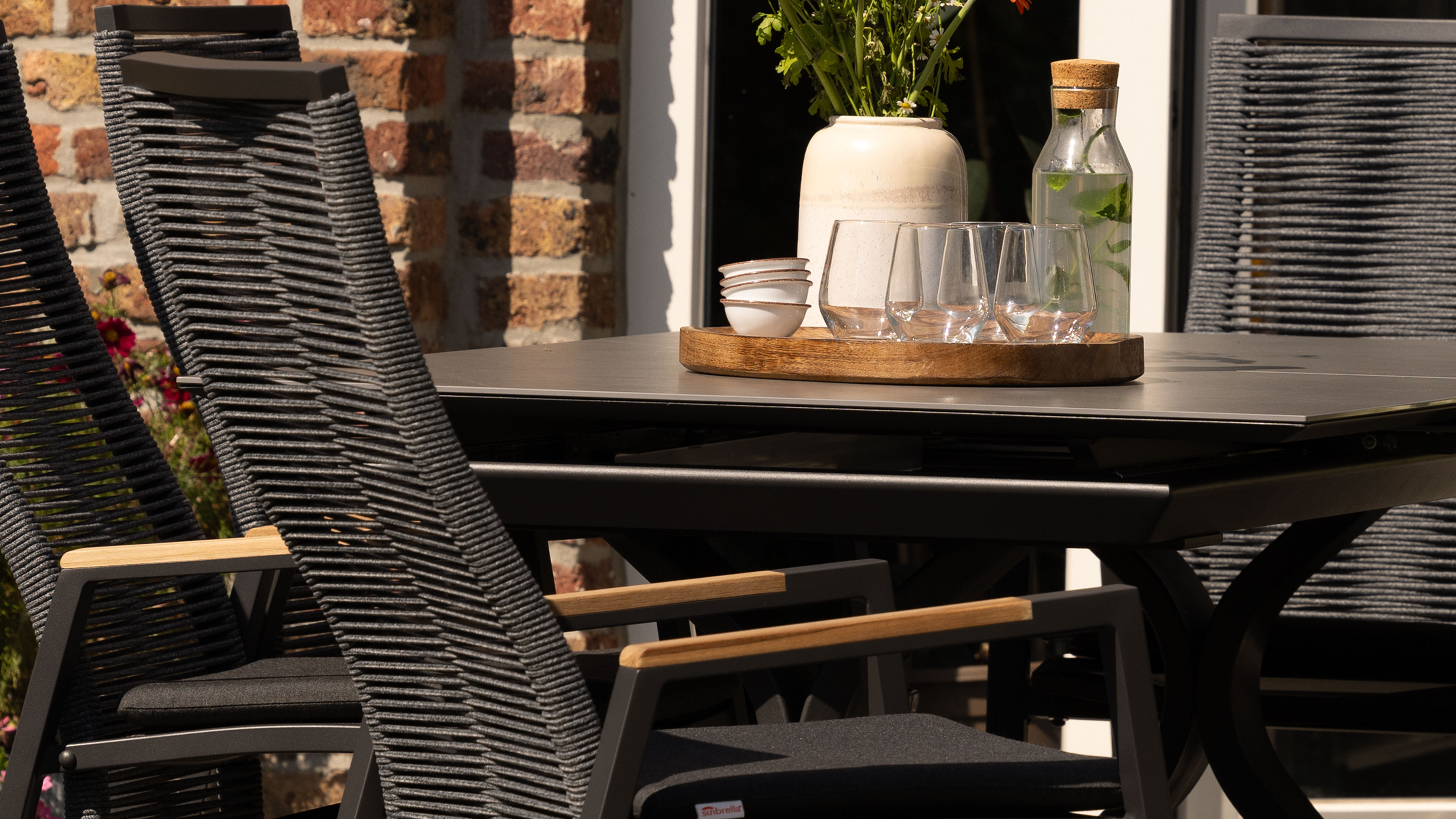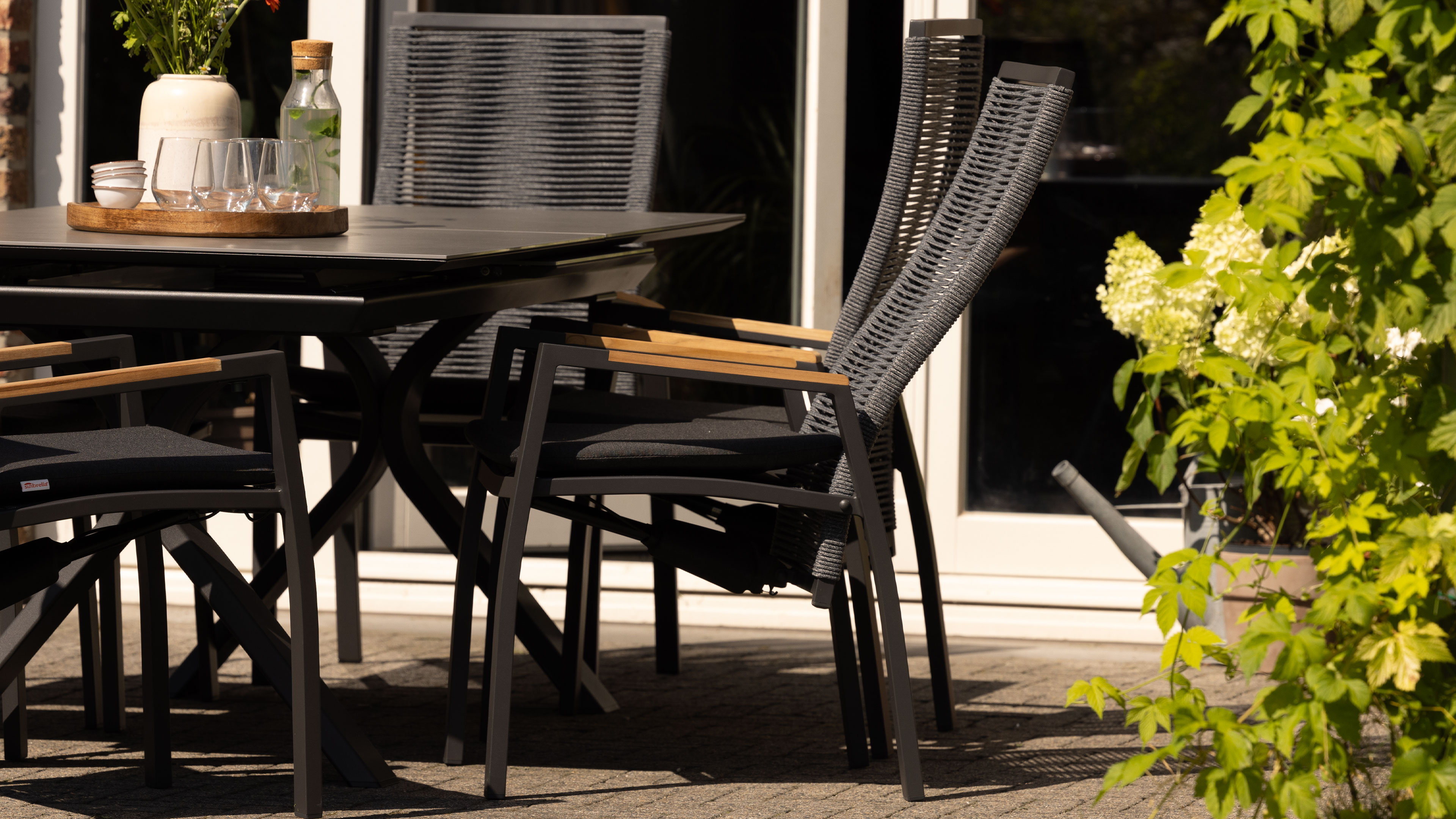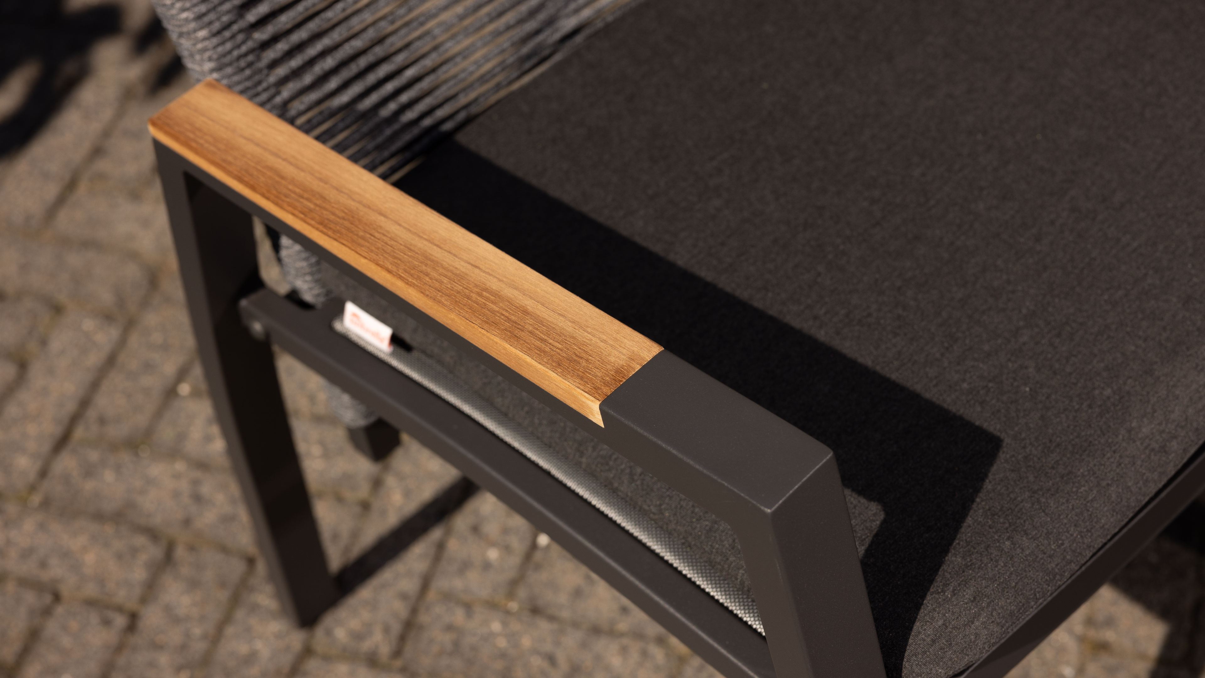 Der Positionsstuhl aus der Interliving Gartenmöbel Serie 7011 kombiniert moderne Funktionalität mit hochwertigem Materialmix und natürlicher Eleganz. Die stilvolle Verbindung aus anthrazitfarbener Rope- und TEXTILENE®-Bespannung, einem pulverbeschichteten Aluminiumgestell und edlen Teakholzeinlagen in den Armlehnen macht diesen Outdoor-Armlehnstuhl zu einem echten Blickfang für Terrasse, Balkon oder Garten.