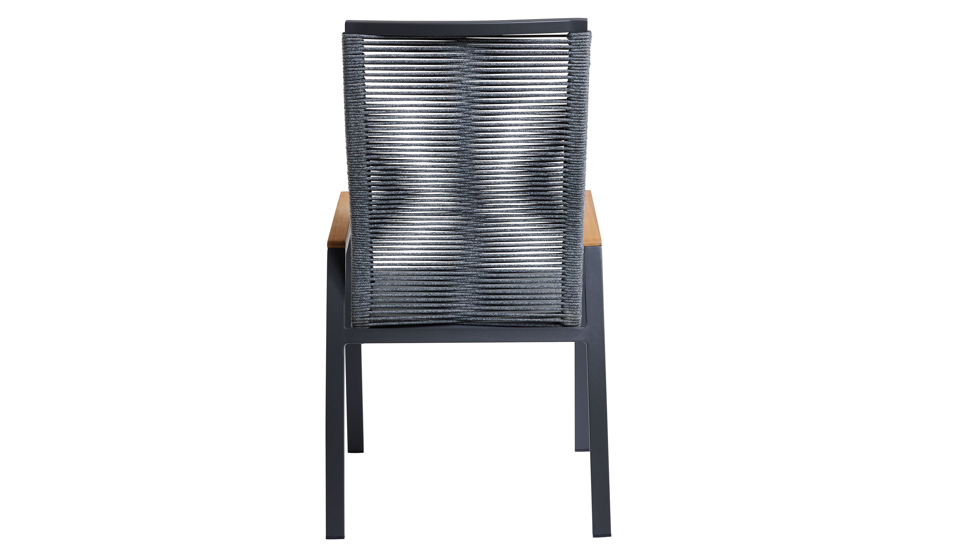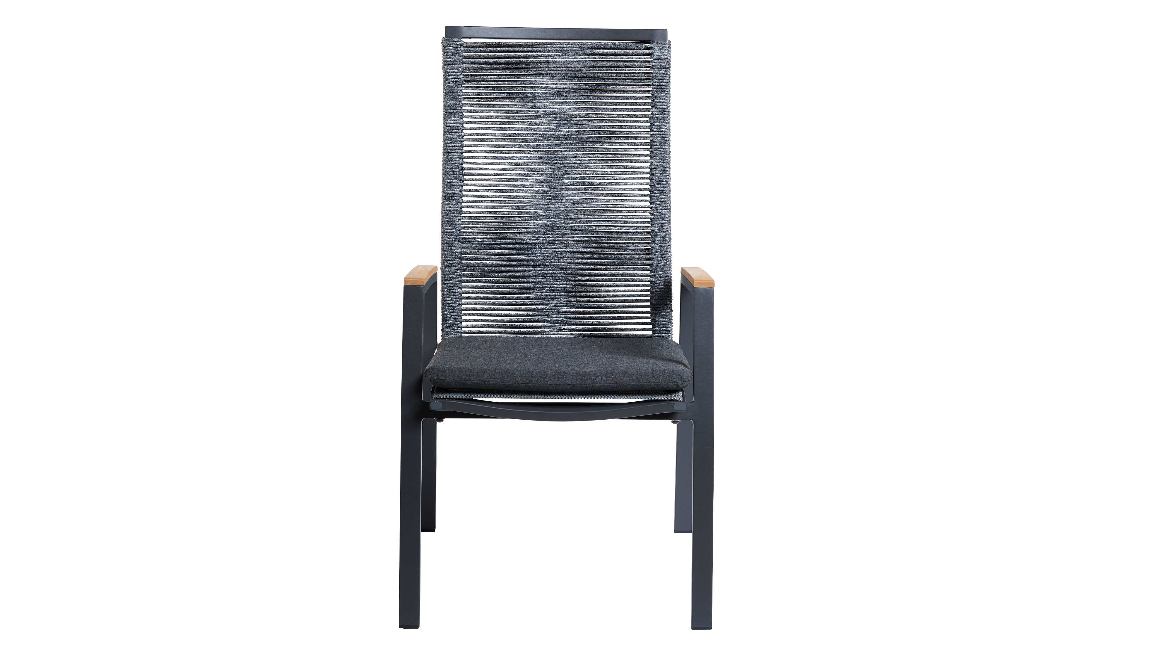 Die ergonomisch geformte Rückenlehne mit robuster Rope-Bespannung bietet stabilen Halt und eine angenehme Haptik. Die Sitzfläche aus hochwertigem TEXTILENE® ist UV-beständig, reißfest, wetterfest, schnelltrocknend und resistent gegen Mikroorganismen – ideal für den ganzjährigen Einsatz im Freien. Ein Outdoor-Armlehnstuhl, der durch Langlebigkeit und Pflegeleichtigkeit überzeugt.
