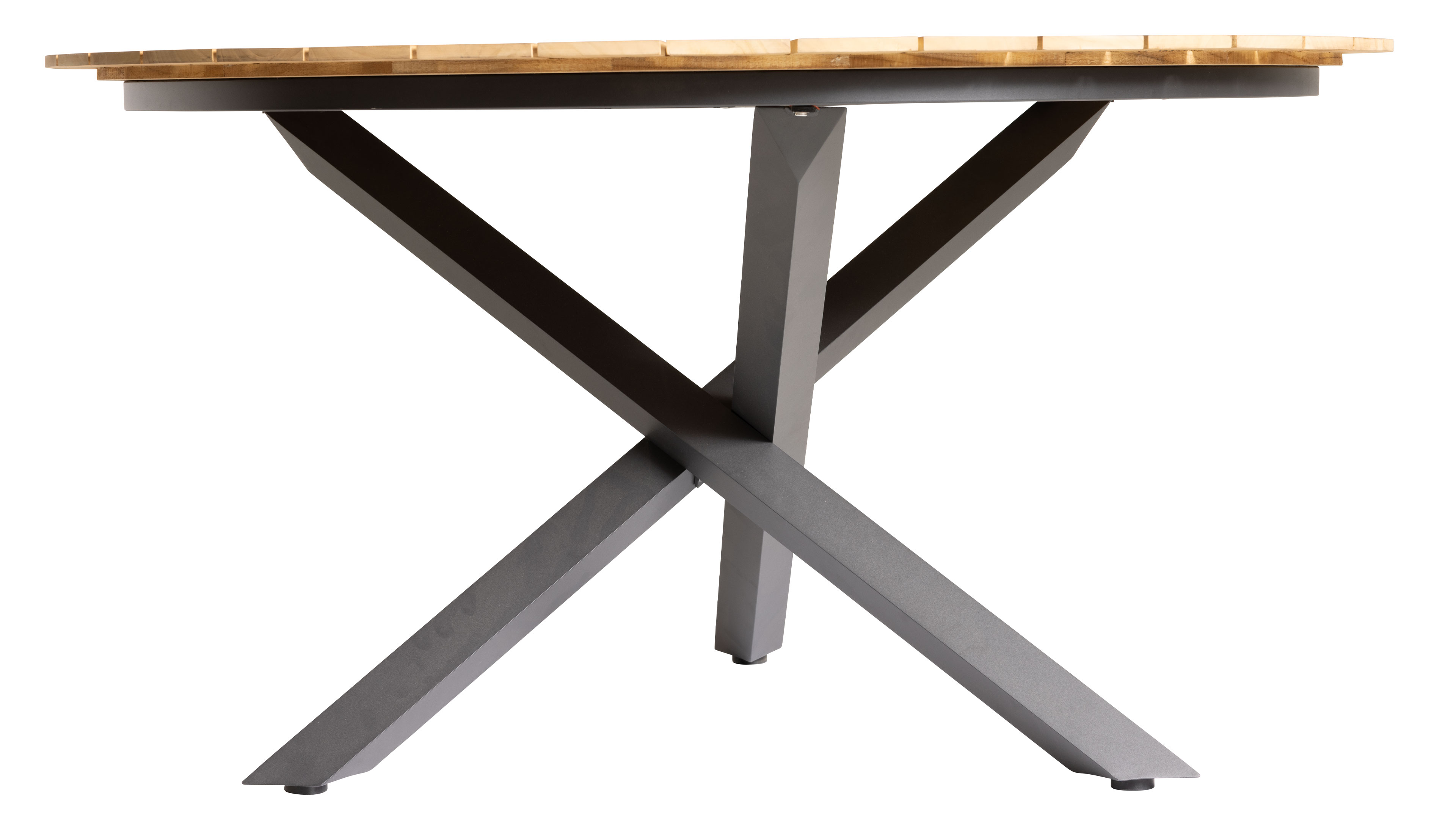 Die runde Tischplatte aus massivem Teakholz ist nicht nur ein echter Blickfang, sondern auch besonders widerstandsfähig gegenüber Witterungseinflüssen. Das Gestell aus matt anthrazitfarben pulverbeschichtetem Aluminium ist korrosionsbeständig, UV-beständig und pflegeleicht – perfekt für den dauerhaften Einsatz im Freien. So wird der Terrassentisch zum langlebigen Begleiter für viele Sommer.