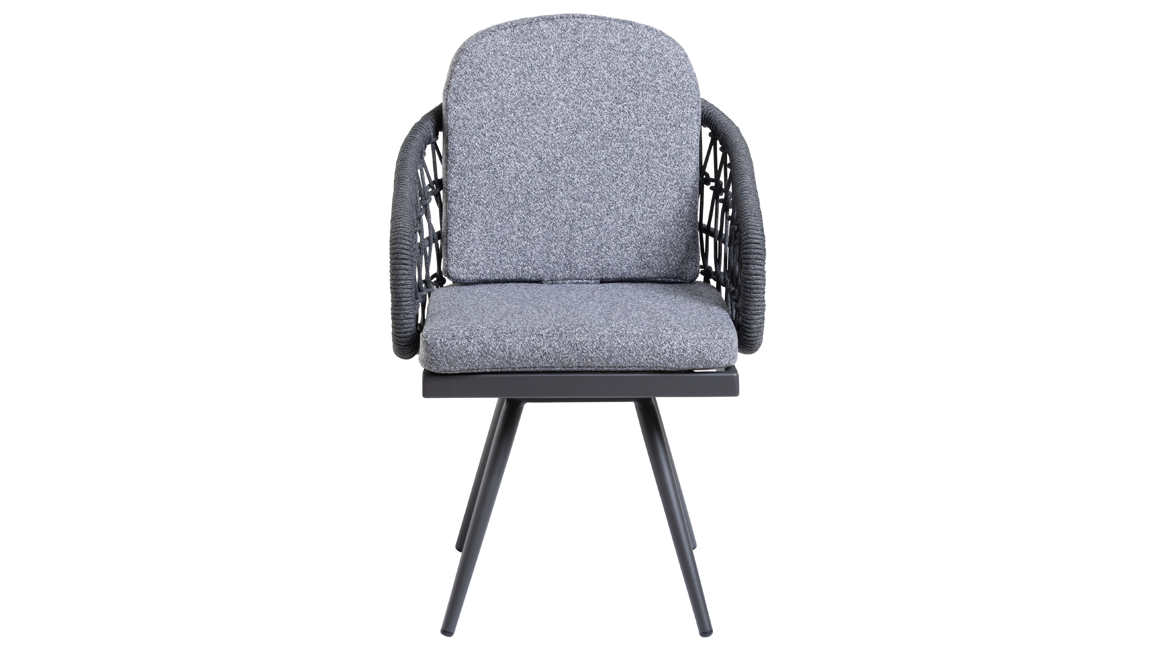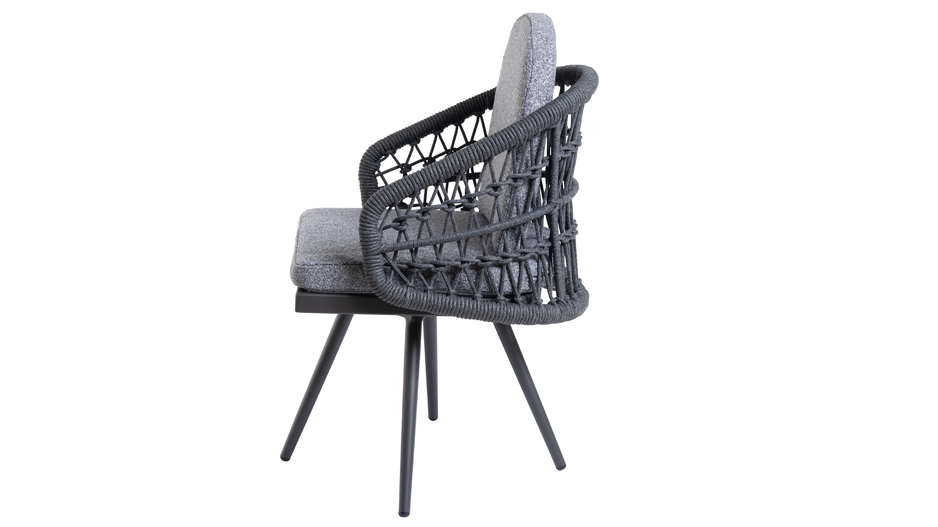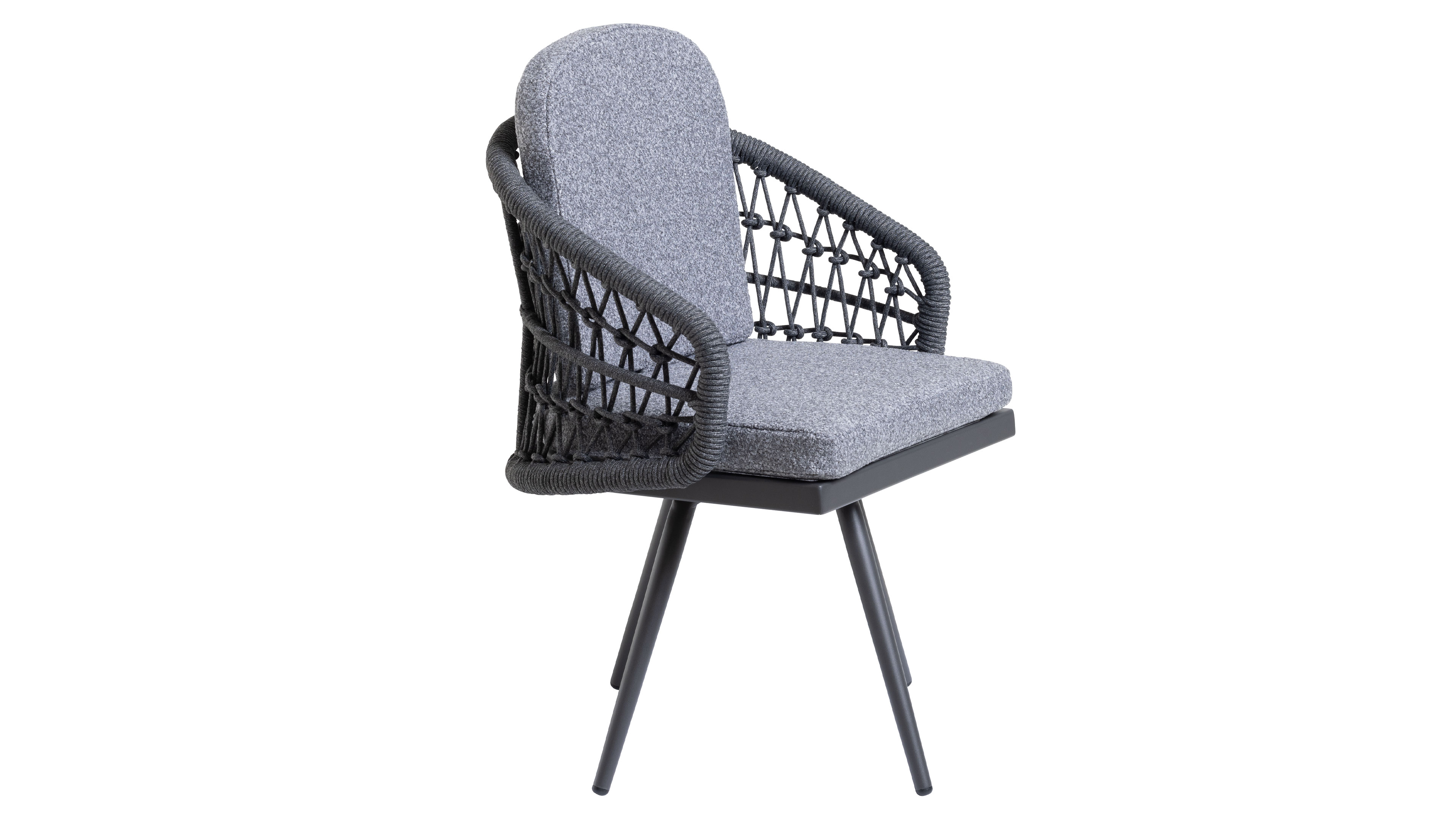 Eleganter Gartenstuhl mit grauer Sitzschale, komfortabler Polsterung, dekorativer Rope-Bespannung und praktischer Drehfunktion