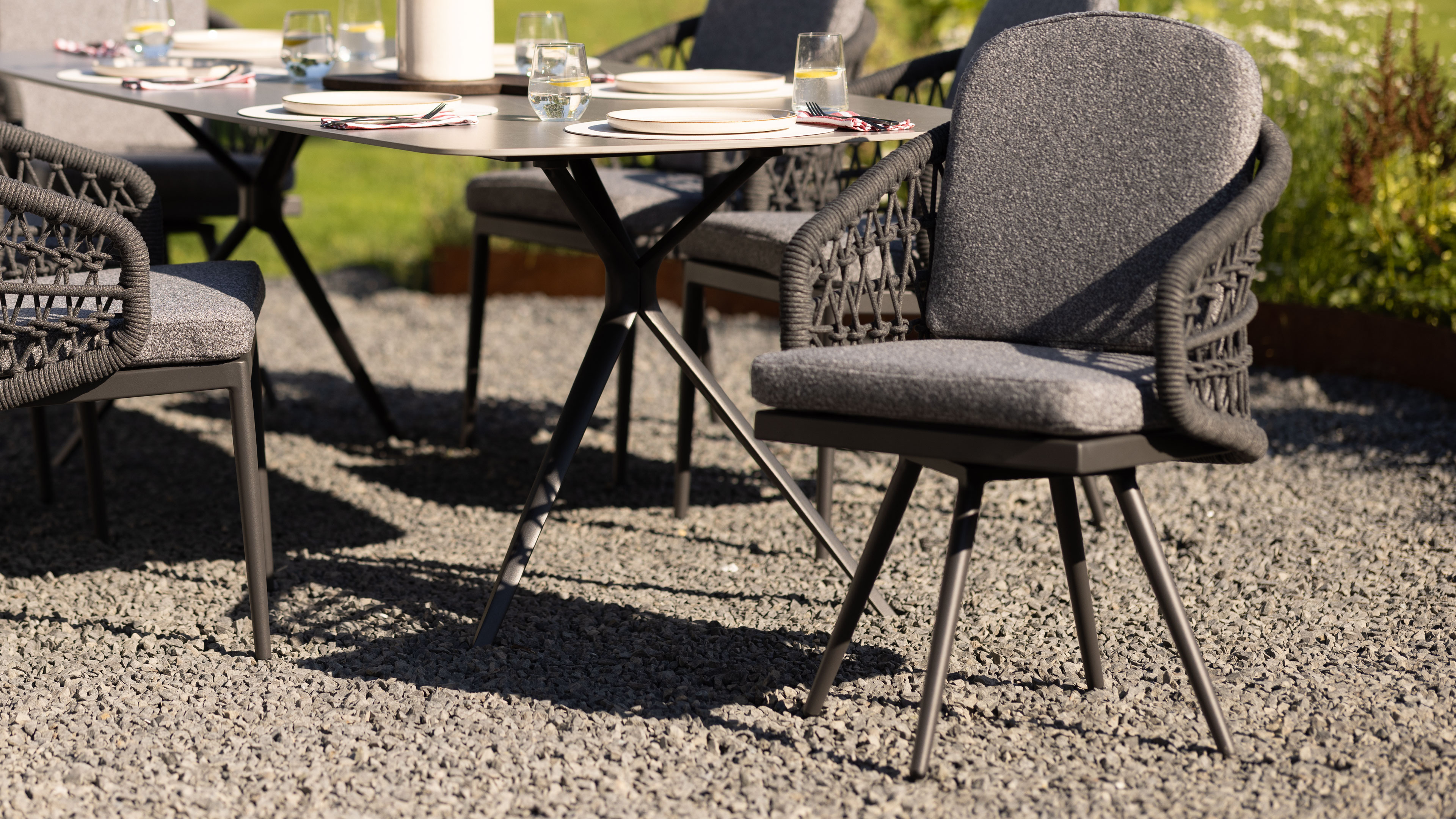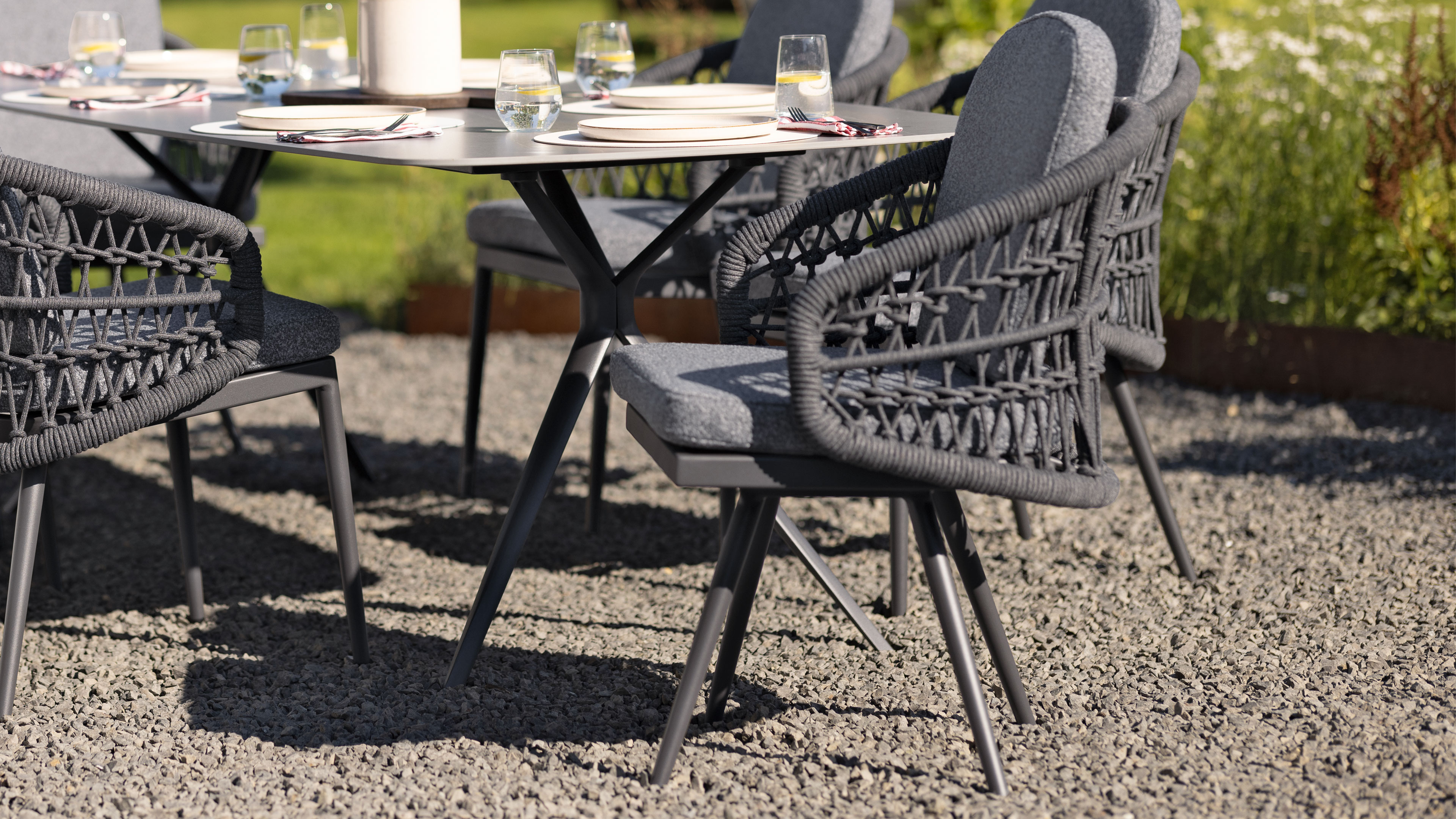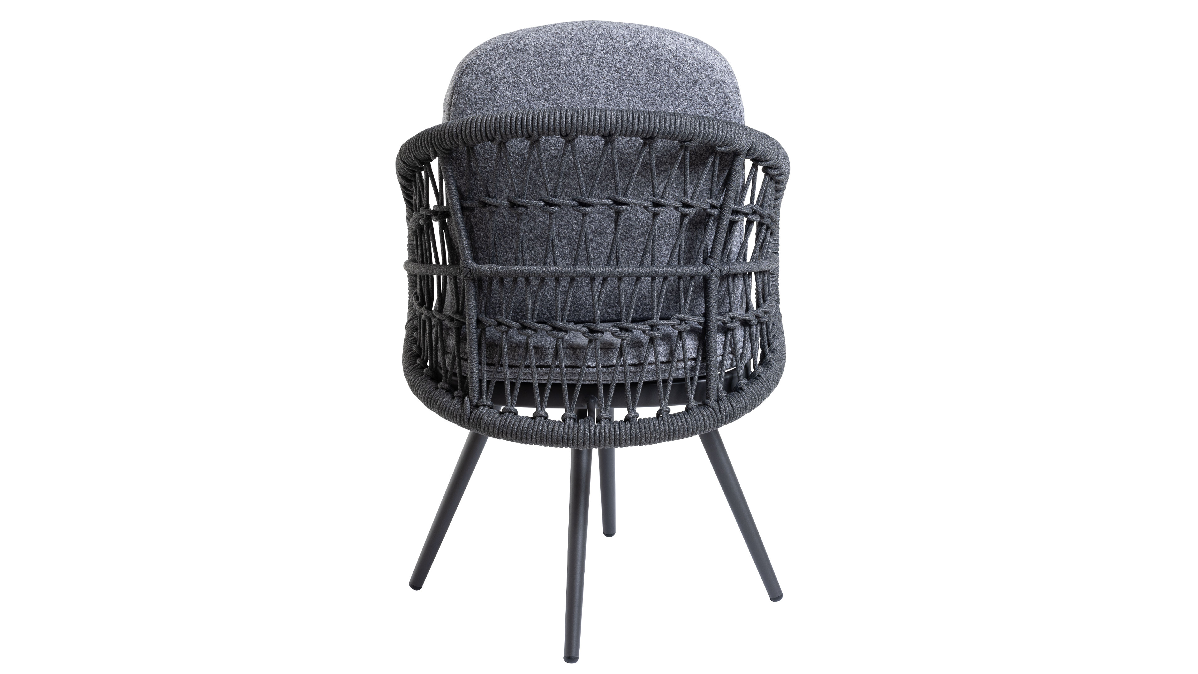 Eleganter Gartenstuhl mit grauer Sitzschale, komfortabler Polsterung, dekorativer Rope-Bespannung und praktischer Drehfunktion
