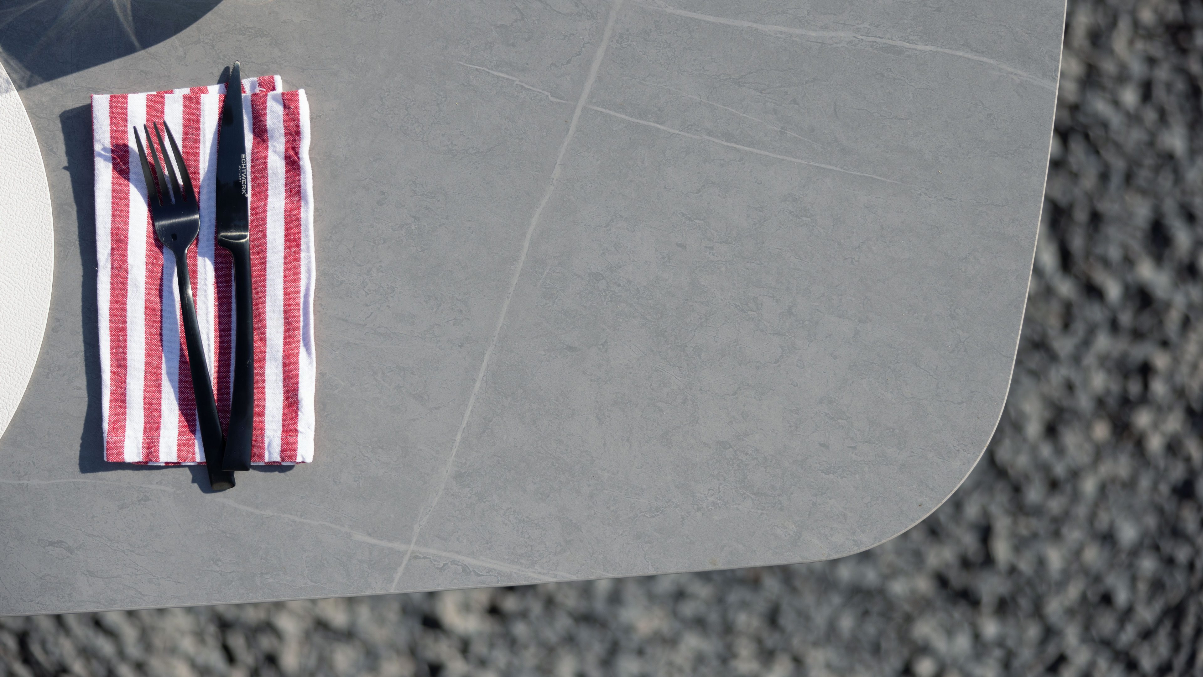 Die Tischplatte aus grauem gesintertem Stein (Sintered Stone) bietet nicht nur eine edle Optik, sondern überzeugt durch extreme Belastbarkeit. Kratzfest, stoßfest, UV- und farbbeständig sowie wetterfest – das Material ist wie gemacht für den dauerhaften Einsatz im Freien. Damit eignet sich der Gartentisch ideal für wechselnde Wetterbedingungen und intensive Nutzung.