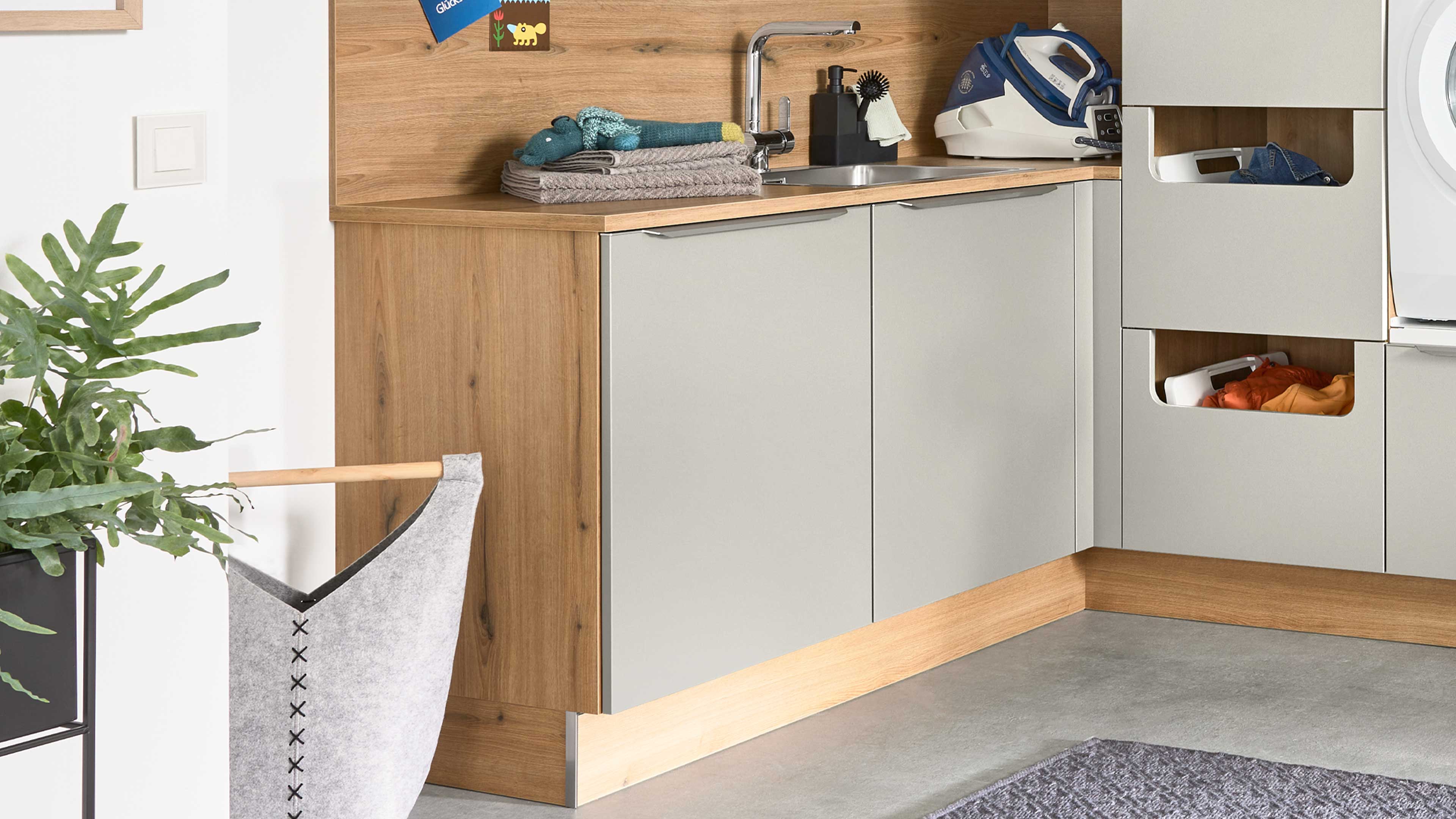 Hauswirtschaftsraum mit modernen grauen Fronten, Holzdetails und cleverem Stauraumkonzept