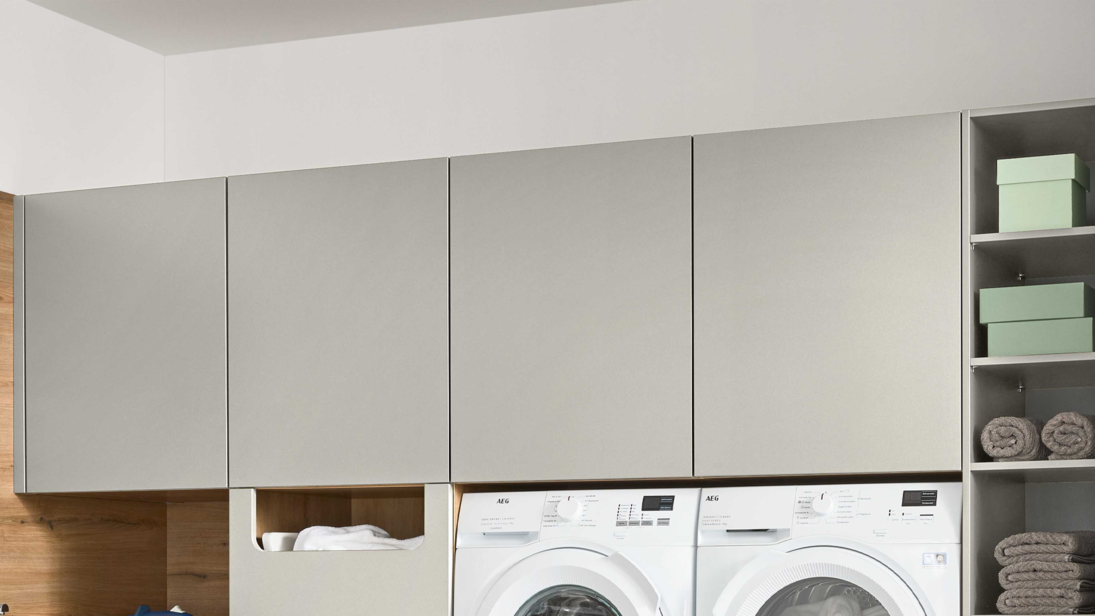 Hauswirtschaftsraumlösung aus der Interliving Küche Serie 3087 – stilvolle Stauraummöbel in Platingrau und Eiche Ventura