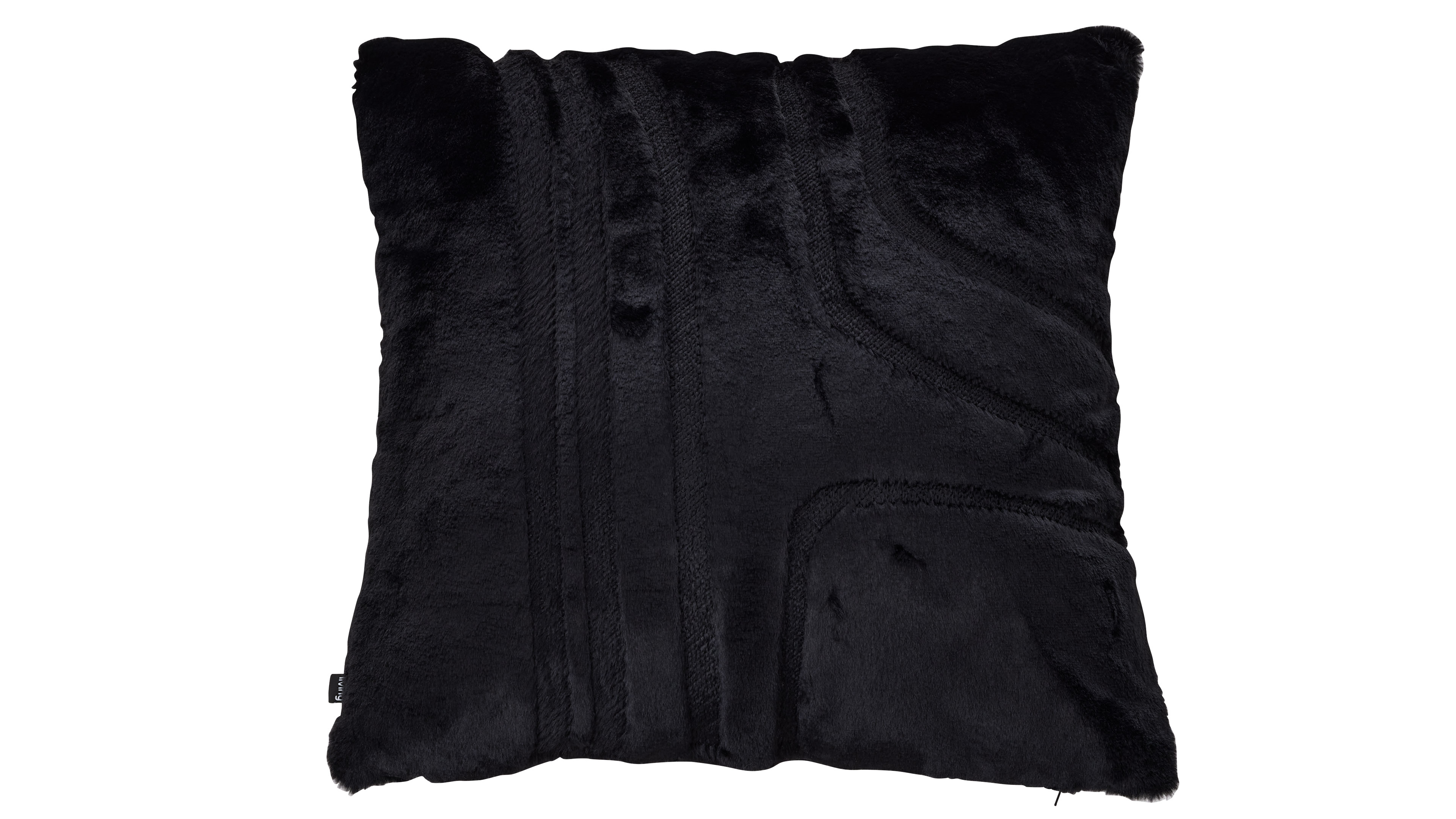 Die Vorderseite der Kissenhülle besteht aus geschnittenem schwarzen Kunstfell mit einem dezenten, grafischen Muster, das dem Kissen eine elegante Struktur und Tiefe verleiht. Die Rückseite aus schwarzem Wirksamt fühlt sich besonders weich an und ist mit einem verdeckten Reißverschluss versehen – für ein sauberes Erscheinungsbild und leichtes Beziehen. Die Lieferung erfolgt ohne Füllung, sodass du dein Kissen individuell gestalten kannst.