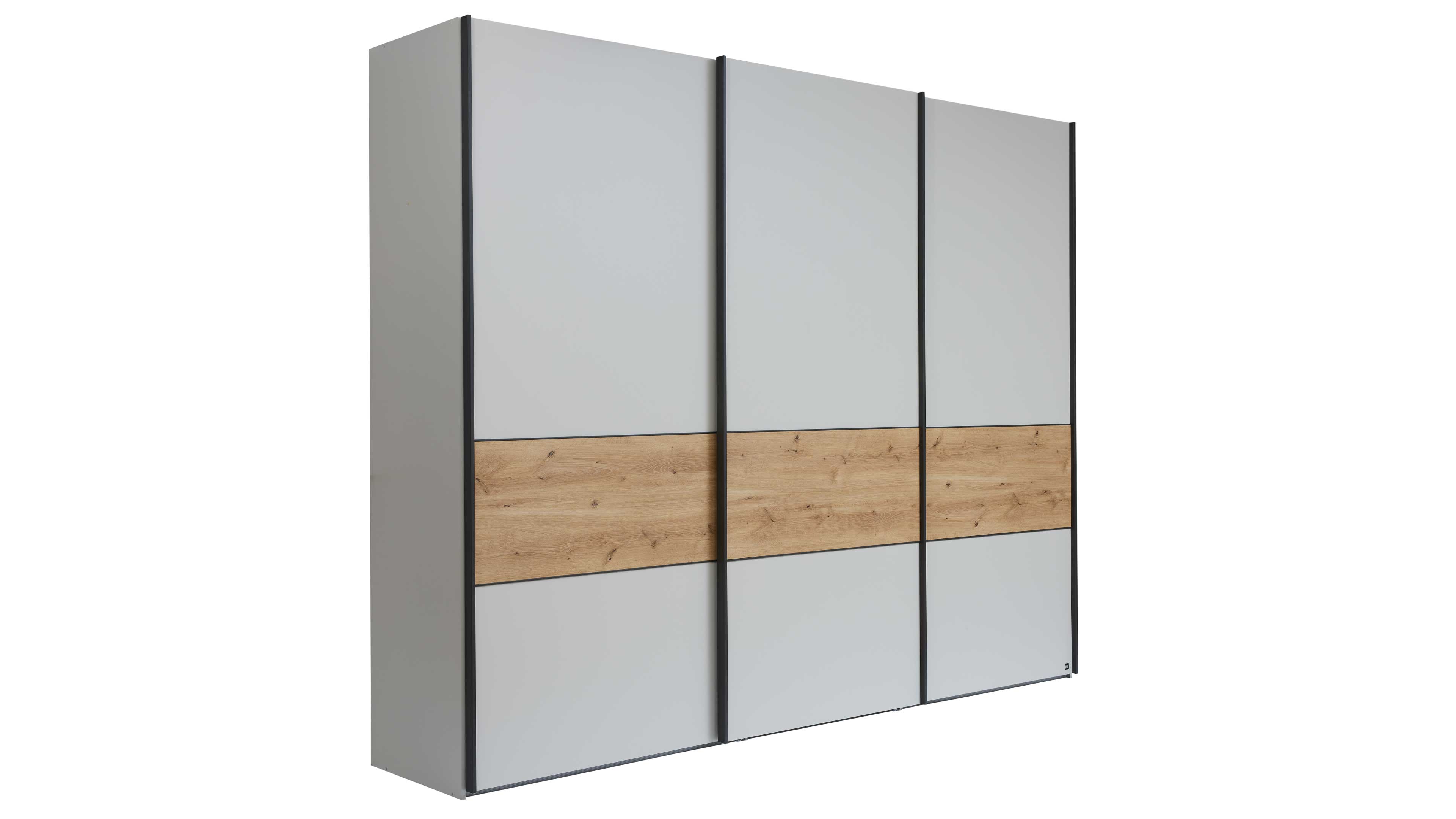 Schwebetürenschrank in Sand matt mit durchgehender Absetzung in Eiche-Nachbildung