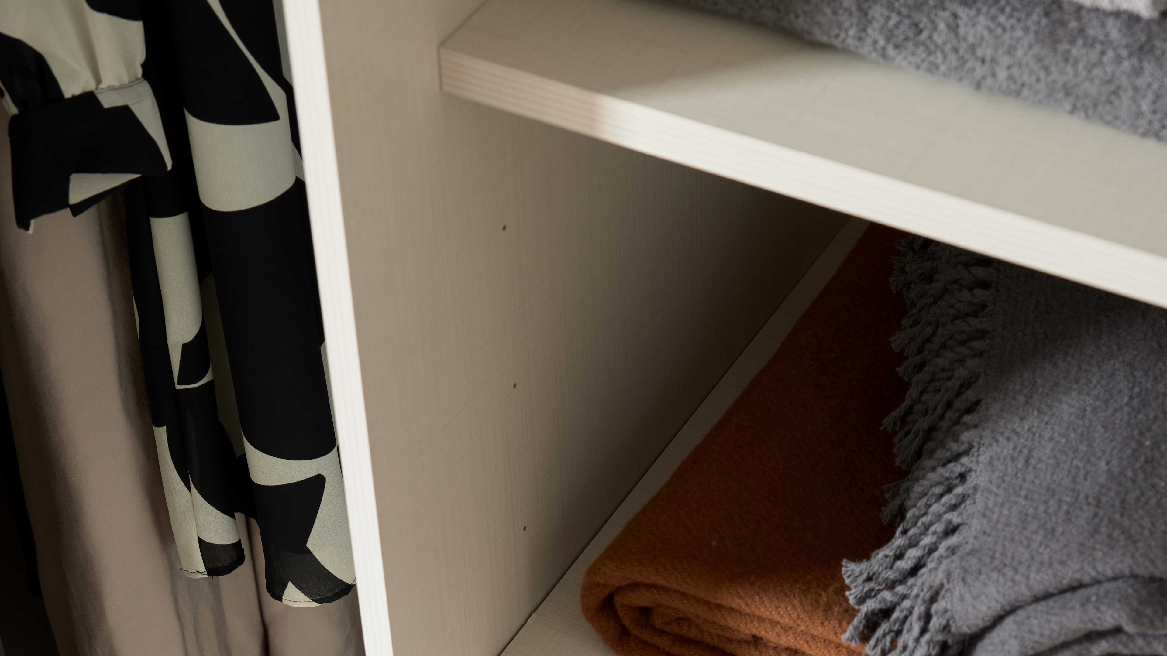 Die beiden Schwebetüren lassen sich dank ihres innovativen Führungssystems besonders leicht und leise bewegen – das sorgt jeden Tag für ein angenehm ruhiges Bediengefühl. Innen überzeugt der Schrank mit einer durchdachten Aufteilung: Mittig findest du zwei Kleiderböden und eine Kleiderstange, rechts und links außen jeweils sechs Fächer mit höhenverstellbaren Einlegeböden. So kannst du Kleidung, Accessoires und Bettwäsche ordentlich verstauen. Mit seinen Maßen von ca. 270 x 222 x 68 cm (B/LxHxT) passt der Schrank großzügig, aber harmonisch in dein Schlafzimmer.