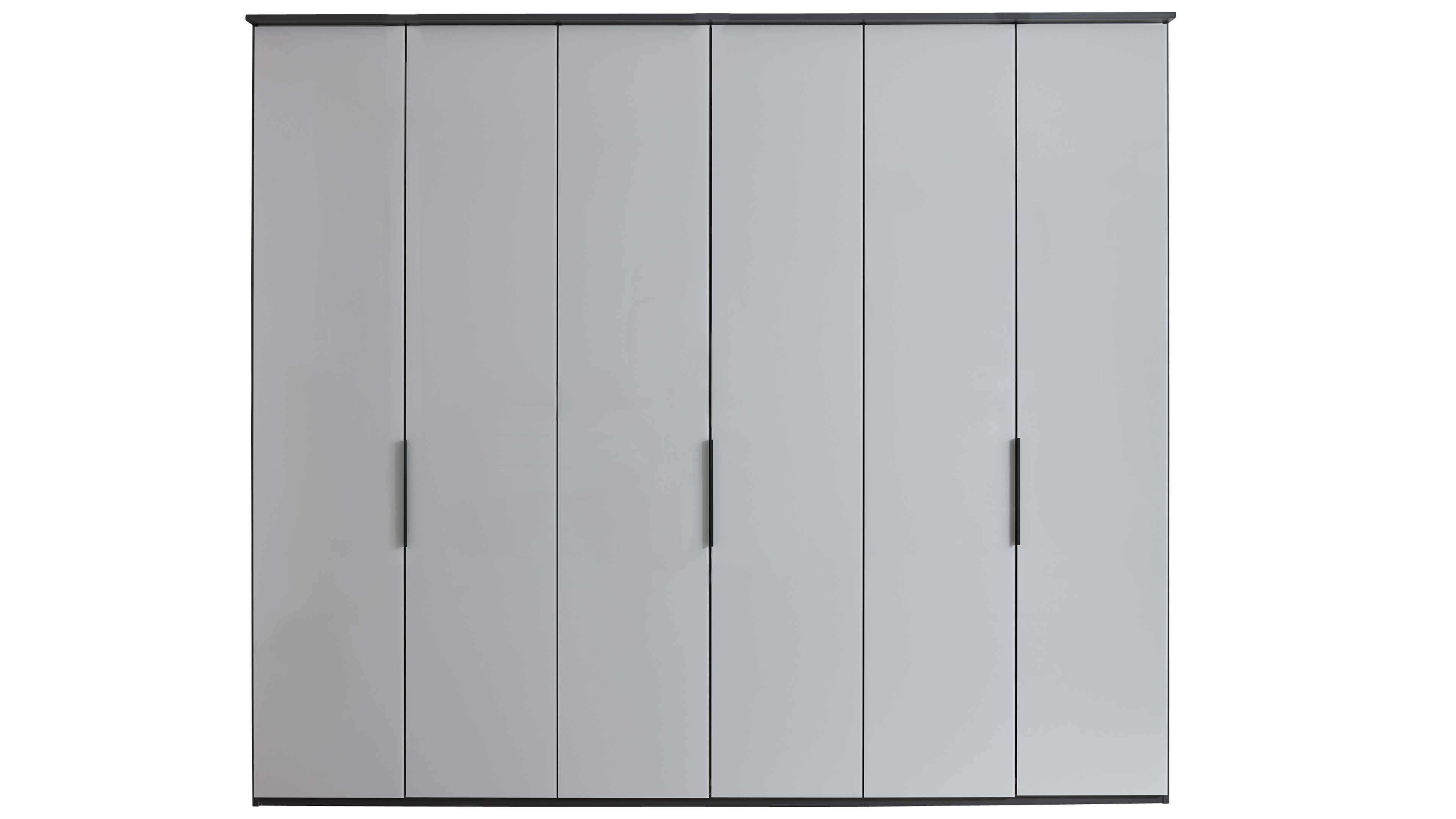 Der Kleiderschrank bringt Ordnung und Eleganz in dein Schlafzimmer. Mit seidengrauen Glasauflagen-Fronten, einem basaltfarben lackierten Korpus und anthrazitfarbenen Metallgriffen Basic überzeugt er optisch auf ganzer Linie. Hinter seinen sechs Türen findest du sechs Einlegeböden und drei stabile Metall-Kleiderstangen – perfekt für Kleidung, Accessoires und Wäsche. Mit Maßen von ca. 299 x 229 x 60 cm (B/LxHxT) bietet er dir großzügigen Stauraum, ohne übermäßig viel Platz zu beanspruchen.