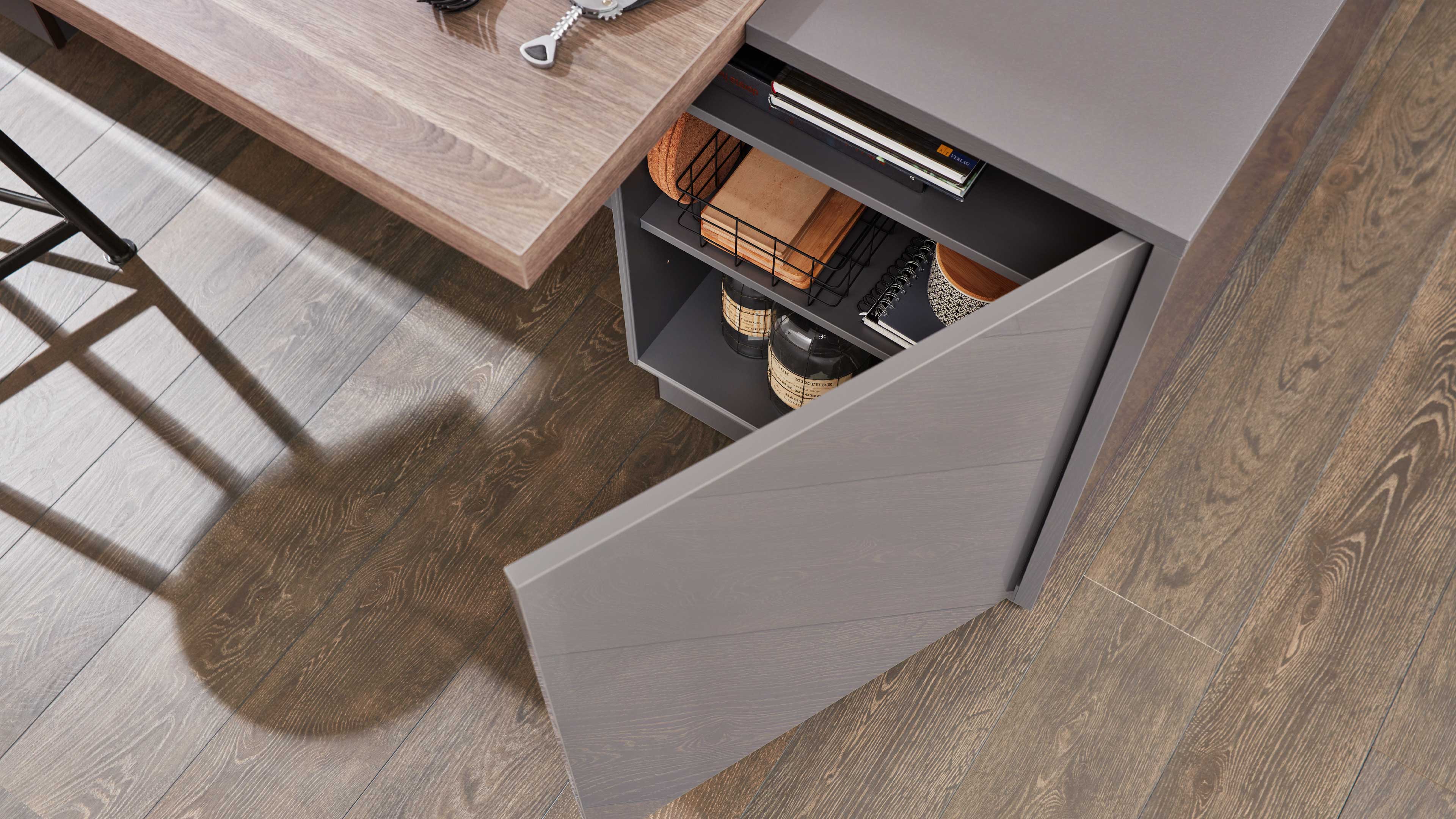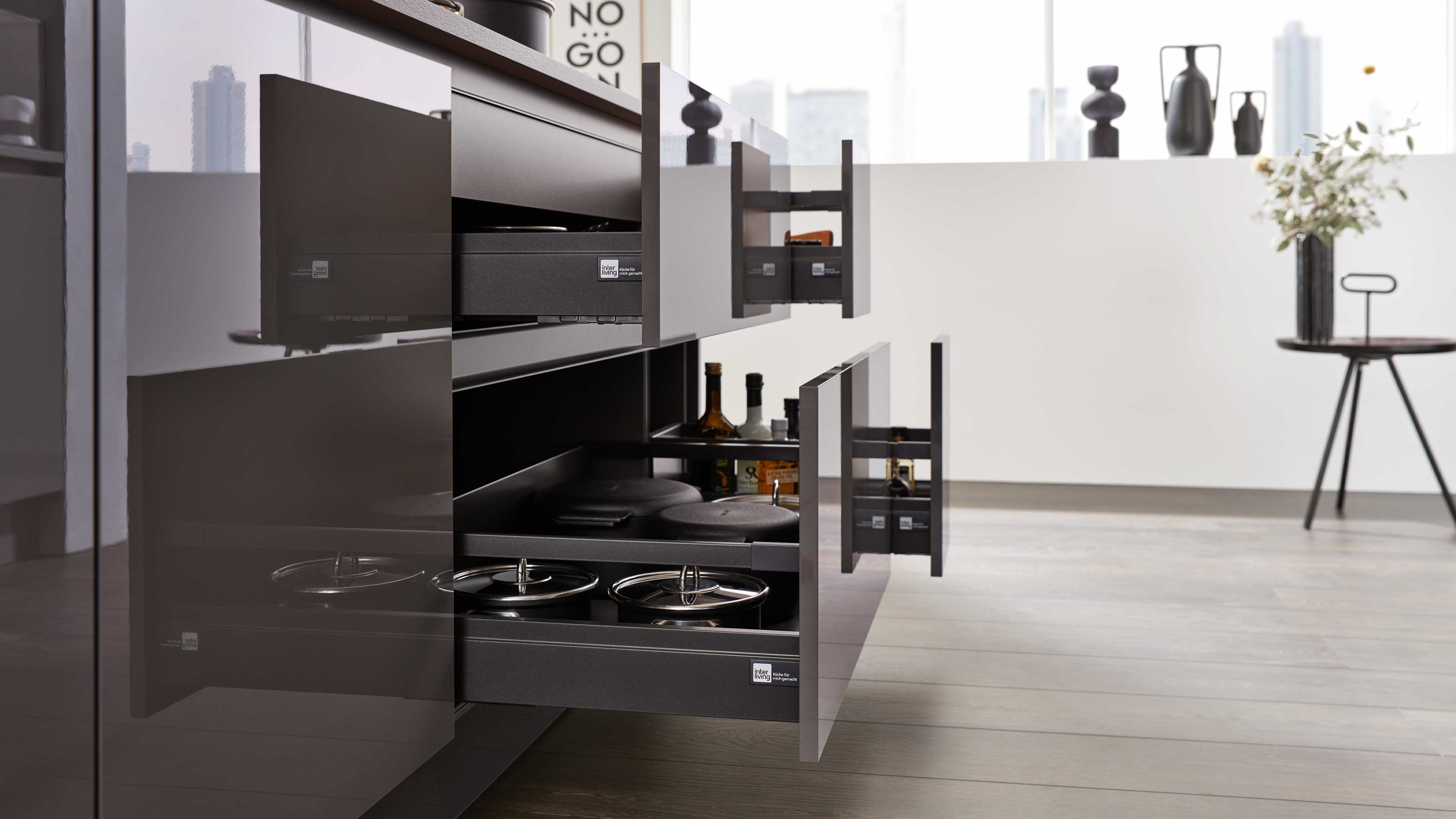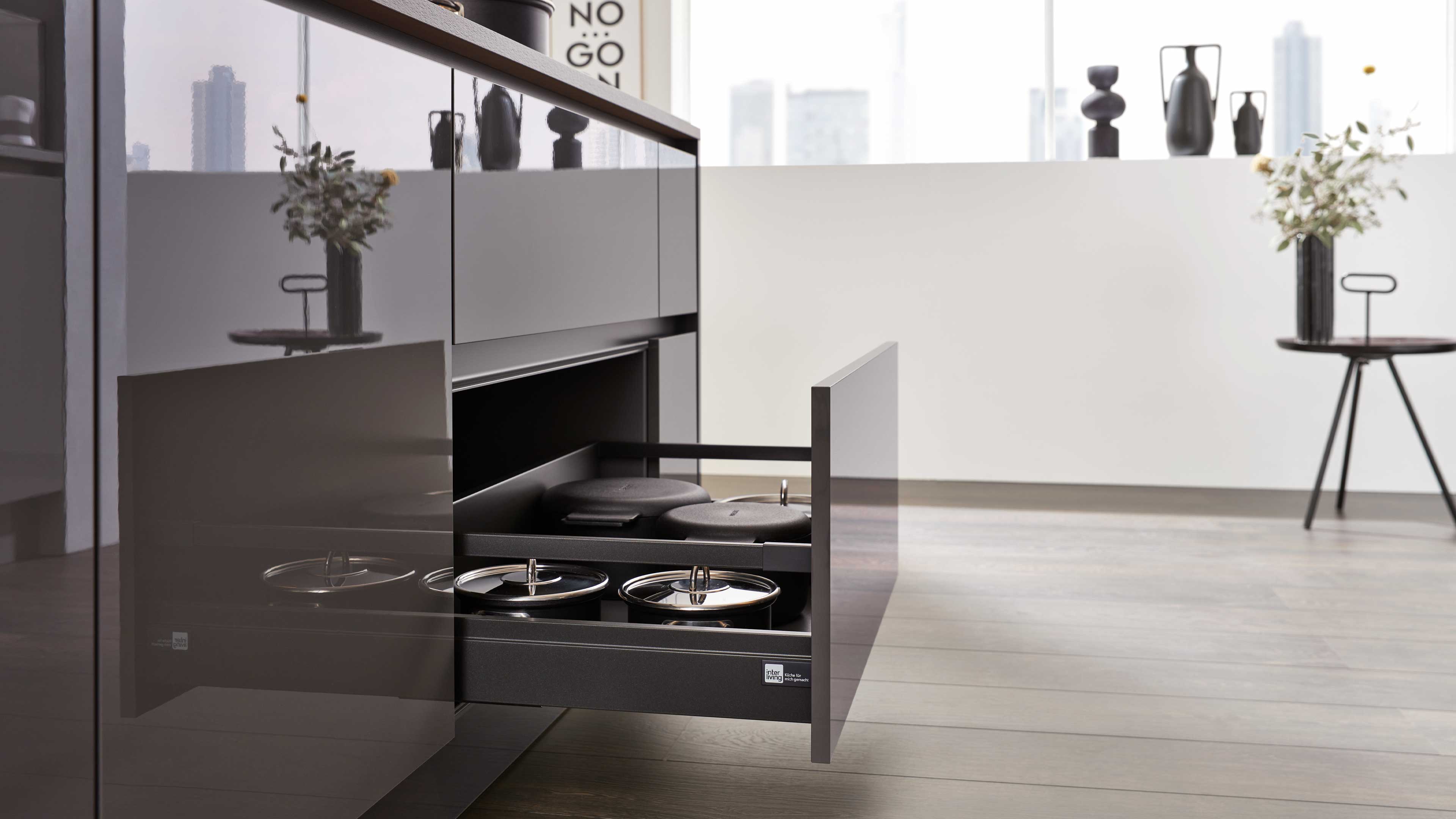 Interliving Küche Serie 3042 – elegante Hochglanzküche in Quarzgrau und Graphitsilber