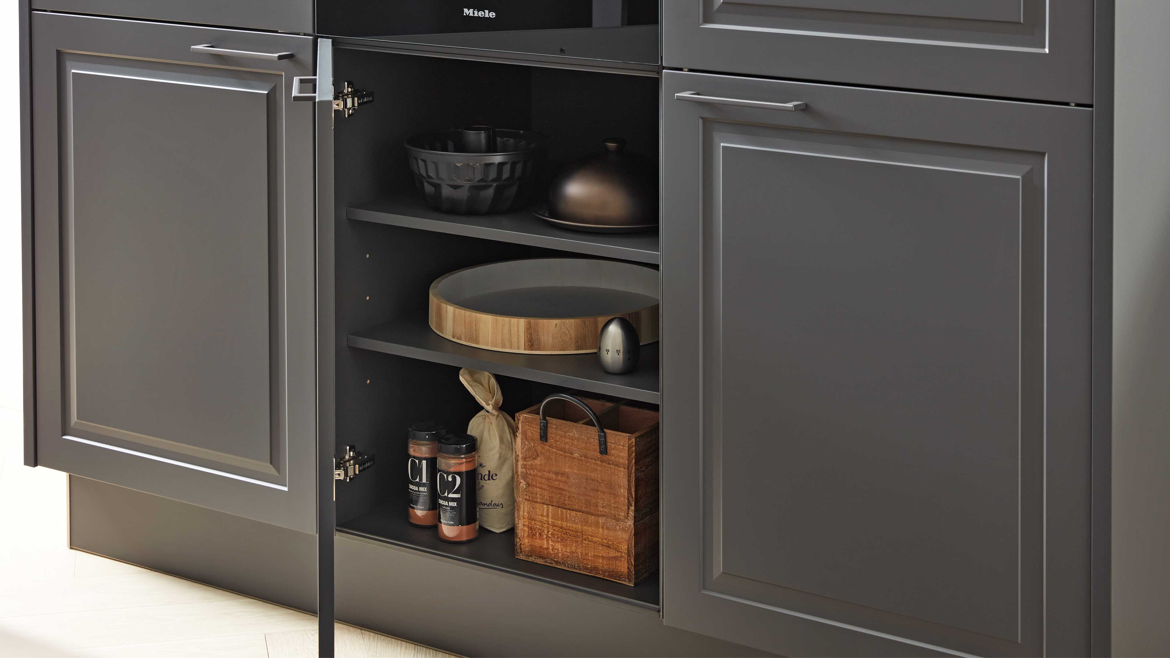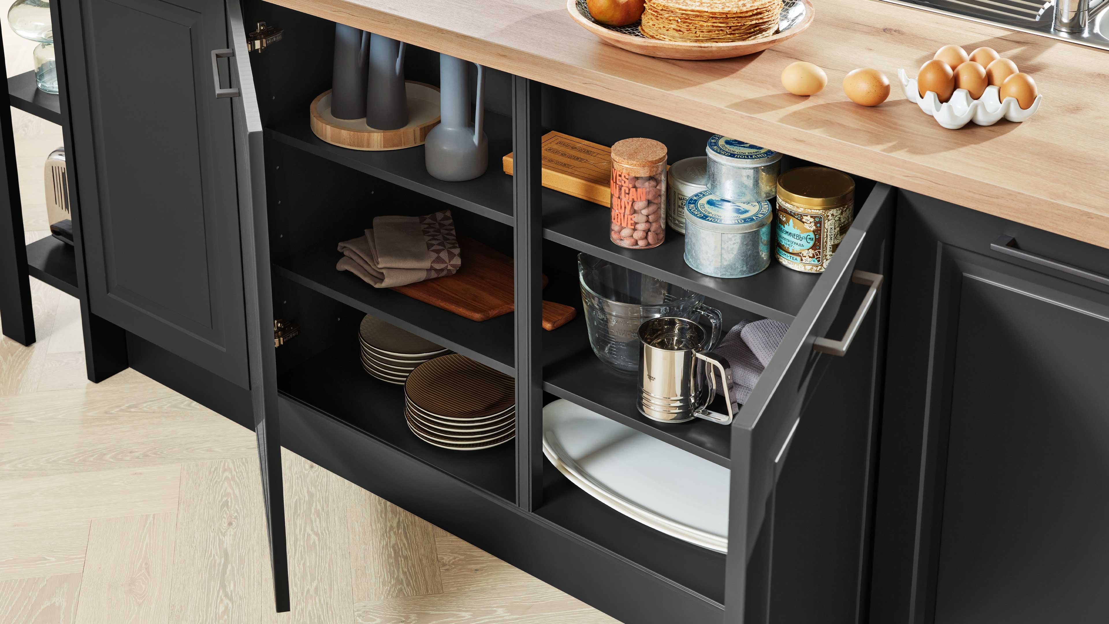 Die Interliving Küche Serie 3044 vereint modernen Landhauscharme mit natürlicher Wärme. Ihre graphitfarbenen Landhausfronten wirken edel und zeitlos, während die Kernbuche-Nachbildung bei Arbeitsplatten und Nischenrückwänden für eine behagliche Note sorgt. Korpusse und Sockelblenden in Graphit unterstreichen die elegante Wirkung, und die Regale in beiden Farbtönen fügen sich harmonisch ins Gesamtbild ein. Stilvolle Milchglasfronten bei den Oberschränken setzen zusätzliche Akzente, während softmatt graphitfarbene Griffe den Look perfekt abrunden.