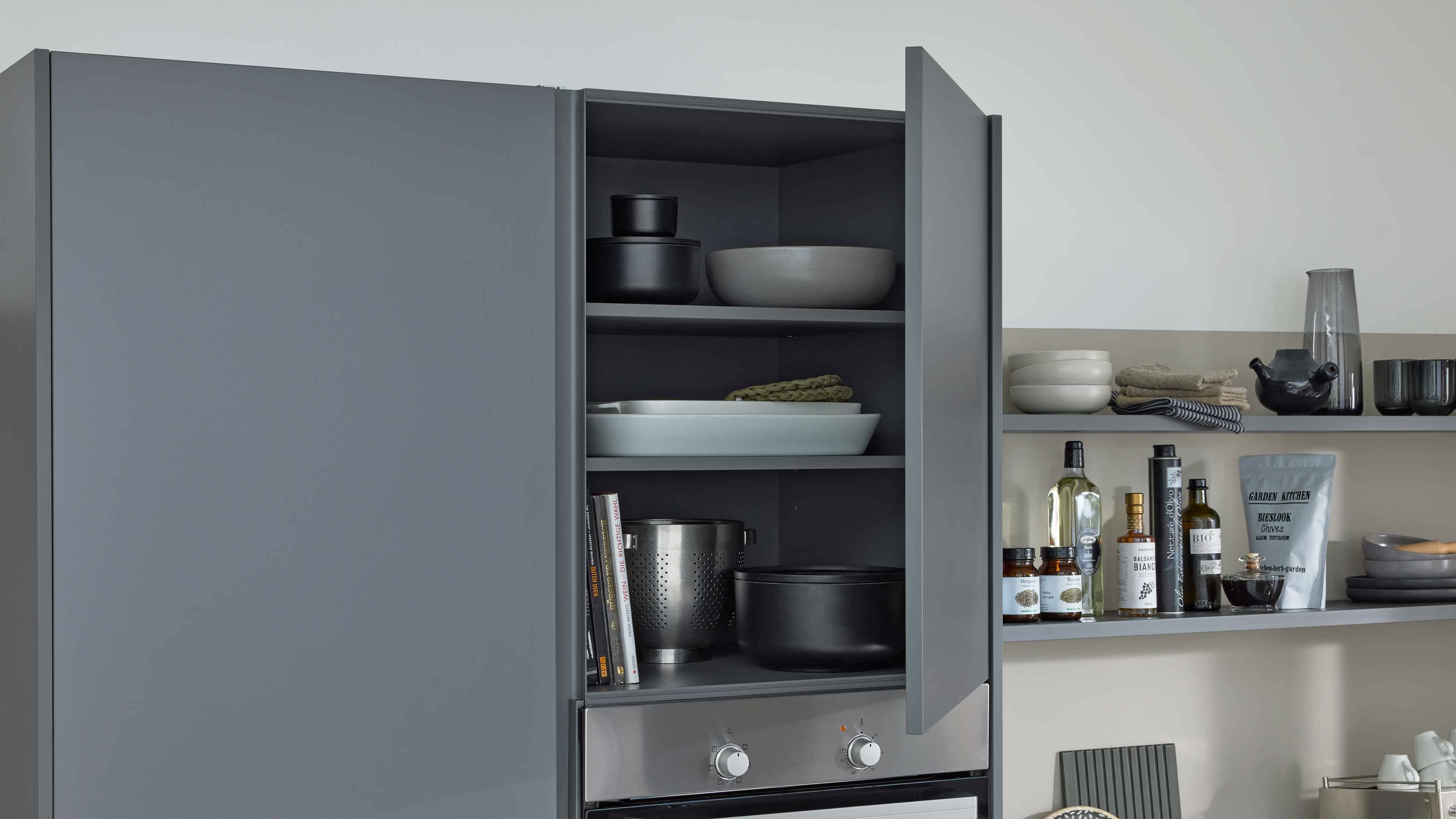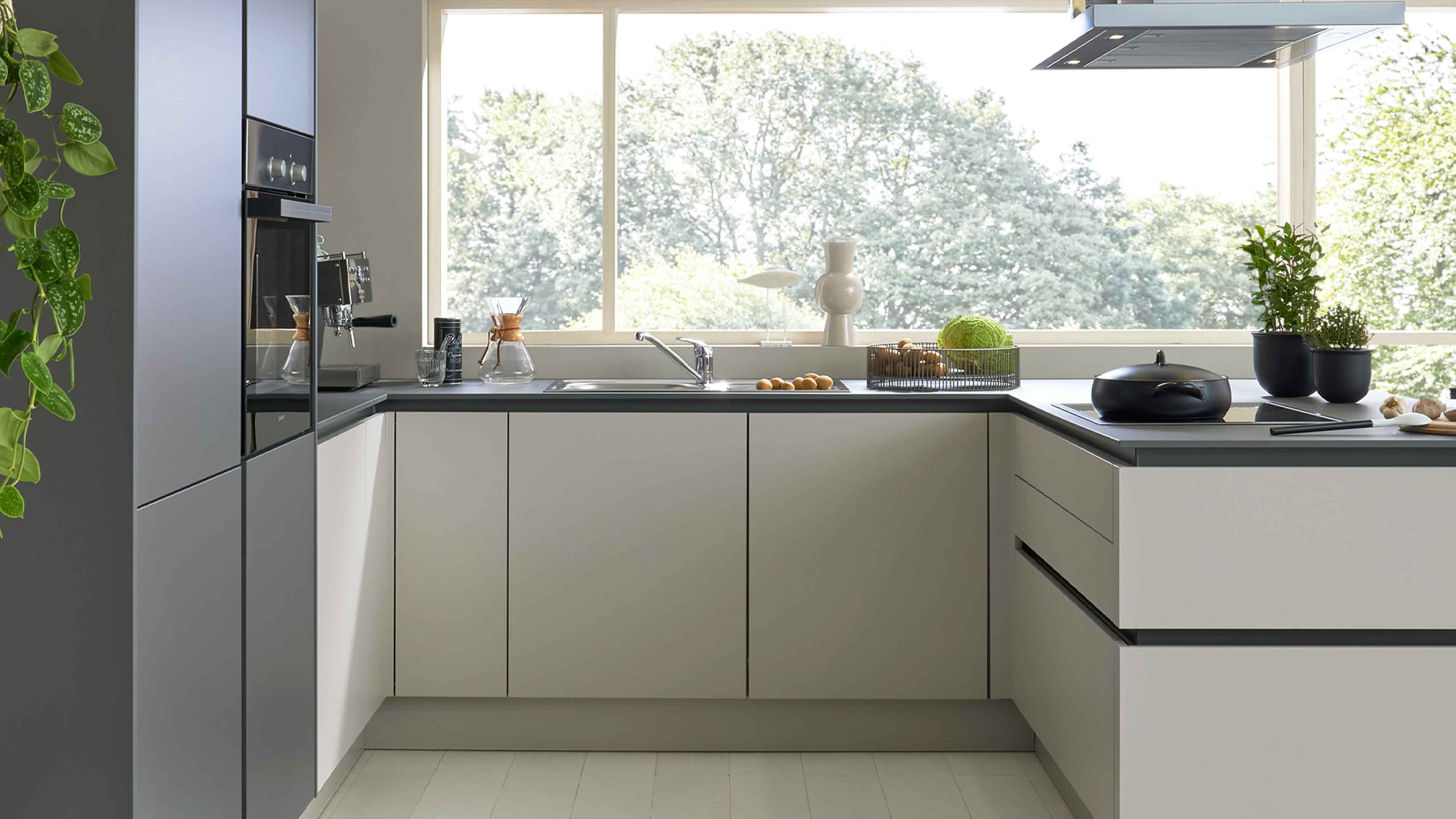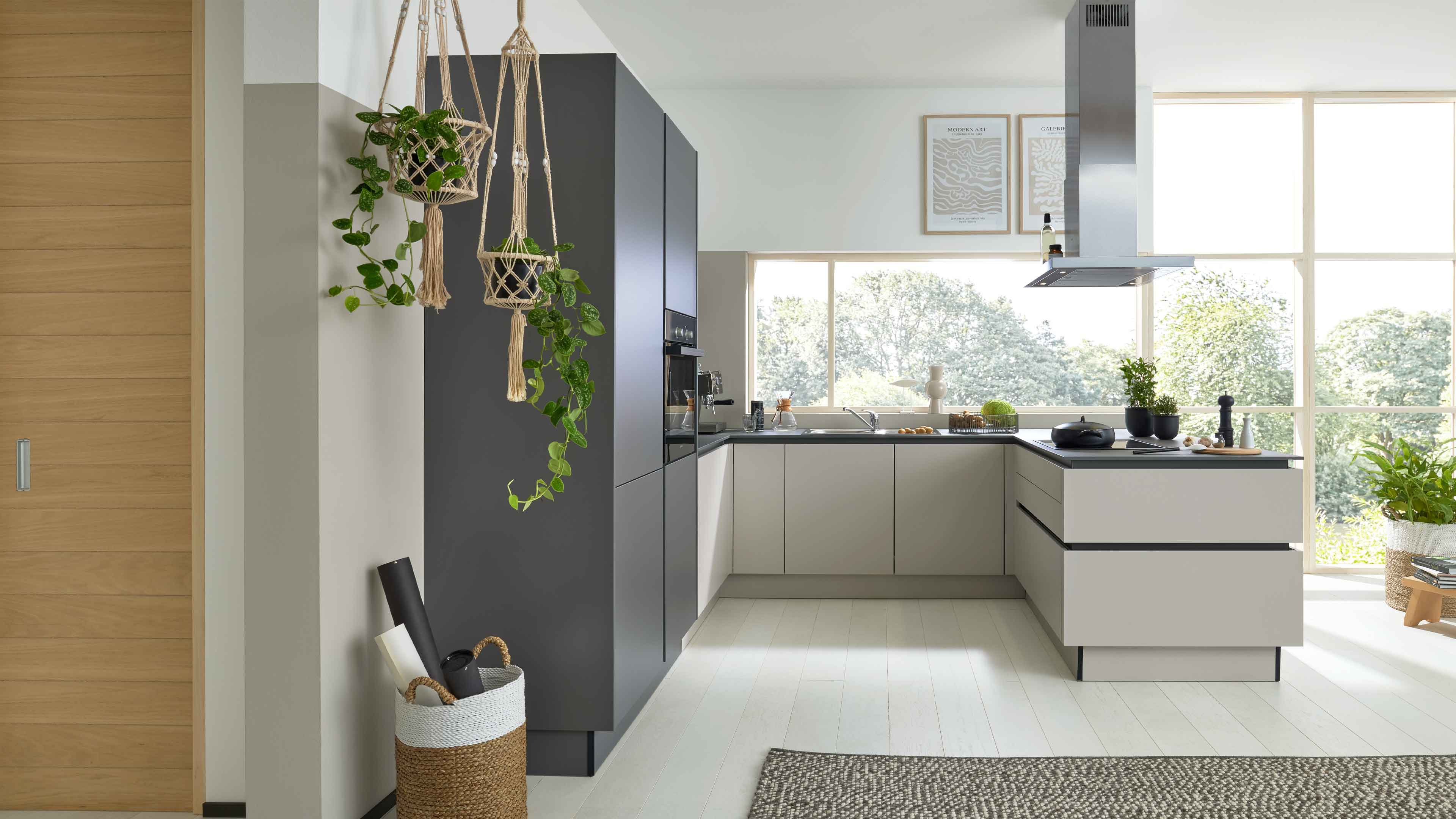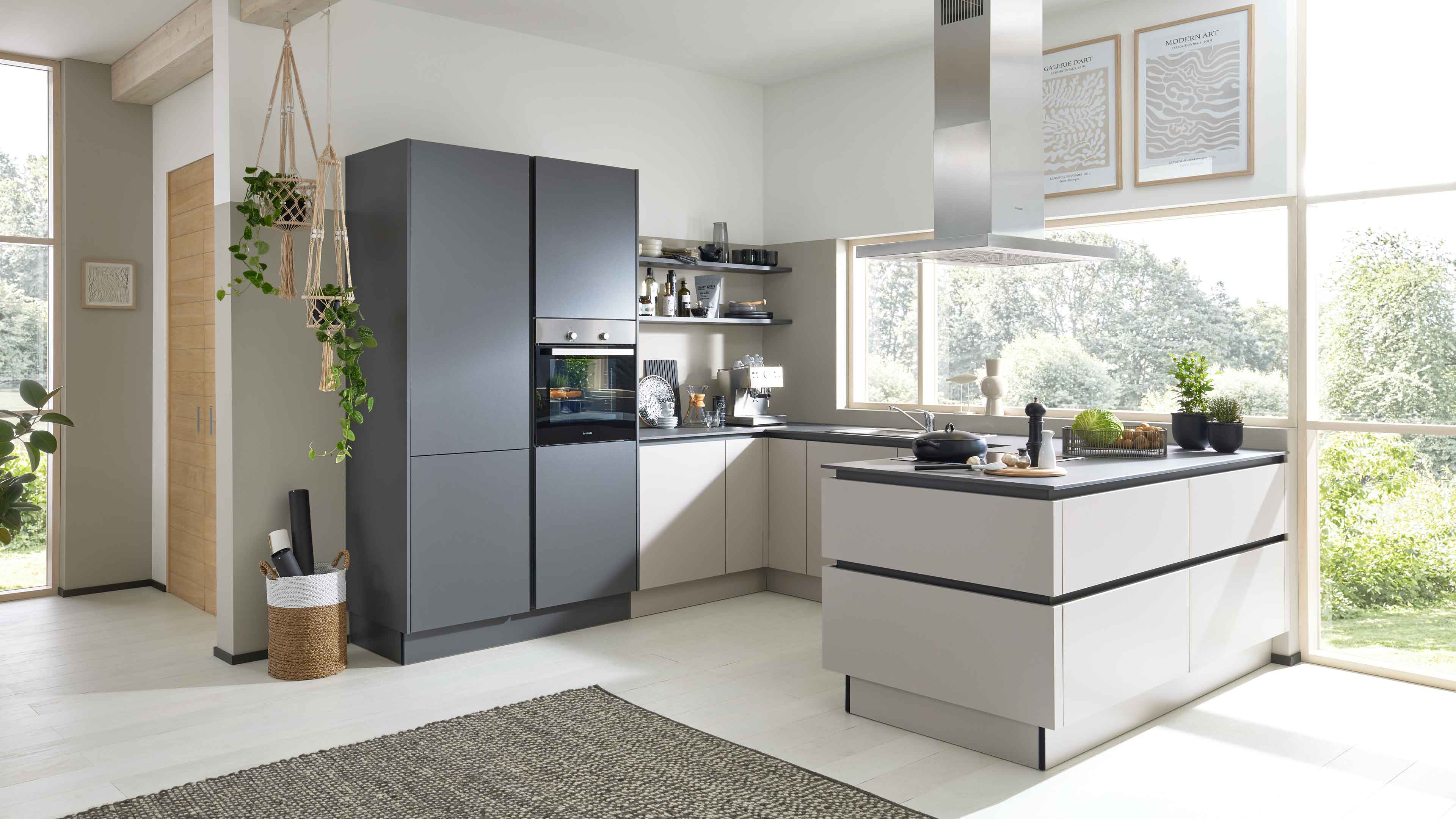 Interliving Küche Serie 3060 – elegante Systemküche in Sahara und Quarzgrau