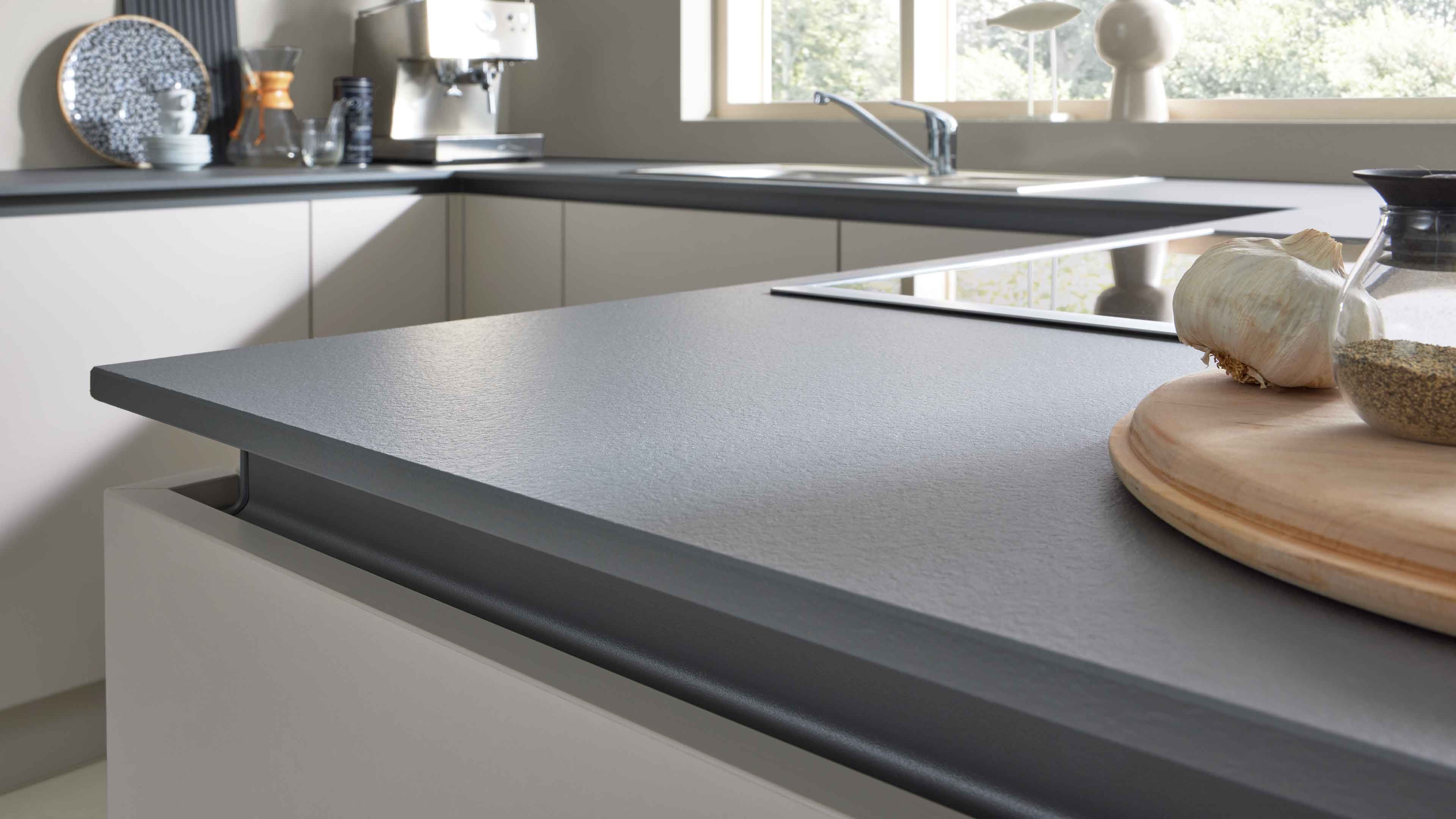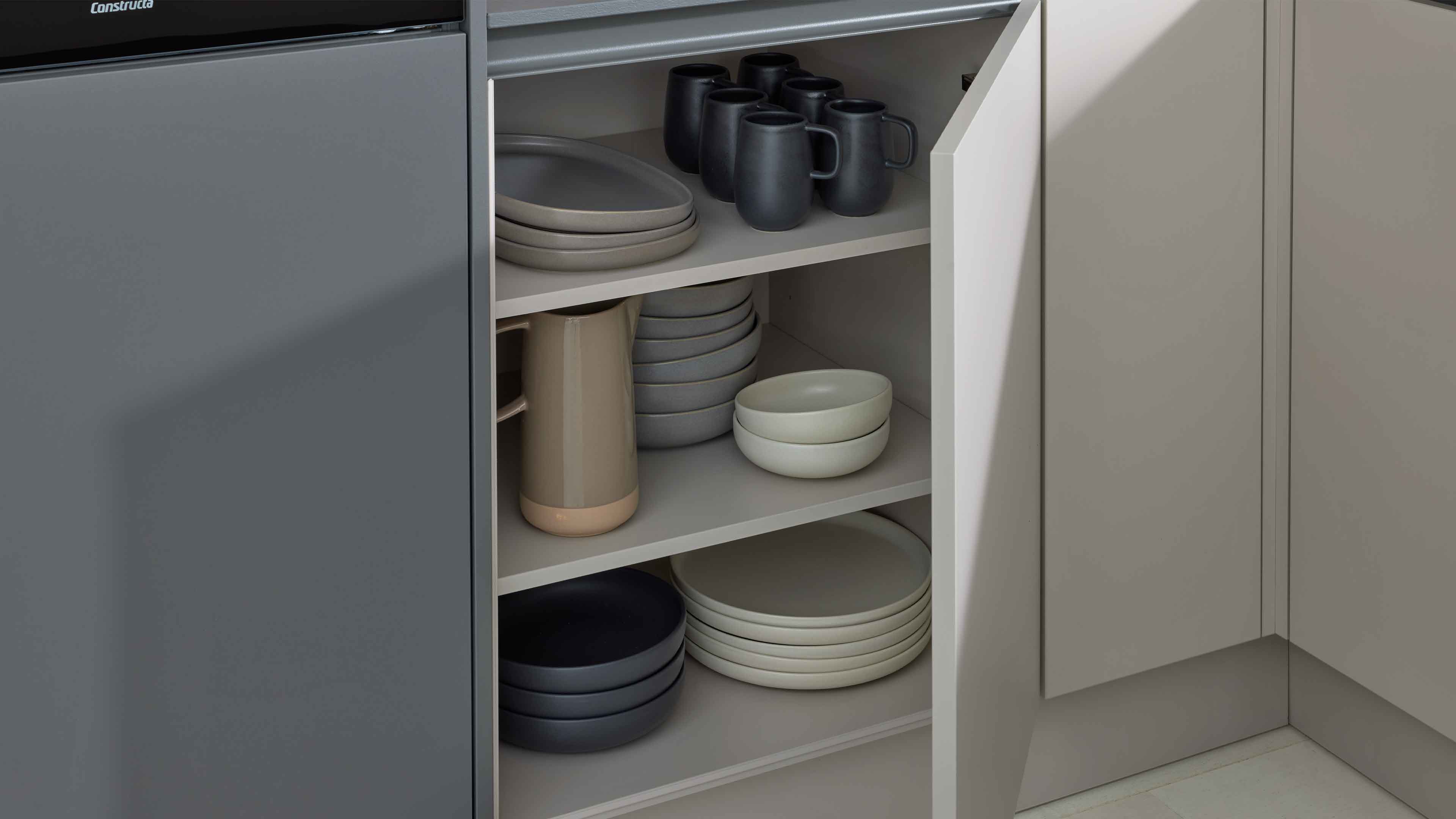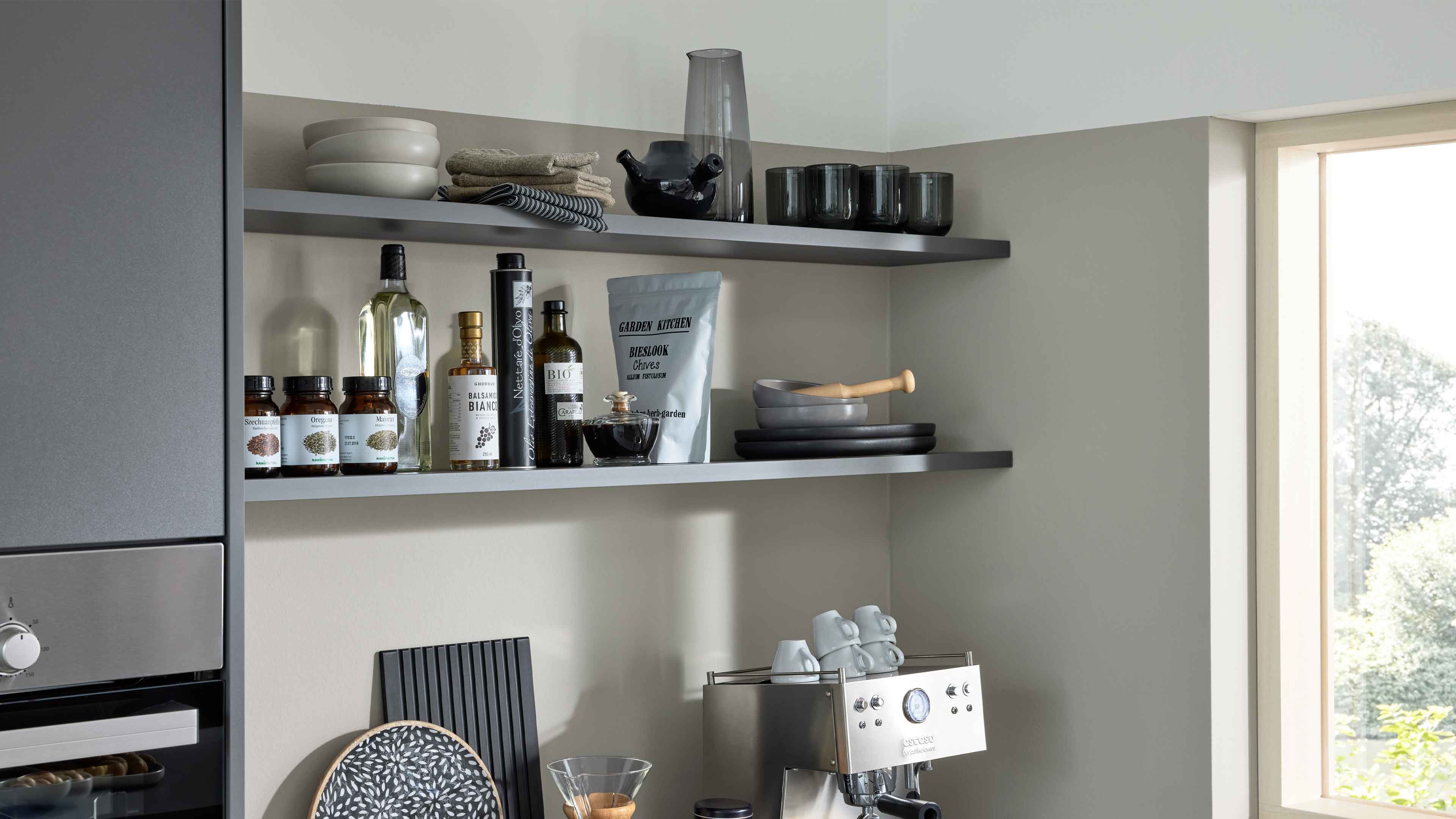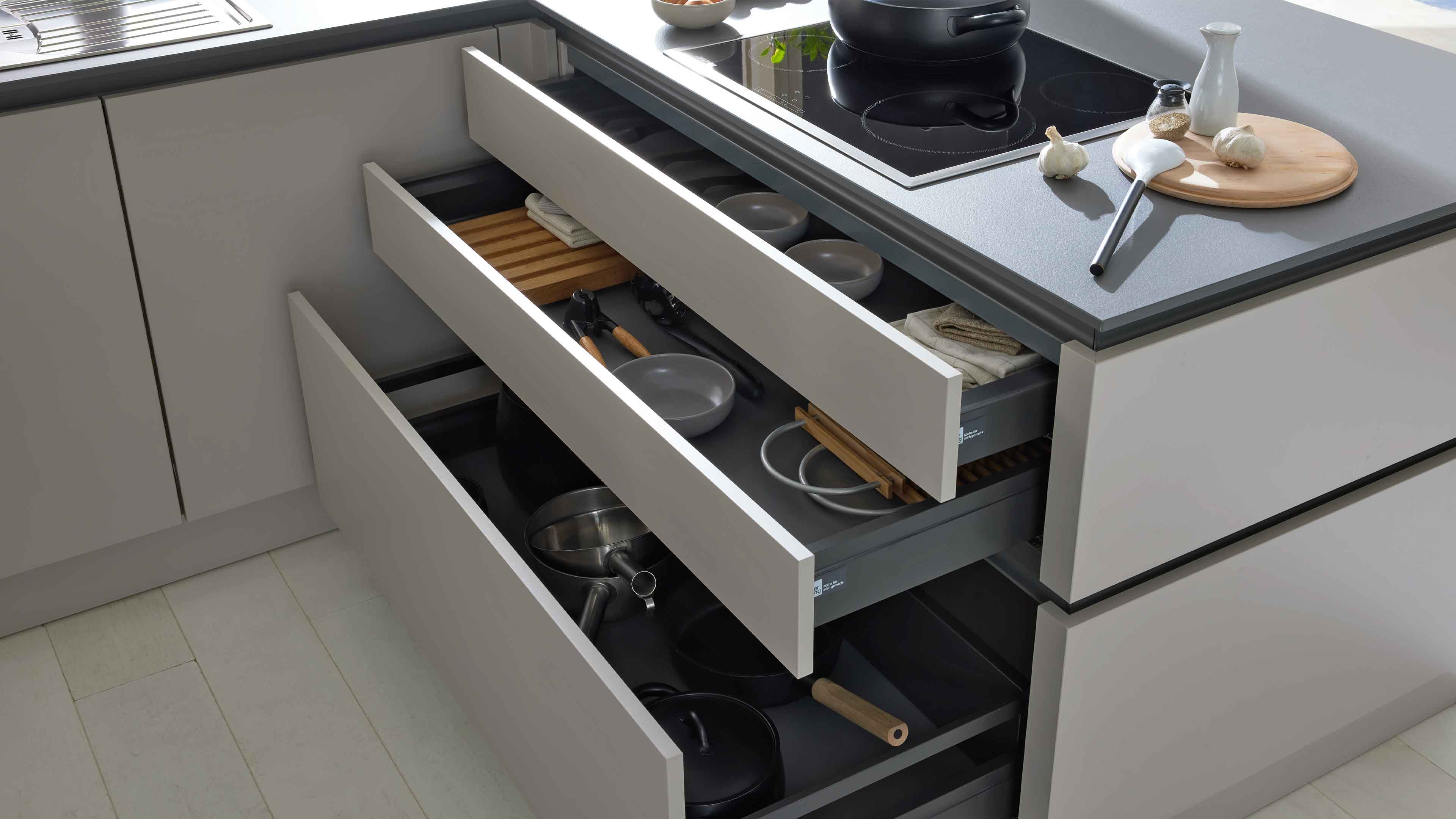 Interliving Küche Serie 3060 – elegante Systemküche in Sahara und Quarzgrau